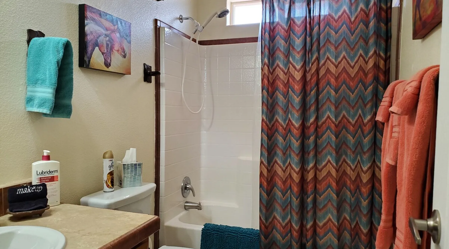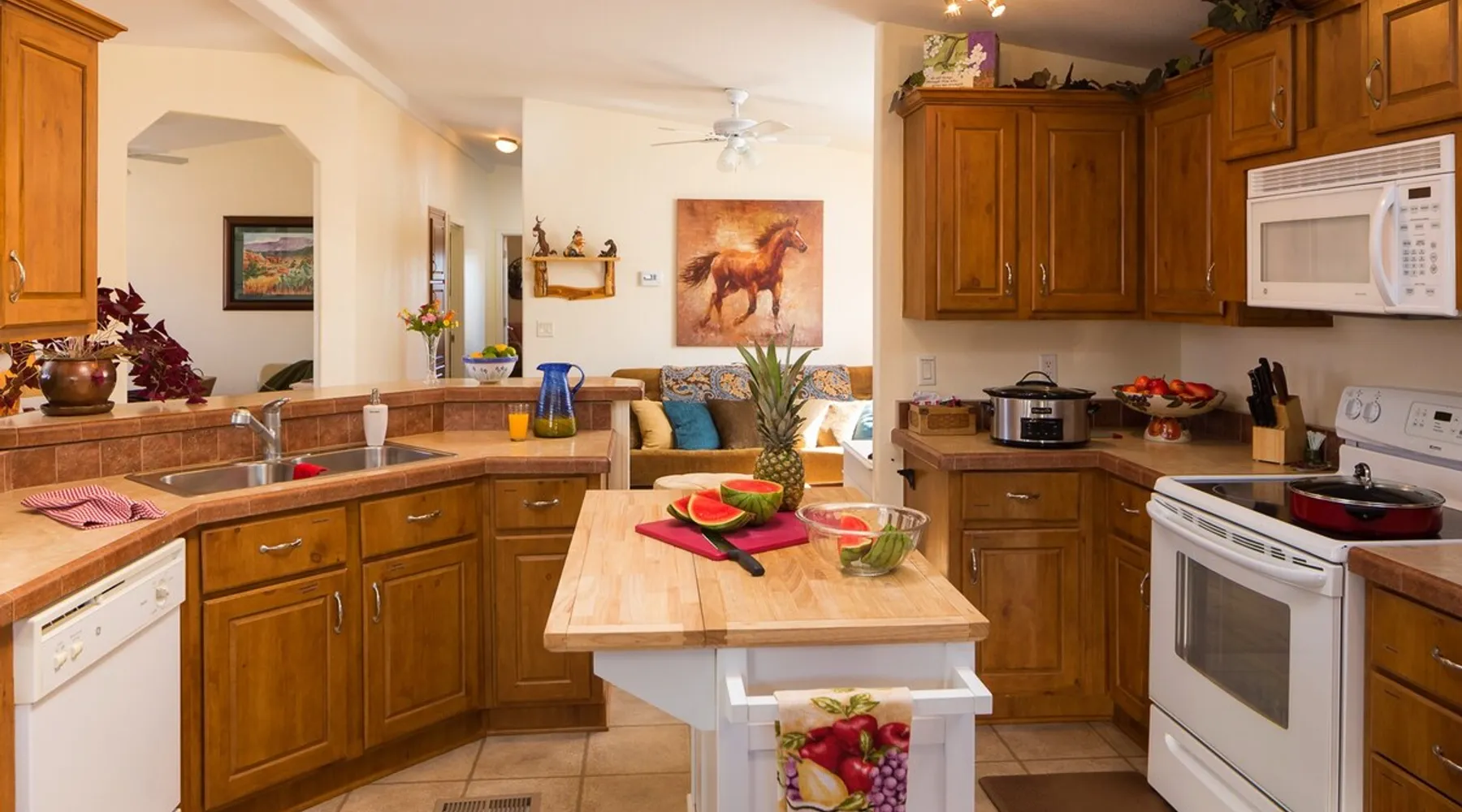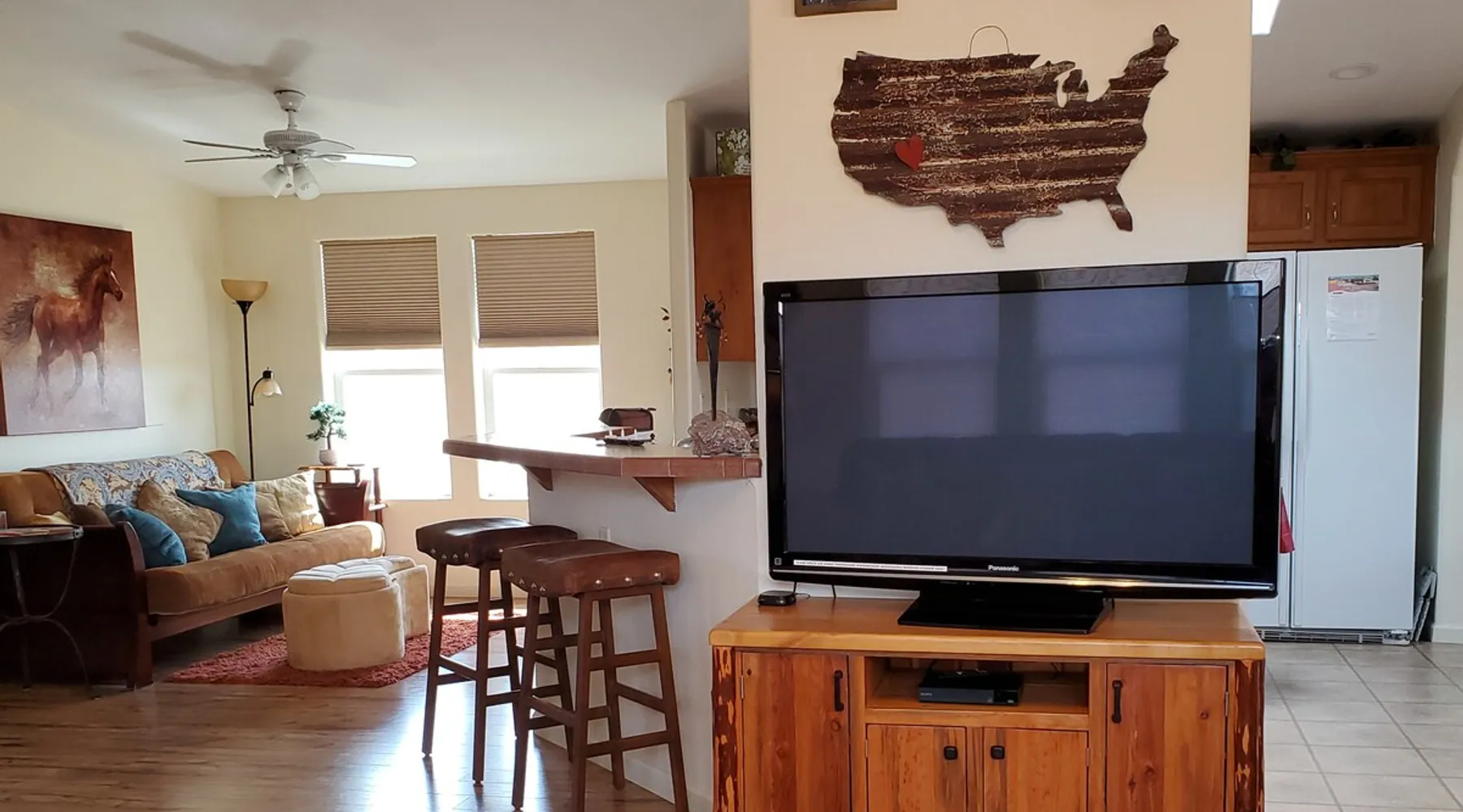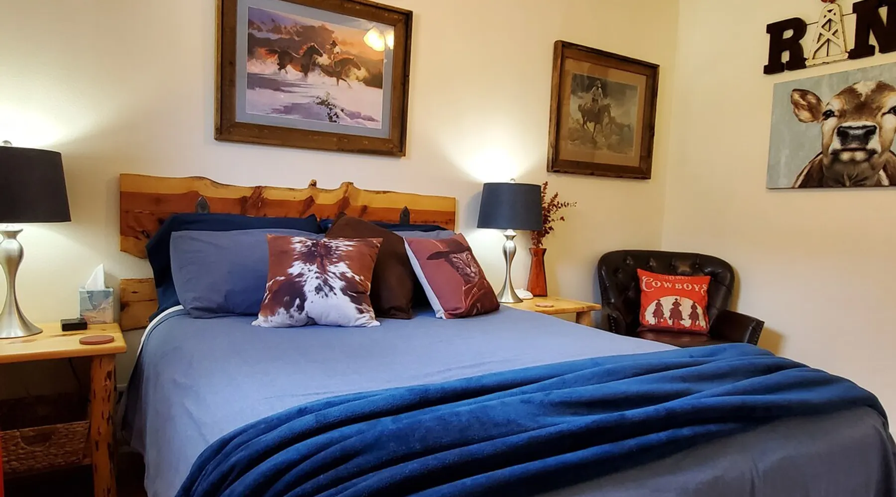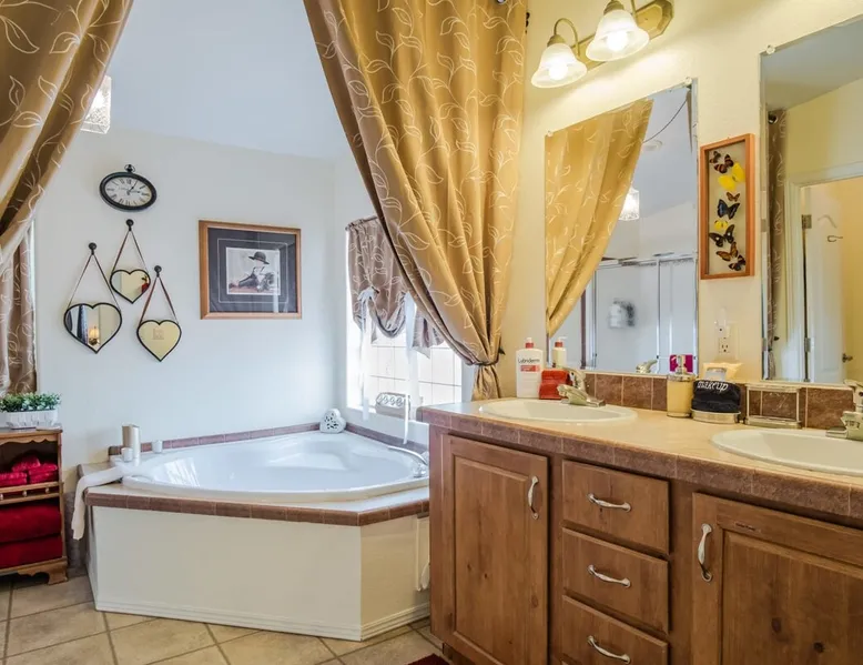 Our goal is for you to say, This is the BEST vacation rental ever! We want you to relax in comfort amid the art-filled, Western decor. Feel at home in the well-stocked, labeled kitchen & baths cleaned w/scent free products. Stay connected w/fast 1GB wifi. Drink in the red rock views from the BBQ patio. Stargaze beside the fire in the PRIVATE, fully fenced back yard! Keep kids busy w/board games & outdoor activities. All in Kanab which has 2 grocery stores, 35 eateries, 2 theaters & fun nitelife Unit A of Zionab Vacation Homes features a tasteful and fun decor with many original works of art, custom-made furnishings and hand-forged ironwork crafted by the owner. We have tried to supply the home so that all you need in order to vacation comfortably is your clothing. Each unit enjoys it's own private, unshared outdoor space. Cleanliness has always been a priority, but since the Pandemic, we've taken extra measures to ensure you arrive to a clean, sanitized home that is safe and comfortable. In 2022, we switched our laundry soap to scent free and started using more natural, low scented cleaning products like vinegar and Simple Green. Zionab is a great place to enjoy a working vacation with a dedicated work space and fast, reliable 1GBPS fiber-optic internet. The roomy kitchen is well-stocked for cooking up your family's favorites. Besides the glasstop stove/oven combo and microwave, there is a large and mini crock pot, an electric griddle for pancakes and such, a food processor for quick prep, a blender for your frozen favorites and a dishwasher for quick clean-up. There's also a 12-cup drip coffee pot with a single cup option and an electric water pot for tea. As for cooking essentials, Zionab provides a more than adequate supply of pots, pans, lids and bowls to prepare most dishes, along with a nice array of spices and staples like flour, sugars, oils and condiments. We have outfitted the house with indoor games, puzzles and quick crafts. For outdoor fun, there's corn hole and yard darts, a basketball hoop, soccer and footballs, and frisbees that can be enjoyed on site or across the street at the Ranchos City Park. Zionab has a huge outdoor fire-pit complete marshmallow roasters for S'mores. When you are ready to chill, our HUGE flat screen TV with ROKU streams dozens of channels. We offer Amazon Prime as well as a variety of DVD's and an HDMI cable connection for entertainment streamed from your device through the fast 1GBps fiber optic WIFI. There's also Red Box Rentals at both of the nearby grocery stores for newer releases. At day's end you can soothe those tired muscles in a hot, soaking bath in the Master Suite's garden tub outfitted with complimentary bath salts. The 50 gallon, quick-recovery water heater will ensure everyone has plenty of hot water to bathe before bed. Speaking of bed, the Master Suite features a gorgeous king-sized poster bed with a luxurious pillow top mattress piled hight with tons of pillows and invitingly crisp, clean sheets. Cellular shades and black-out curtains make sleeping-in so inviting. The Master bedroom is decorated in a romantic shabby chic decor that is full of soft, inviting textures that make you feel oh so pampered. Enjoy the cozy, mood setting electric fireplace as you wind down from your adventure filled day. The second bedroom is all horses and cowboys with denim and cowhide. The semi-firm, queen-size Serta pillow-top mattress is piled high with pillows and cozy bedding. The headboard is crafted of Juniper wood made from a tree that shaded a livestock shipping corral in it's former life. Blackout curtains and cellular shades close the world out to let you dream peacefully. A comfortable chair makes a great reading nook or spot to relax while you post pictures of the day's adventures. The Cowboy room features double closets with plenty of space to store luggage. This bedroom is located adjacent to the roomy guest bathroom which features a tub/shower combo. The third bedroom, the Cactus Room, features artwork of desert landscapes. It has two twin beds that can convert to a king size bed for added flexibility in accommodating couples. A large, comfortable chair provides a cozy spot for catching up on your social media. Luggage racks and a sizeable dresser help you stay organized. The fourth sleeping option is a futon couch that converts to a double bed located in the office area off to the side of the living room and kitchen. This sunny spot is perfect for enjoying your morning coffee or an afternoon nap. The office area includes a desk that is outfitted with a charging station, a complimentary laptop and our insider's guide to Kanab and the surrounding area. You are sure to enjoy Zionab's fiber optic internet speed of 1GBps - a rarity for a small town like Kanab. The West facing dining room seats eight and provides gorgeous views of the red rocks and lush green surroundings. A separate breakfast bar has seating for two. The back patio has a bistro table that seats two. Further out in the backyard by the outdoor fire pit is a picnic table that seats 6. It's the perfect area for singing campfire songs and roasting marshmallows or just soaking in the amazing red rock views. If you prefer to dine out, downtown Kanab is just 2 miles away and offers 35 eateries (of which only 4 are franchises). Zionab has central air conditioning and heat with ceiling fans in every room. There is an extra large washer and dryer for your convenience. Need to stretch your legs? Zionab is conveniently located across from a grassy, tree filled city park which offers the perfect place for travelers to stretch after being cramped in a car all day. Take a leisurely stroll around the 1/2 mile track, enjoy a heart pumping game of soccer, throw some Frisbee or fly a kite - all using the equipment available in Zionab's toy box. Prefer relaxing? Then you can enjoy the views of contrasting crimson red and verdant green scenery while you do some grilling on Zionab's private back pa