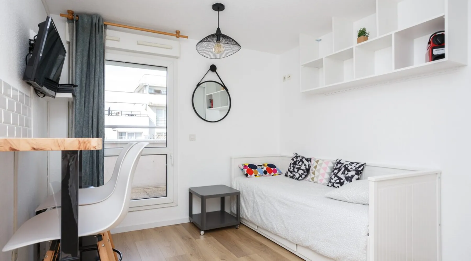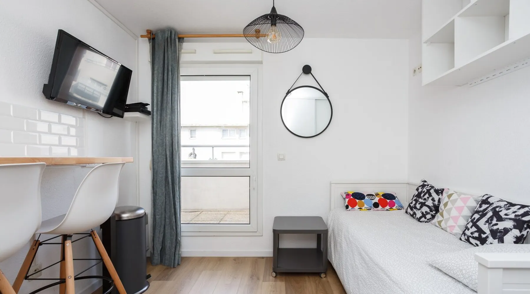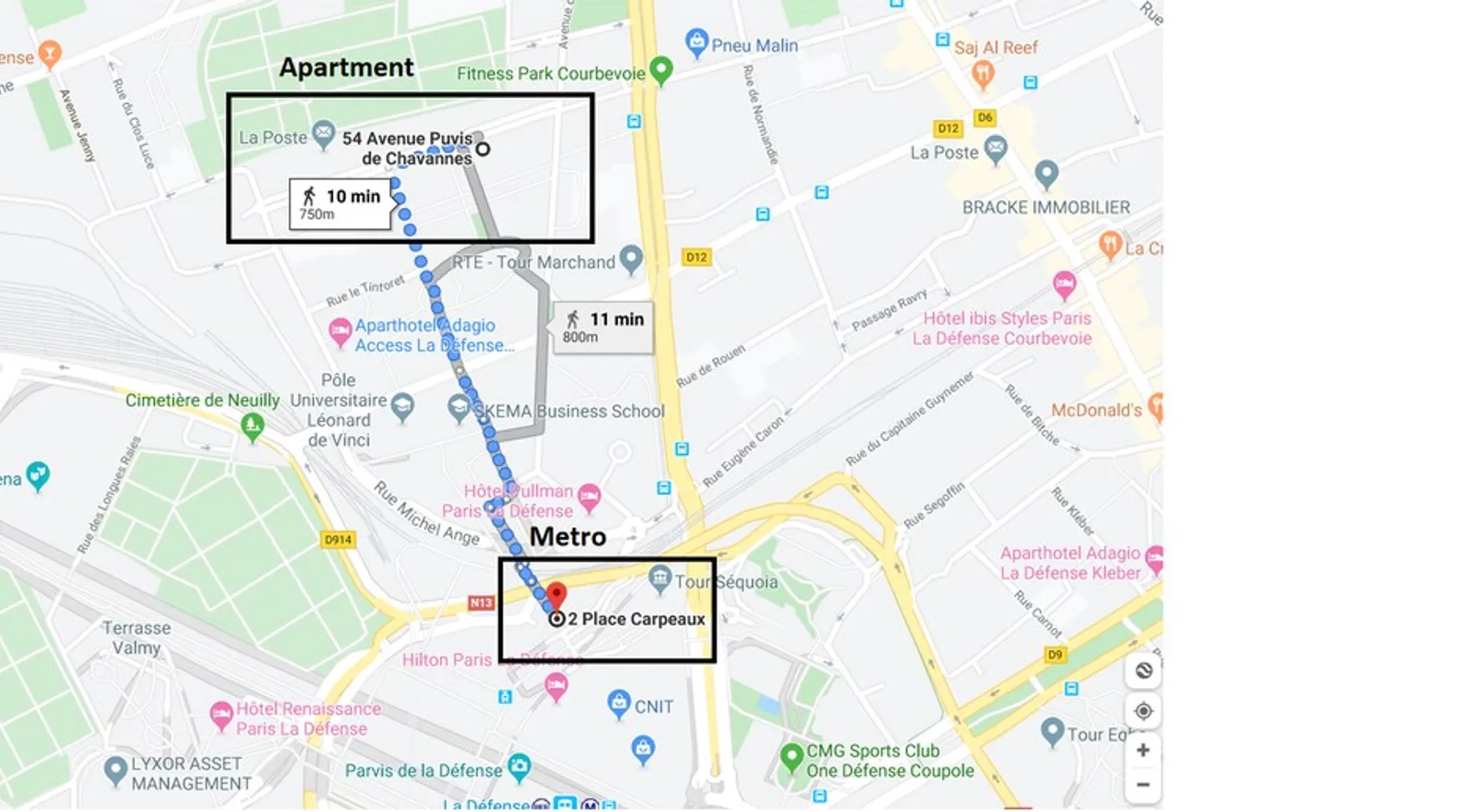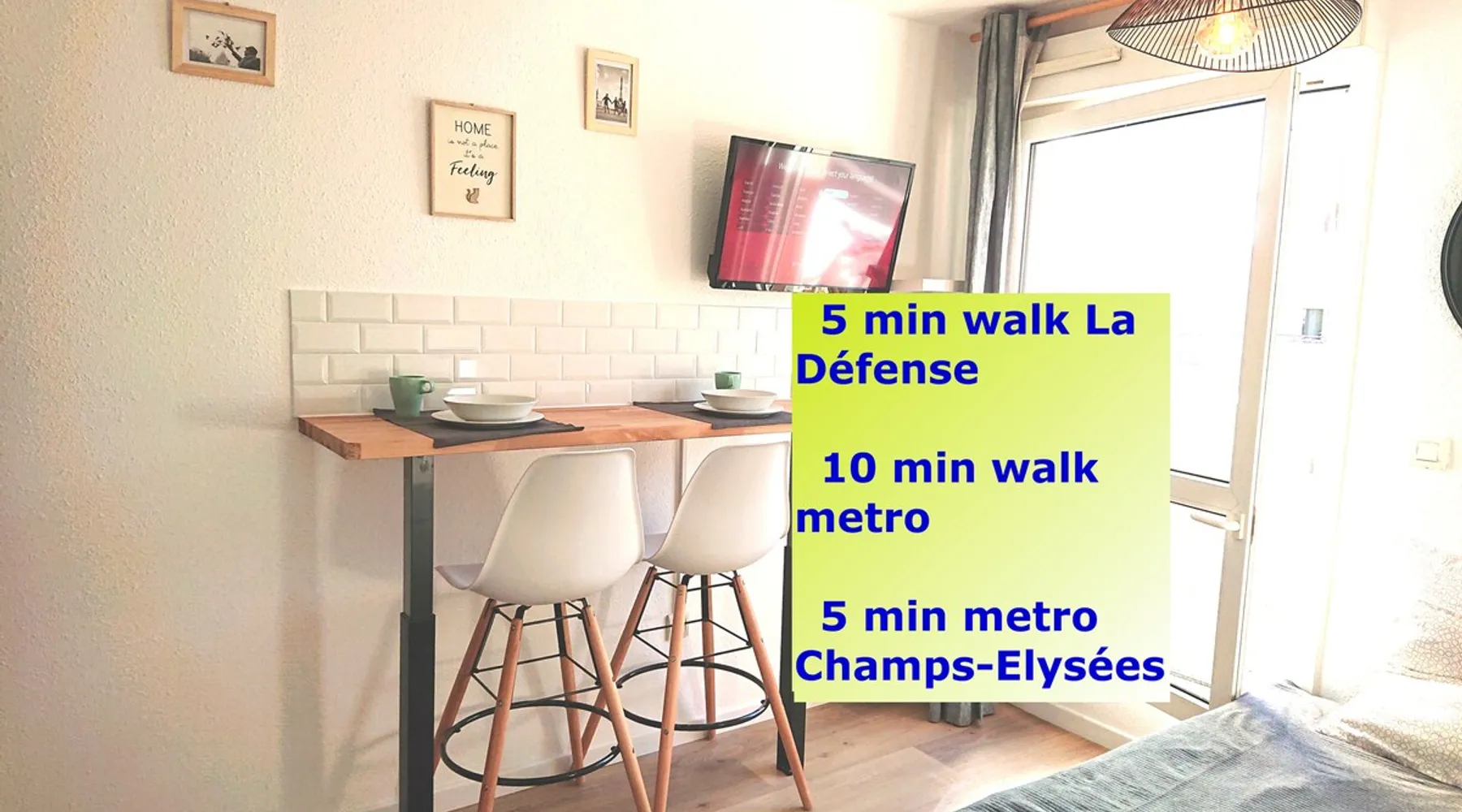 - In a modern building with a balcony . - Within 10 min walk : the métro station "La Défense-Grande Arche", shopping mall "4 Temps", CNIT, pharmacy, cinema, McDonald's, restaurants. - Close to main attractions of Paris: "Champs Elysées" 5 mins away by metro. - Safe and quiet area, two green parks just under the building. -Wi-Fi -TV: 220+ channels with different languages -Fridge -Washing machine -Microwave -Cafétière nespresso The space - Payed parking available: please refer the description of "the quarter"(after the comments, above the map) of the announcement. - I don't charge for cleaning fee, so please keep the apartment clean in exchange, or I can order you a cleaning service for 40 Euro - Special cleaning procedure has been done by the cleaning lady for the covid during this period. Measures 20 m² , quiet, bright. The following are provided: - Clean dishes, kitchen utensils. - Clean sheets, quilts, shampoo, soap, shower gels - Clothing iron - A fitness room (free of charge) available in the building. Guest access You can enter the premises with a lockbox. you can enter the studio by a code. Parkings are available at doorstep around 15 euro per day, can be booked on the website "Parclick"; or on the street under the building, charged in hours by timestamp (the street parking is free of charge during the holidays, weekends and during the night from 19h to 9h on workdays). Registration Details Available with a mobility lease only ("bail mobilité")