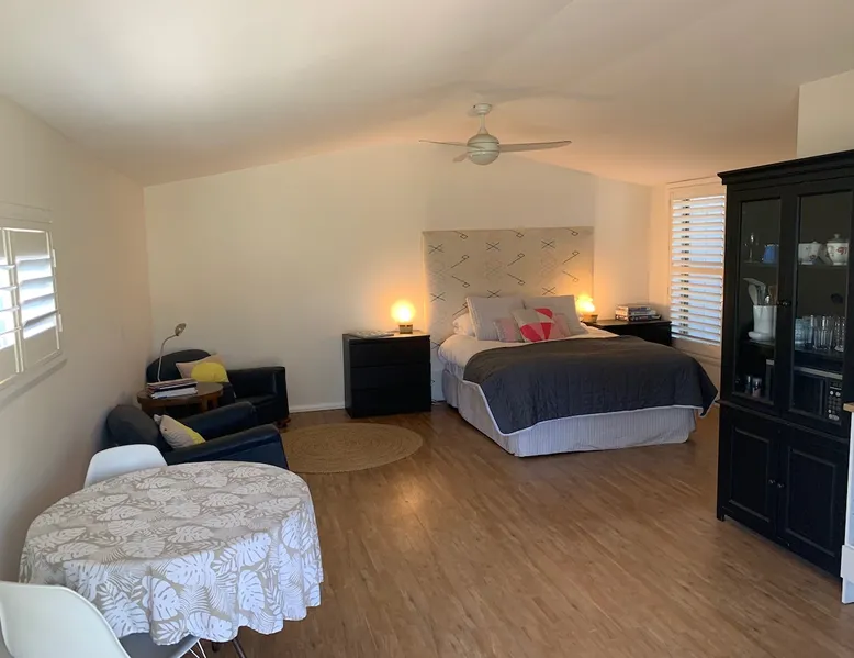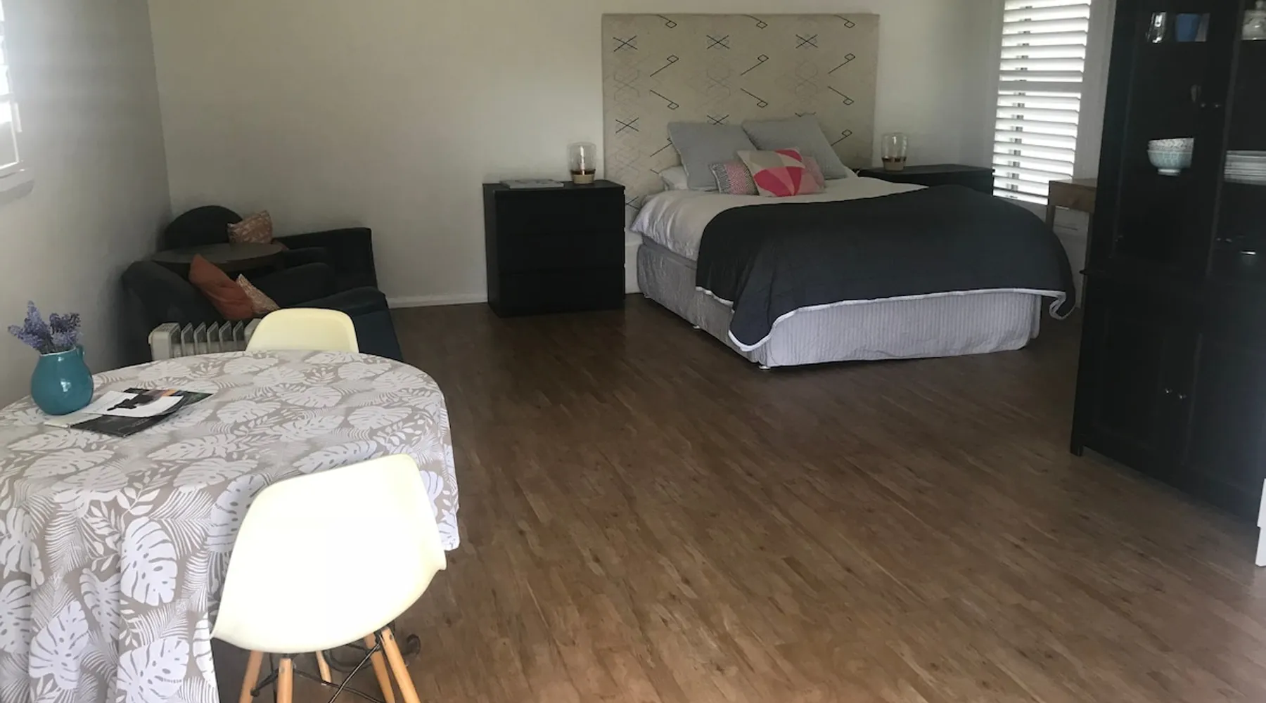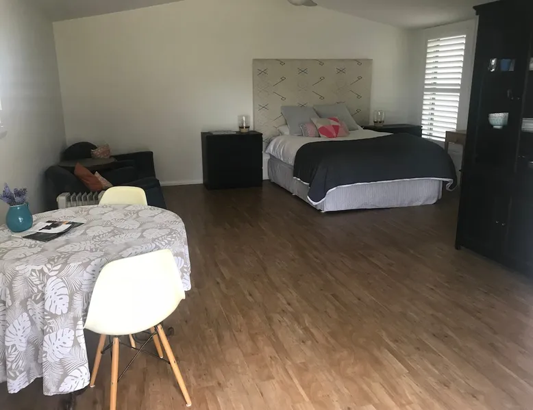 Experience beautiful Orange in the peace and quiet of a farm setting a short drive from town. Our lovely guest house is situated on the edge of our garden, with it's own entrance and is separate to our house. With a bathroom, small kitchenette, queen bed and lovely patio over looking our vegetable garden and paddocks. Quality bedding and towels are provided. It's a short walk to ChaLou winery, as well as Mayfield Winery just down the road. The space Our lovely studio guest house on our farm is sure to be the perfect country getaway. Guests have access to our veggie garden (note, veggies vary season to season), chooks (again, seasons determine their laying rate) and farm. It is situated in our garden next to our house, but you have total privacy. Guest access The garden and farm paddocks Registration Details PID-STRA-26097