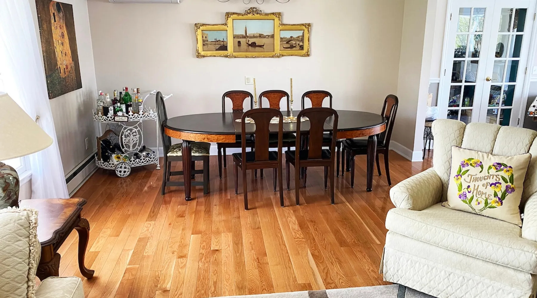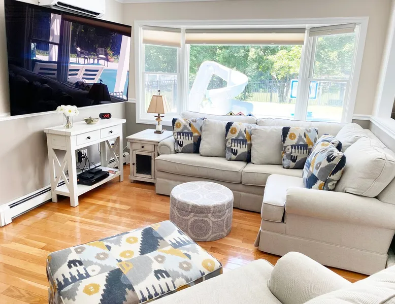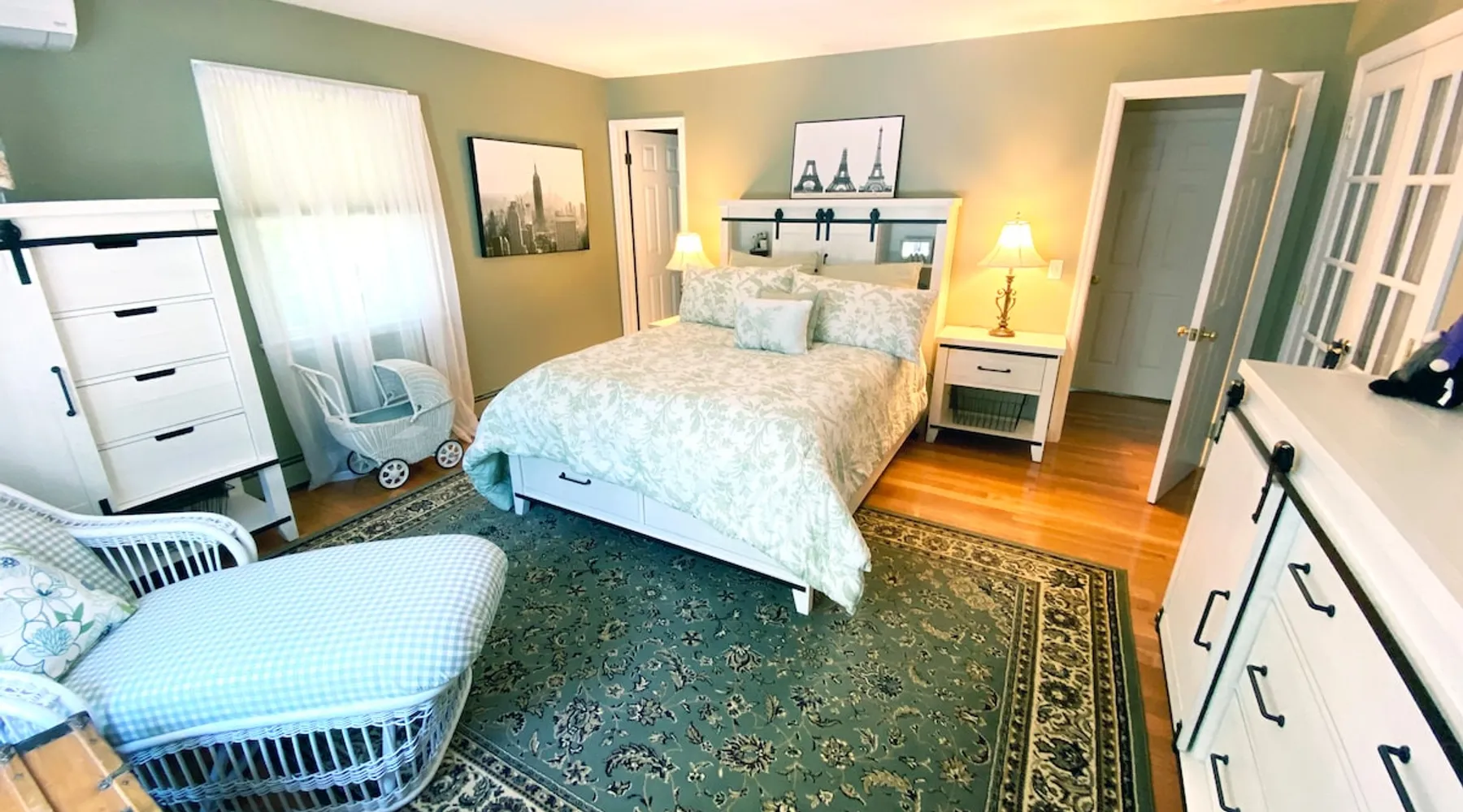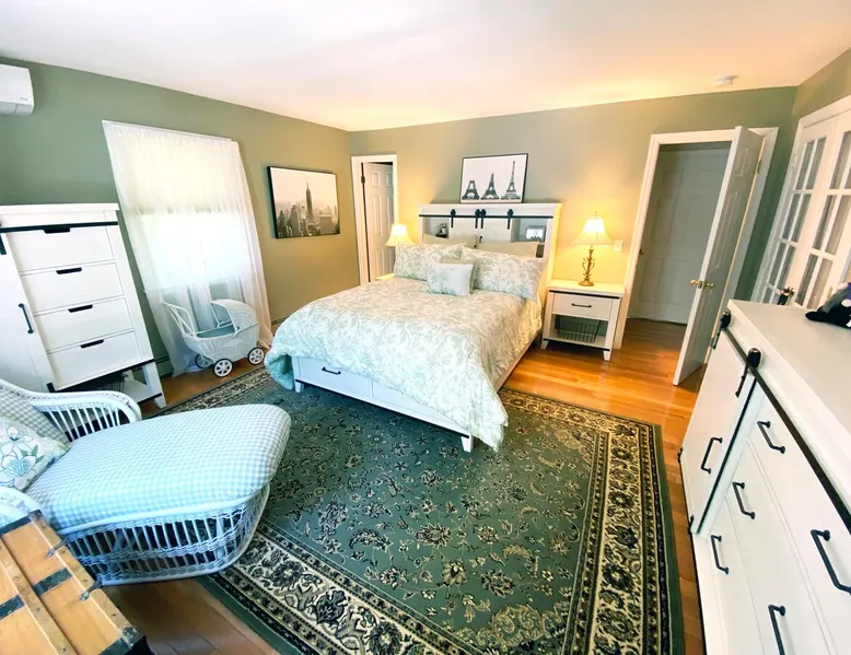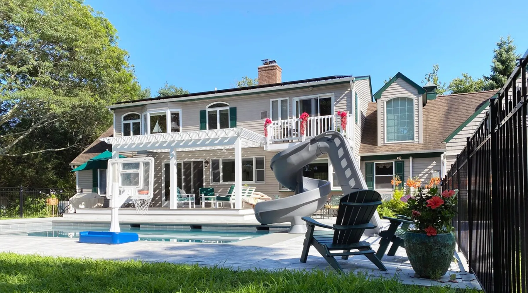 We bought our wonderful house six years ago and have made many important renovations. We just added a combination bocce ball court and putting green, right next to the amazing new gunite, inground, solar-heated, salt-water swimming pool with hot tub, helical slide and basketball hoop. They are built and ready for fun. The gravel driveway is now paved with asphalt and has two additional parking spaces. The space We are constantly making improvements to the property. Last year we rebuilt the back deck and pergola. We added a solar-heated swimming pool and spa. We upgraded the guest bathroom with a mural. We replaced the furniture in bedroom #3 with a gorgeous modern set and we updated the electric trains in the playroom. Some of the previous upgrades include solar power, full house air conditioning, a brand new master bed/bath, new decks in the front and back, a rear deck pergola, new rear deck furniture, new window shades throughout the house, central vacuum, a new panoramic kitchen window and door, a new Celestron telescope, a new Bosch dishwasher, major upgrades to the goldfish/koi pond, a new second floor washer/dryer, a newly tiled Jack & Jill bathroom, a 220V Tesla charger and 110V outlets for electric car charging in the garage. Three years ago we added a new 3-bed raised vegetable and flower garden. You'll be able to pick a fresh tomato or zucchini for your salad. We also finished painting the front porch, rear deck, pergola and swing. Then we removed two kitchen cabinets and the window to create the space for a gigantic panoramic window and door. The view from the kitchen is now breathtaking. Last year's improvements were the addition of a panoramic bay window in the TV room. We now have a wall of glass to view the backyard and the creek. We also rebuilt the gazebo and screened it in with a new roof and new railing. The new Celestron telescope is installed and operational. It's powerful and robotic, but fragile and complicated. It can be controlled from the TV room and viewable on the TV. If you want to use the telescope, you will have to hire a professional to spend the evening with you (by Zoom conference) and teach you and your children the use of the telescope and all of the features of the night sky. (I'll supply name, phone, email, rates, etc.) How cool will it be to see craters on the moon or the rings of Saturn or a distant galaxy? Our house has some very unique characteristics. It is very large, with two master bedrooms, equally wonderful, but different. The first one has a new bathroom with a large multi-directional spray shower and a double sink that rests on an 1880 French dresser. The second master bedroom has a beautiful sitting area and large bathroom with a combination tub/shower and a personal dressing table. The swimming pool is the hub of activity in the backyard. The kids will use the helical slide again and again and the basketball hoop is great fun. The side yards are big and good for children to run around and play while you BBQ out back or sip a cocktail on the deck or in the heated spa. You also have free use of the canoe. Downstairs there are two bedrooms, each with separate full baths, one being a newly tiled Jack and Jill connecting bathroom. One bedroom has a regular-sized crib, a portacrib and a pack-n-play. There is plenty of closet space as well. Upstairs also includes an office with a view of the creek. It has a convertible sofa, which I didn't list as a fifth bedroom, but could function as one. Some of the more unique features are a library with a spiral staircase, that leads to a large children’s playroom above the garage (which includes a wonderful set of Lionel electric trains and a dollhouse). Adjacent to the library is a TV room with comfy chairs and a set of barbell weights from 5 lbs to 25 lbs. The eat-in kitchen has all the standard and luxury amenities, including a new gas range, a new Bosch dishwasher, a microwave, a blender and a Keurig machine. There are very few bugs and mosquitoes (not none, but few). We sit on the back deck, with a glass of wine, until the sun goes down and don’t need bug spray. And we just added an outdoor ceiling fan that is very refreshing while blowing any bugs away. There's also a covered, two-seat swing next to the creek; a good spot to watch the ducks, swans and geese swim by. When it's quiet, you'll see deer and wild turkeys visit the property. The house is special and mainly for our family’s use, so we ask you to take good care of it. It's on a very quiet residential street, with very few cars. You'll be right in the middle of wine and farm country and right next to Greenport. The Orient Point Ferry to Connecticut is only 19 minutes away (possible day trips include a visit to Mohegan Sun). The south fork of Long Island is a hop and a skip away via Shelter Island ferries.