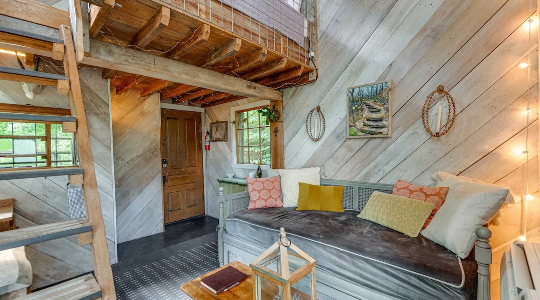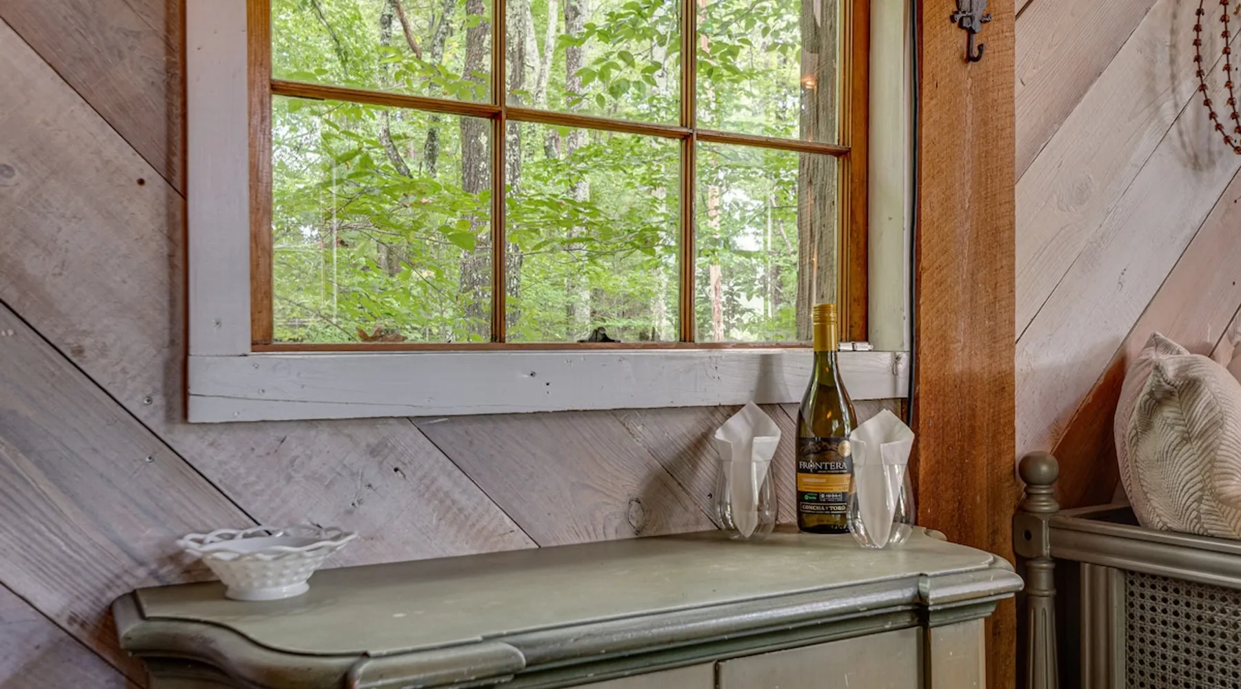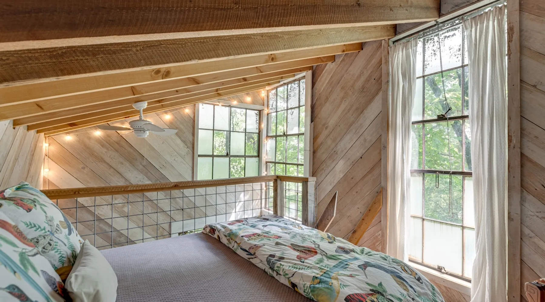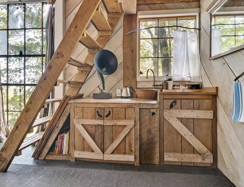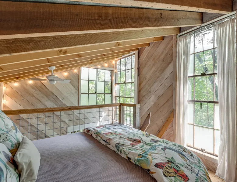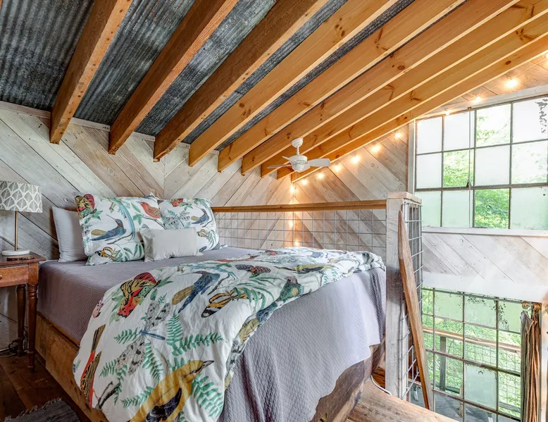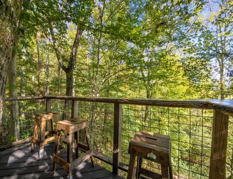 This rustic and refined treehouse provides a comfortable treetop retreat. Part glamping, part boutique hotel, your climate controlled hideaway is complete with a bathroom and kitchenette up in the trees. The space Arriving at the treehouse, you are greeted with ambiance, wine, and a floor to ceiling view of the valley below. The interior features reclaimed barn wood and beams alongside a tasteful collection of furnishings including a vintage style gramophone speaker, a couch that converts to sleep two extra visitors, a bathroom featuring exposed copper piping with a penny floor, and a kitchenette stocked with complimentary drinks and snacks. Spend the evening sipping wine among the trees on the bar-top deck after enjoying the excellent dining, entertainment, and outdoor activities in nearby Chattanooga. The hotel quality bed in the roomy loft is the perfect vantage point to watch the sun rise over the misty valley. The short walk back to your car brings you past a mountain spring and huge boulders in the serene woods. At the base of the treehouse a fire pit is ready (s'mores kit provided) and the trail continues deeper into the woods to a bench overlooking the mountain stream. Your adventure awaits! Other things to note If you notify us of your intent to cancel prior to the lapse of the free cancellation period, we will return 97% of your payment. The other 3% will already have been collected by the credit card processing company, and we have no way to return that portion of the payment.
