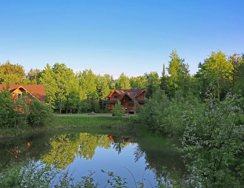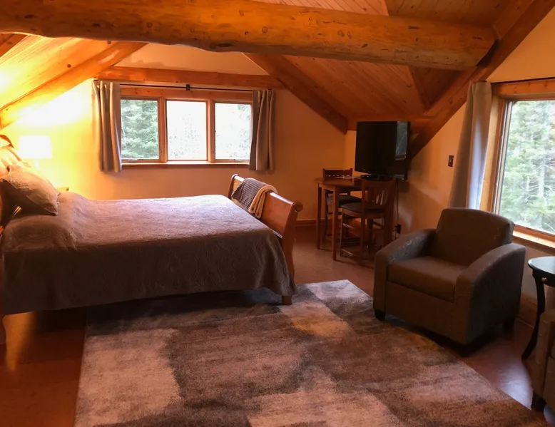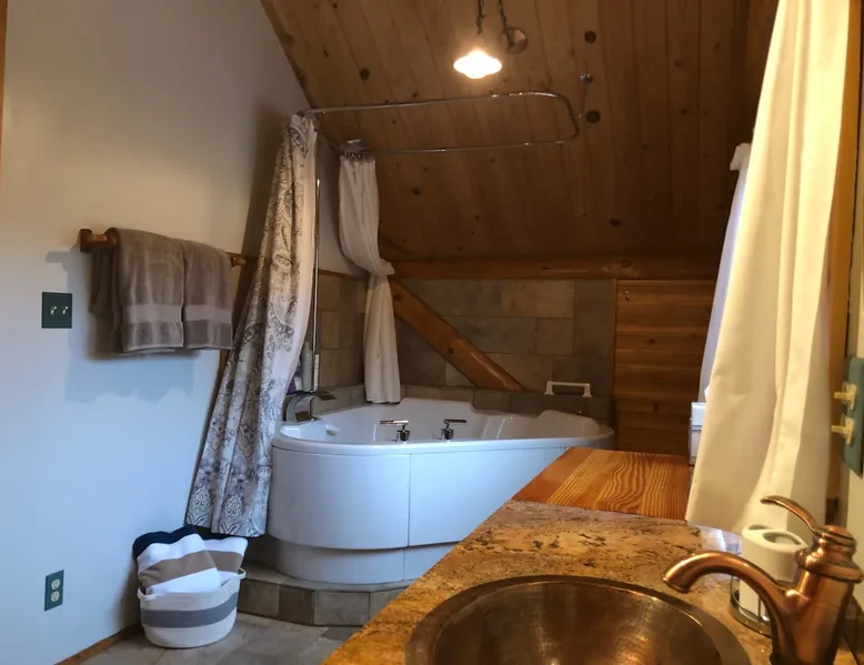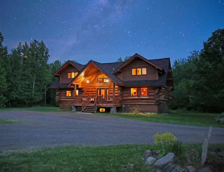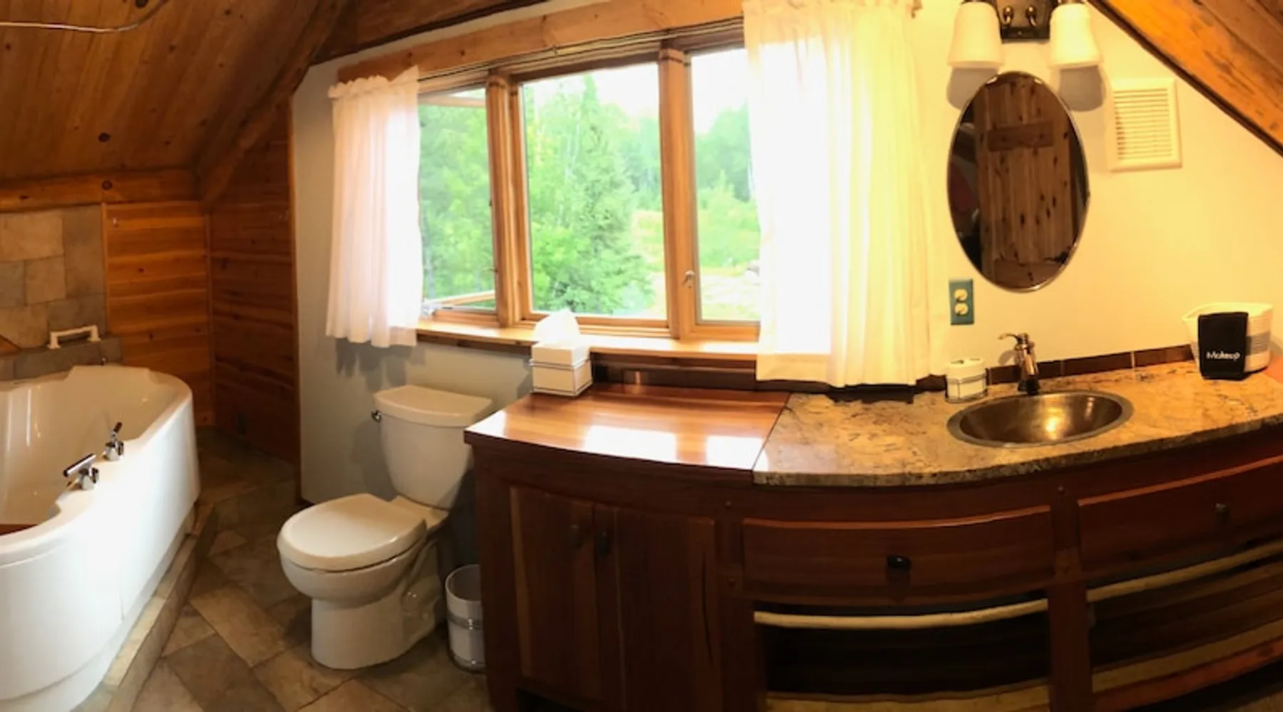 Superior Gateway Lodge's spacious Birch Suite has beautiful log beams and a leather-accented king sleigh bed for a very restful sleep. There are 2 sitting chairs, a pub table, and a romantic 2-person jacuzzi tub with shower for your complete comfort & relaxation. Experience all the North Shore offers, then come enjoy a fully equipped kitchen, relax in the living room with its awesome lakestone fireplace or enjoy our massive deck & cabana. Please note children under 13 or pets are not allowed. The Lodge is simply stunning, built with over 80 hand-hewn, locally sourced Pines and a matching garage to boot! Our 40 acres is a small sample of the majestic northern woods. We have a small pond with a fire pit to enjoy the night sky and roast marshmallows. For winter guests we’re <1 mile from a CJ Ramstad/North Shore State Trail entrance! We have lots of future plans for walking trails along an existing 1/2 mile access road to the back acreage so check back soon. We'll email you prior to your stay and include the passcode to enter the main door to the lodge. Inside you will have a welcome pack and your key to your room will be on the key rack behind the door. Owners, Beth and Jeff will be available should you need them as they reside in the basement level of the lodge. Should you need anything we will be there to help. The new guest loft is also available and can accommodate up to 4 guests. We also host our daughters' 2 cats at different times of the year. They will be in the basement level with us and will not be in the main areas for your stay. We are 8 miles West of Two Harbors and the temperature can differ as much as 10-15 degrees warmer off the lake. There can be fog in Tow Harbors and sun at the lodge as our elevation rises quickly even 250 ft from one end of our 40 acres to the other. Although you’ll need a vehicle to get here, once here you’ll want a mountain bike, hiking boots and snowshoes! Self-Serve Continental breakfast offered.