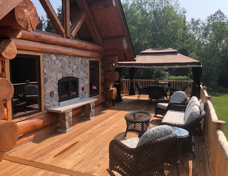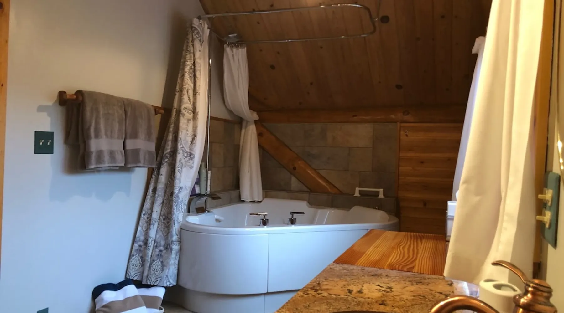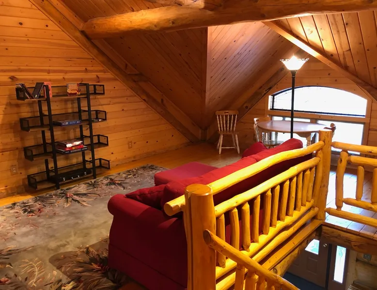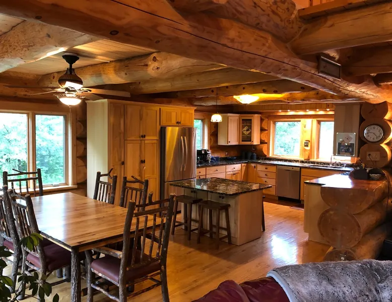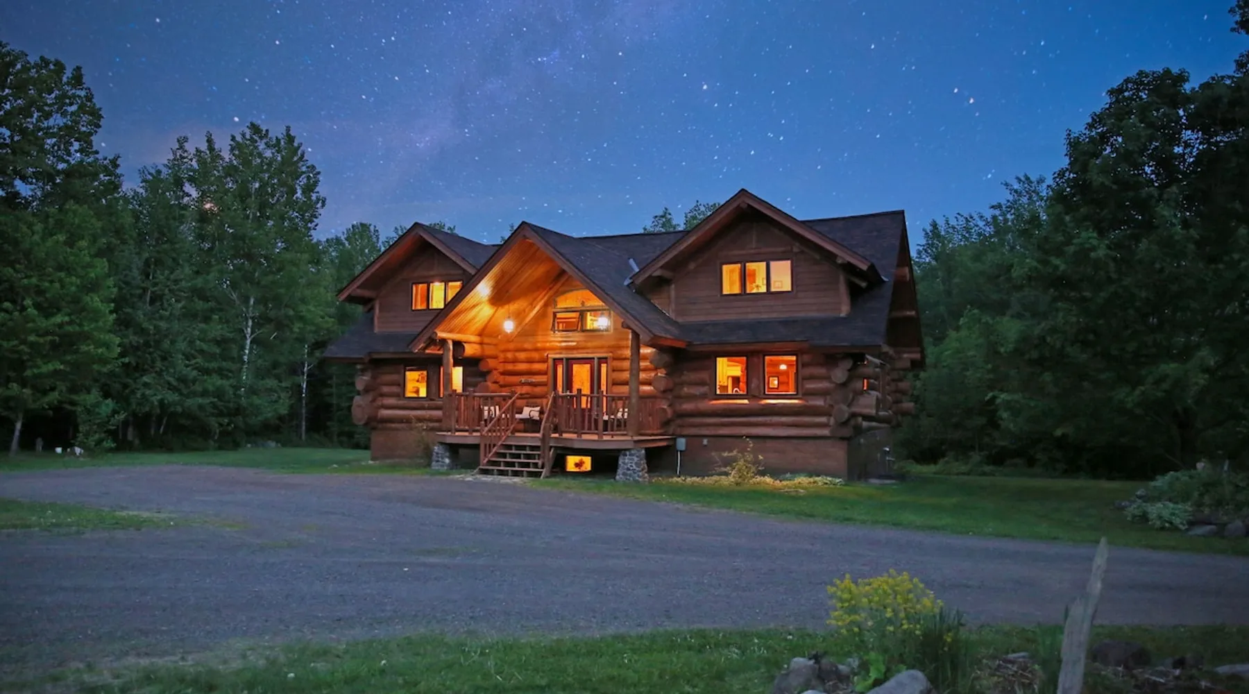 Superior Gateway Lodge's spacious Birch Suite has beautiful log beams and a leather-accented king sleigh bed for a very restful sleep. There are 2 sitting chairs, a pub table, and a romantic 2-person jacuzzi tub with shower for your complete comfort & relaxation. Experience all the North Shore offers, then come enjoy a fully equipped kitchen, relax in the living room with its awesome lakestone fireplace or enjoy our massive deck & cabana. Please note children under 13 or pets are not allowed. The Lodge is simply stunning, built with over 80 hand-hewn, locally sourced Pines and a matching garage to boot! Our 40 acres is a small sample of the majestic northern woods. We have a small pond with a fire pit to enjoy the night sky and roast marshmallows. For winter guests we’re <1 mile from a CJ Ramstad/North Shore State Trail entrance! We have lots of future plans for walking trails along an existing 1/2 mile access road to the back acreage so check back soon. We'll email you prior to your stay and include the passcode to enter the main door to the lodge. Inside you will have a welcome pack and your key to your room will be on the key rack behind the door. Owners, Beth and Jeff will be available should you need them as they reside in the basement level of the lodge. Should you need anything we will be there to help. The new guest loft is also available and can accommodate up to 4 guests. We also host our daughters' 2 cats at different times of the year. They will be in the basement level with us and will not be in the main areas for your stay. We are 8 miles West of Two Harbors and the temperature can differ as much as 10-15 degrees warmer off the lake. There can be fog in Tow Harbors and sun at the lodge as our elevation rises quickly even 250 ft from one end of our 40 acres to the other. Although you’ll need a vehicle to get here, once here you’ll want a mountain bike, hiking boots and snowshoes! Self-Serve Continental breakfast offered.