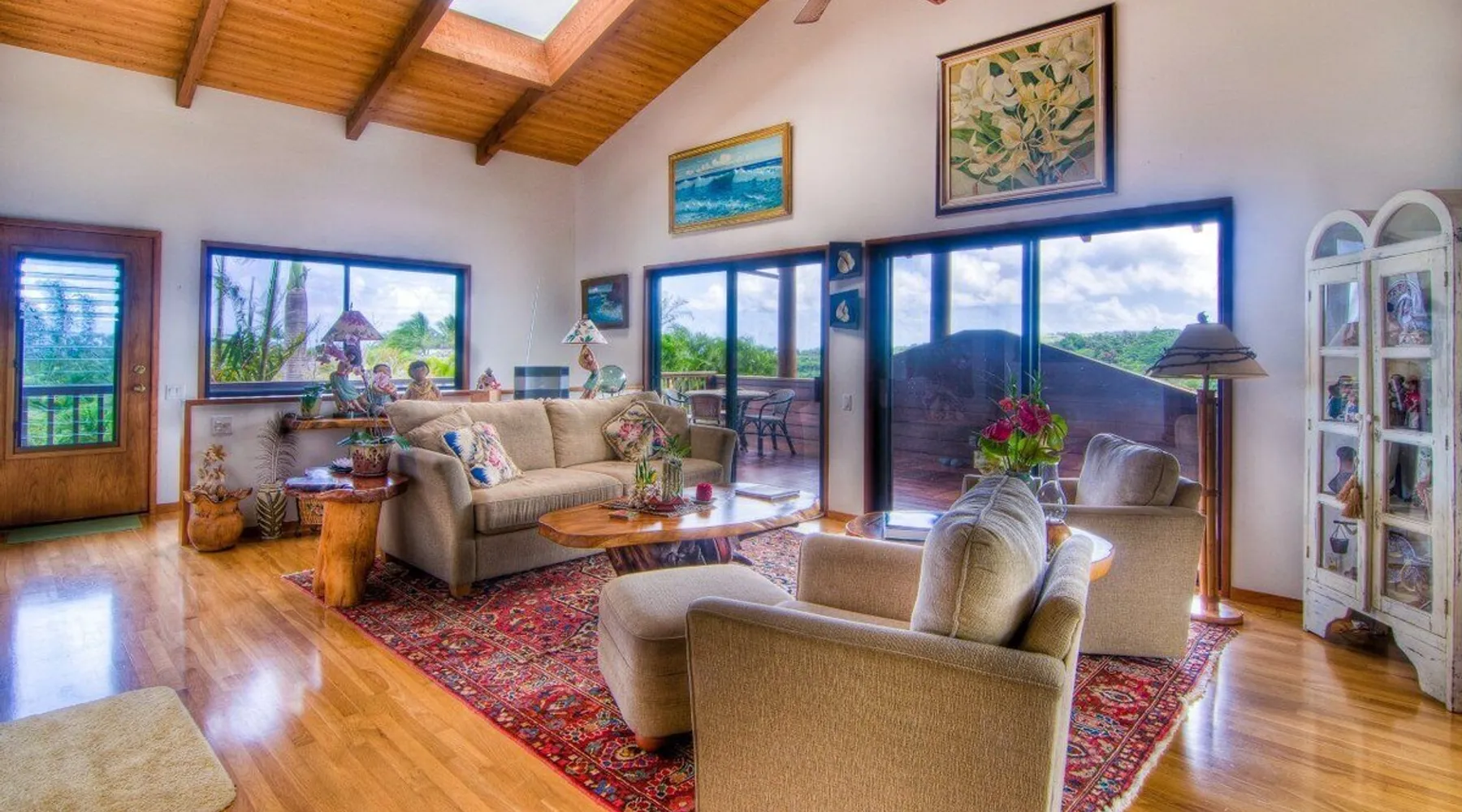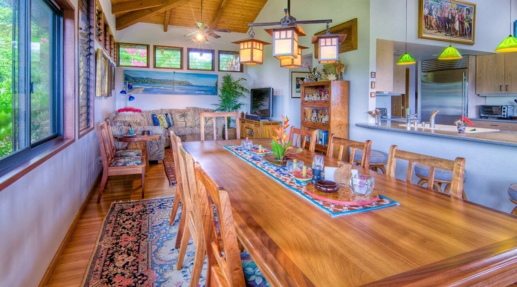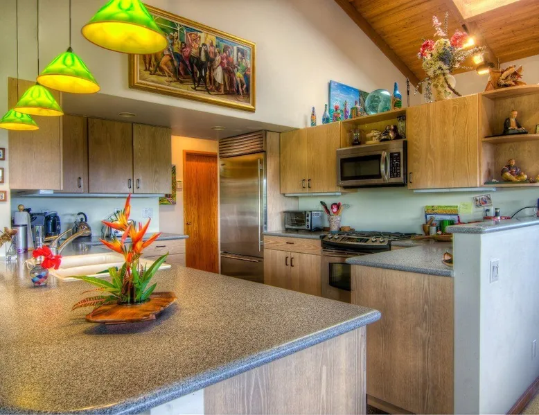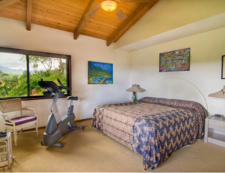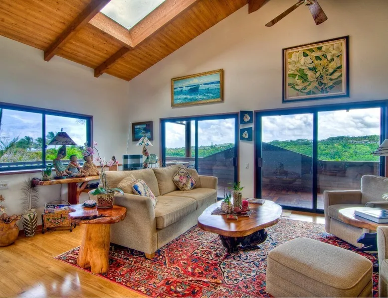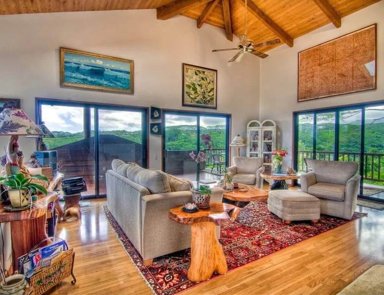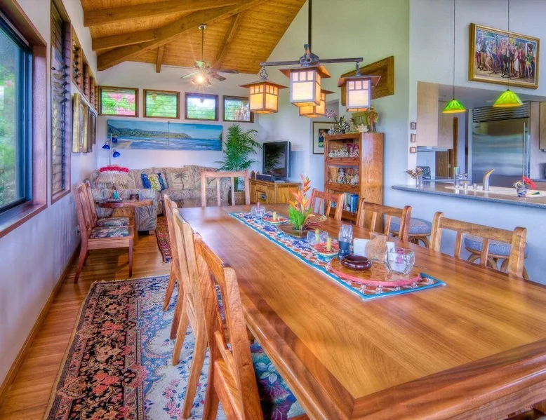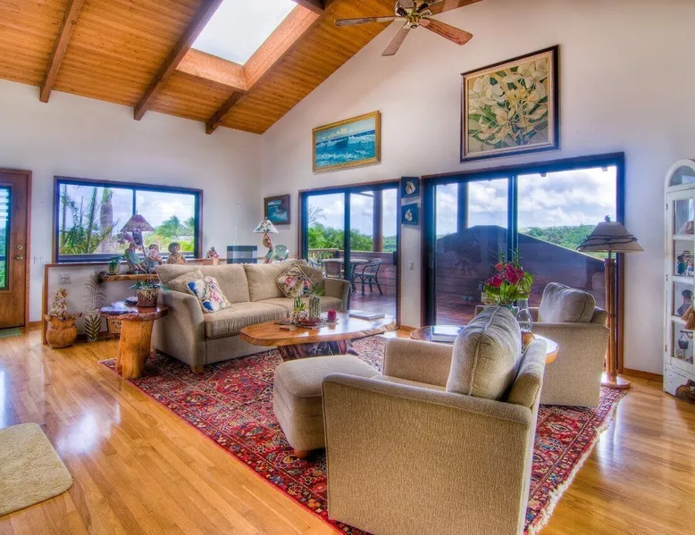 Ridge line home with pool, ocean and valley views One of the more sought after aspects of a vacation rental (or home for that matter) on Kauai is to be one of a kind; to have a view that can only be cherished by those privy to the specific angles and perspectives a particular property provides. Kumulani, perched on a ridge between Kalihiwai Bay and Anini Beach, is a perfect example. This 3,000 square foot home is a comfort zone in and out. Upstairs highlights include high ceilings, a spacious kitchen with wrapping granite countertops, an elegant dining area and a roomy living area. The master suite has a king bed, a spacious lanai and a charming Hawaiian chic decor. Downstairs, one bedroom features a king bed, the other has one double bed, and both have private baths and direct access to the pool and open lanai perfectly suited for a day (or days) of leisure. Located between the towns of Kilauea and Princeville, all the eating, shopping and fun-in-the-sun glory the North Shore has to offer is a short drive away, but when all of that is through, privacy and quiet are the last features of the day. Hawaii Life Rentals is a locally owned, licensed real estate company with rentals on Kauai, Maui, Oahu, and Hawaii. We offer on-island personal assistance and Concierge services. Disclosure: Full time residents (wife/husband) live in the guest house - Exterior security cameras in use Rates do not include taxes, cleaning and applicable fees. *This home is located in a Tsunami Evacuation Zone** TA-157-168-4352-01 SP 2012-9 TVNC 4227 Disclosure: Residents occupy the apartment located over the garage. Languages English