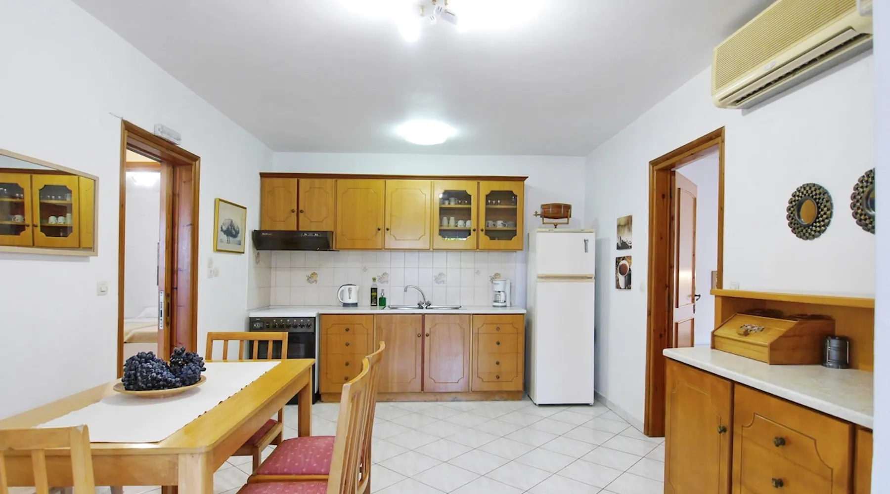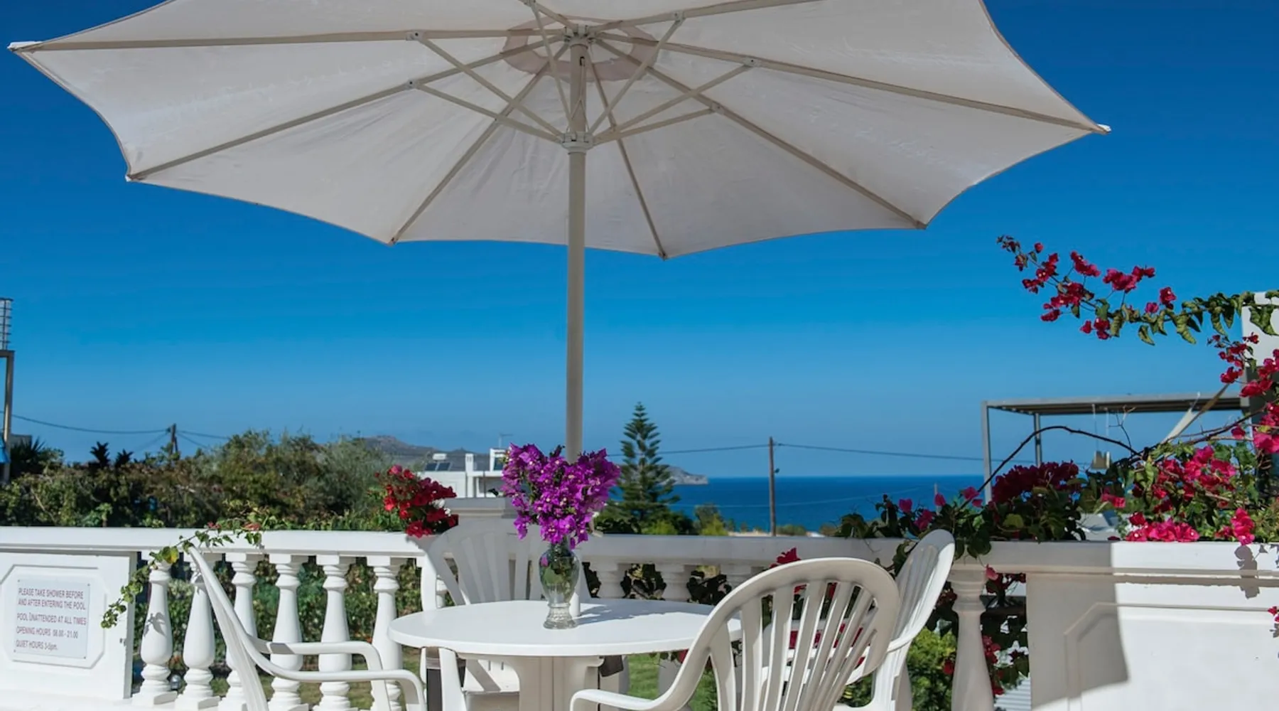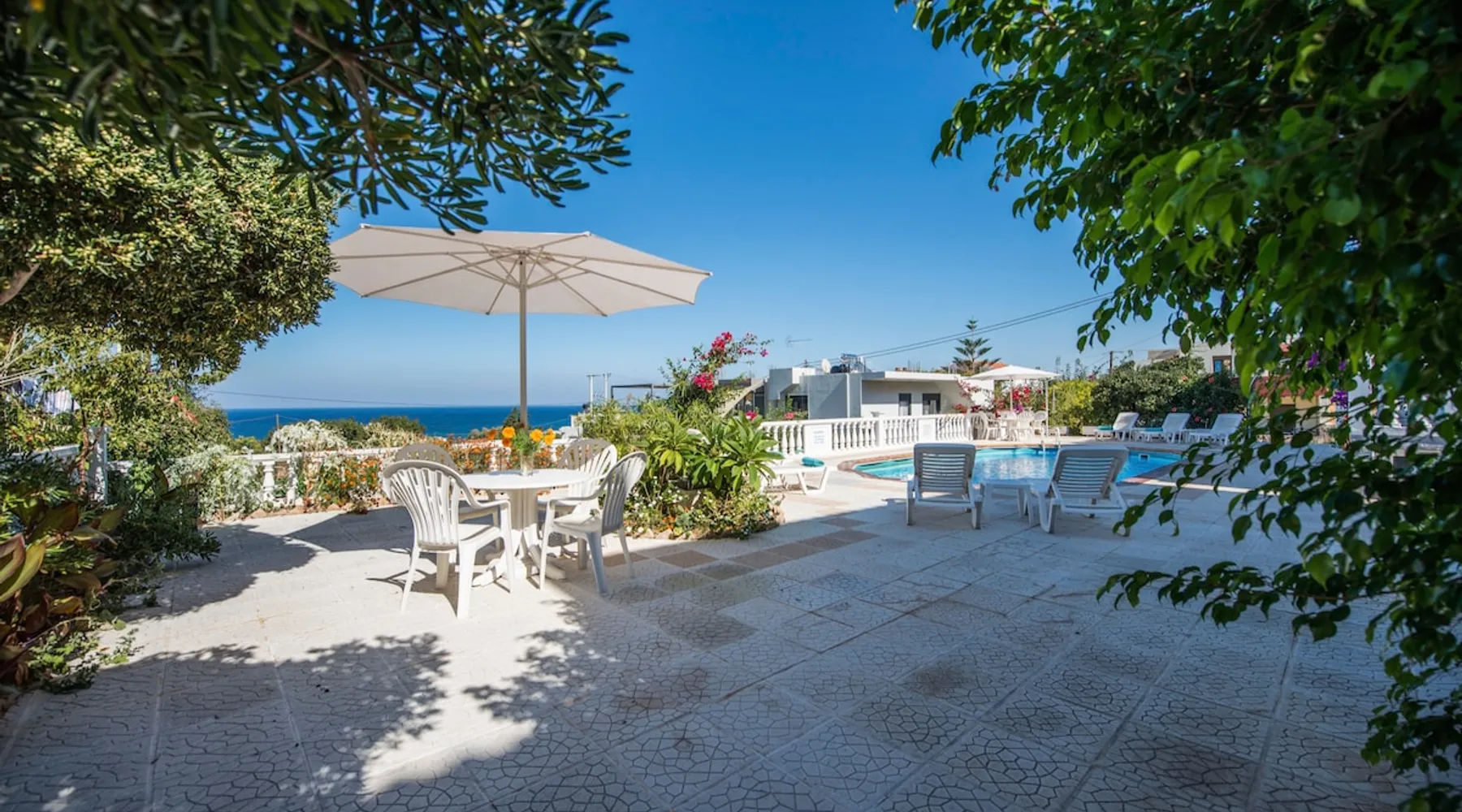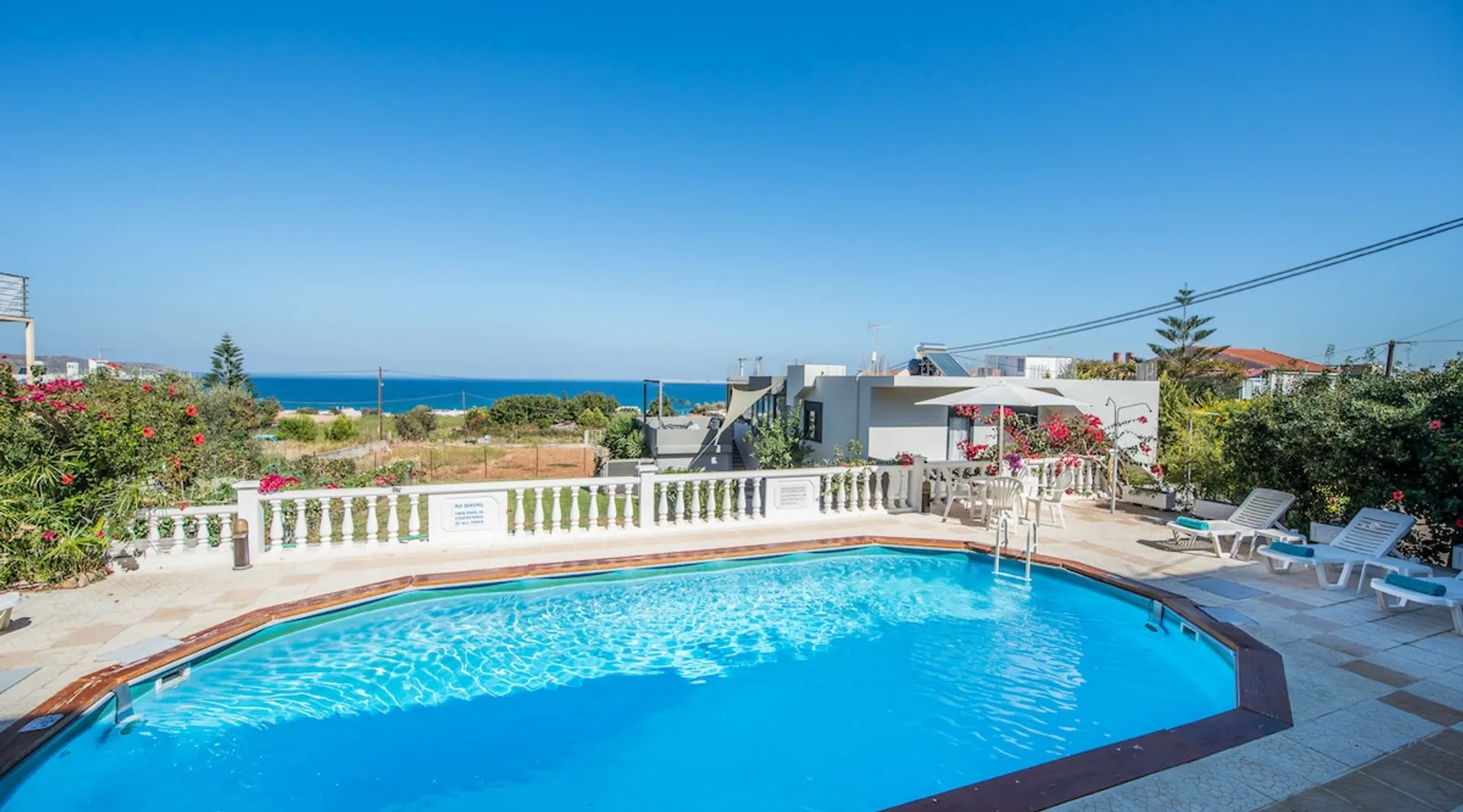 "Smart sea view apt. 5 min walk to beach, tavernas, shops" The space Since the Rouladina flats were introduced to our programme, they have been very popular with our guests who praise the high standards, warm welcome and hospitality of their owners Manolis and Dimitra. There are a total of six individual apartments. All flats share a spectacular 10m x 5m swimming pool, surrounded by terraces with pretty flowers and touches of bougainvillea adding a splash of colour. Behind the flats, vineyards stretch across the tranquil hillside, while from your balcony or the pool, the blue of the sea cuts through the dark green vines. Flat 4 Rouladina, Crete Located at the far end of the flats beyond the pool, three stairs lead down to a small terrace with an entrance leading into the living room (with air-conditioning). From here, an archway leads to the dining room, off of which is the breakfast bar and kitchen. On one side of the dining room is a windowed double bedroom with en-suite bathroom. On the other side, a sliding door leads to the hallway with a bathroom shared by a double bedroom with a small private terrace. This flat stands out for the charm of its private terrace shaded by trees and the proximity to the swimming pool, which makes it particularly attractive for families wishing to keep relaxed. Essential information Max 6 persons 3 bedrooms 2 bathrooms Cleaning service included Shared swimming pool 10 x 5 A/C Included Area of 70 m² Booking information Check-In any day (after 16:00) Check-out any day (before 10:00) Minimum stay 5 nights. Nearby places Beach 500 m Taverns 400 m Supermarkets 350 m Distances from the airport Chania 27 km Ferry Port Souda 1 5 km Heraklion 148 km Equipment of the villa Local TV Hair dryer Toaster Kettle Sun loungers Microwave WiFi Security Fan Departure Day Room Shared Washing Machine Juicer Communal barbecue Coffee machine with filter Iron and ironing board Pool towels Fridge Freezer Cooker Kitchen utensils Local facilities Stalos sandy beach Guest access The apartment and your balcony/terrace are for your private use. The pool is shared use as well as the garden. Bed linen, towels and pool towels are provided. The cleaner will come during your stay and change them according to the days of your stay. All this is included in the price. Other things to note Housekeeping Your apartment will be prepared for you on arrival with fresh bath and hand towels and all beds made up. For stays of 7 nights or more - house towels will be changed every 3 - 4 days. For stays of 14 nights or more - bed linen will be changed every 7 days. Pool/beach towels - one per person for the duration of your stay. Note that this is a professionally run rental villa which as been licensed by the Greek National Tourist Organization, EOT, which is required by the Greek law. This license allows the property owners to legally rent their accommodation to holiday makers, so that they comply to a set of standards and specific conditions for the safety & comfort of it's paying customers. Greek Climate Tax: The Greek Government has introduced a new tourist tax (Climate Crisis Resilience Fee) with effect from January 2024. This applies to villa rentals, apartments and hotels, between March and November. From 1/1/2025, the applicable tourist tax is 2.00 € per apt. per night. You’ll be asked to pay the tax, in cash, soon after you check-in. Registration Details 1042Κ032Α0138800