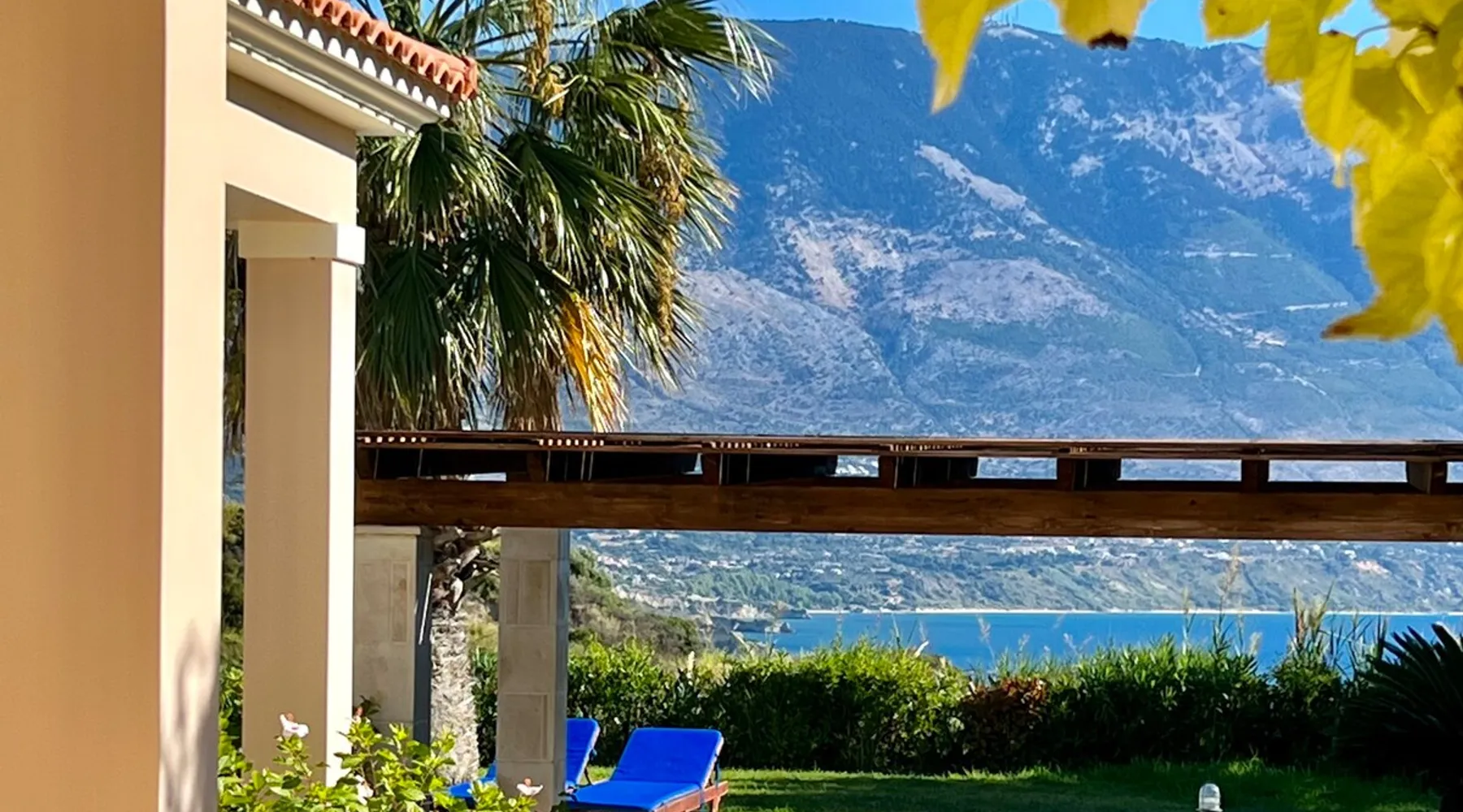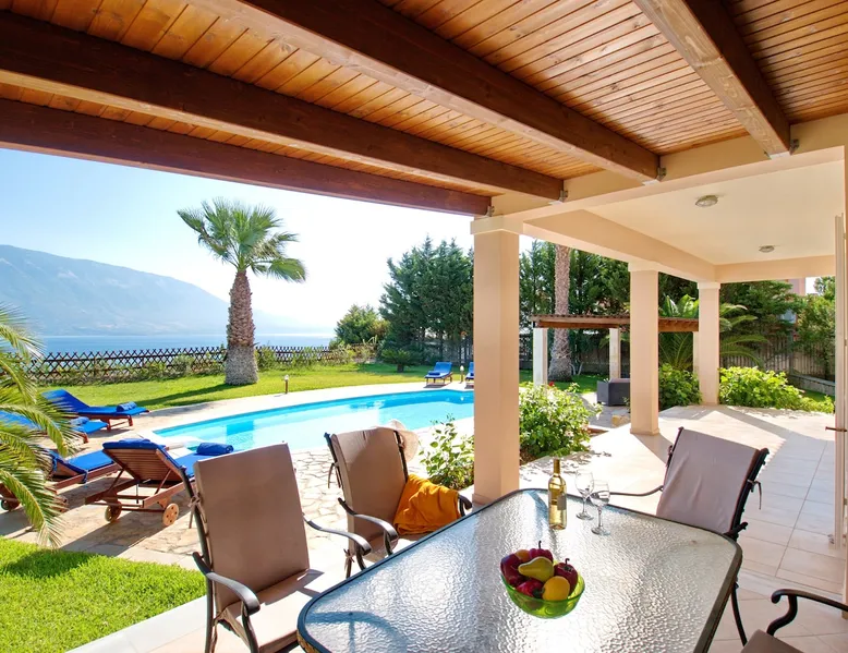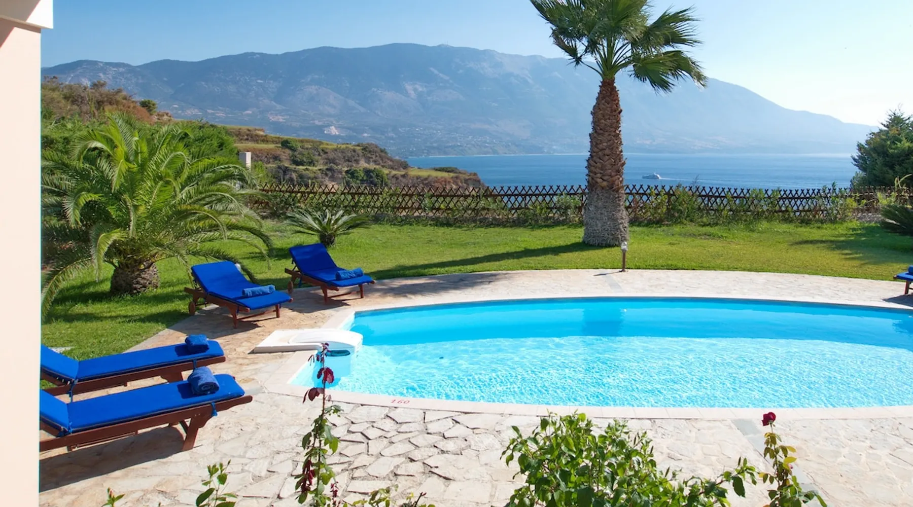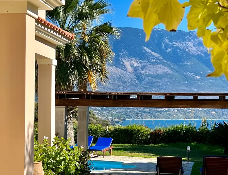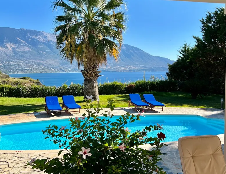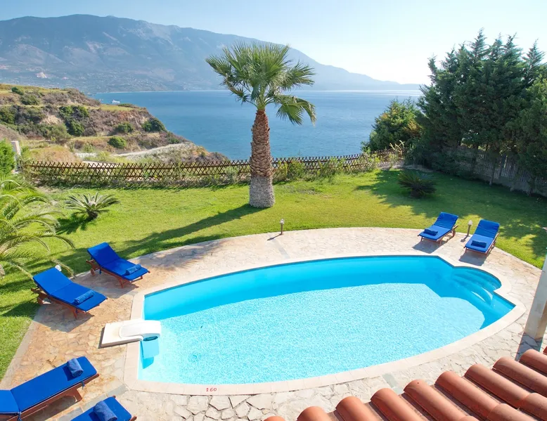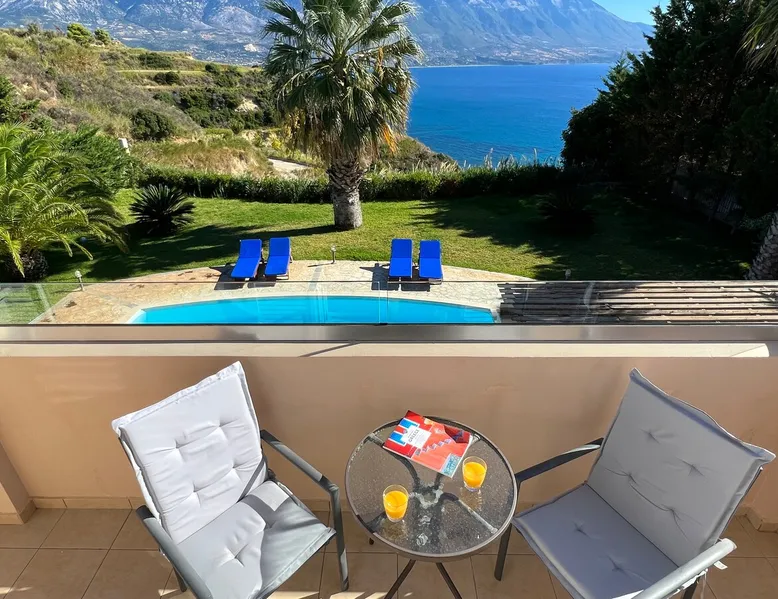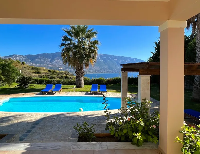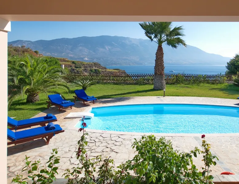 Villa Eros, a truly comfortable and beautifully laid out, sea view Villa , which is really five star when it comes to outside living. It's extensive area of lawns and copious area of covered terraces make it a truly excellent choice for families. One of a select group of Villas sharing the peninsular just south of the village of Spartia. The space Villa Eros, Spartia, Kefalonia With nothing short of fabulous views across the sea towards Mount Aenos, Villa Eros is one of a small and select group of Villas, a few kilometers from tiny Spartia village. A short walk down the hill takes you to an interesting rock formation with a platform lapped by the sea, equipped with sun beds and an ideal place to snorkel (see the video). Location There's a sandy beach just a 5 min drive away, above which The Waterways Taverna entices boat owners to tie up at the small jetty below. There's also a couple of tavernas amongst Spartia's maze of narrow streets, where there are also two mini markets. For a wider choice it is not much more than a 15 min drive to Argostoli where an evening walking the promenade and around the square before making a choice of restaurants is not to be missed. Outside Villa Eros Swimming Pool - 9m x 4.5m private pool with Roman step entry Pool depths 1.20m -1.60m. Sun Terrace - furnished with sun loungers. Pergola - poolside, with comfortable rattan sofa and chairs, sea view. Dining Terrace - Covered dining area with table and chairs. Pool views. BBQ - to the side of the villa. Garden - lawns bordered by shrubs. Inside Villa Eros Open plan living room Sitting Area – Two comfy sofas, plasma TV with satellite, DVD player and two large French doors to the covered dining terrace, with pool view. Air Con Unit. Dining Area - Wooden table and seating for six. Kitchen Area - Wooden fitted cupboards, double sink, electric oven with hobs, microwave, dishwasher, washing machine and fridge freezer. Window above the sink to the garden. Twin bedroom – Two single beds, French windows to side. Air Con Unit. Shower room - Shower with glass surround and door, washbasin and WC. First Floor Double bedroom with en suite bath/shower room - Double bed. French doors to balcony with sea views. Tiled en suite bathroom with bath and shower attachment, wash basin, WC. Air con unit Twin bedroom with en suite shower room - Two single beds, French doors to balcony with sea view. Tiled en suite bathroom with bath and separate shower cubicle, wash basin, WC. Air con unit Essential Grocery Pack - on arrival you will find a few essentials to begin your holiday. Guest access The villa and pool is for your private use only as well as the garden. Bed linen & towels are provided as well as pool towels. The cleaner will come in during your stay & change them, depending on how many days you are staying. All of this is included in the price. Other things to note Housekeeping Your Villa will be prepared for you on arrival with fresh bath and hand towels and all beds made up. For stays of 7 nights or more - house towels will be changed every 3 - 4 days. For stays of 14 nights or more - bed linen will be changed every 7 days. Pool/beach towels - one per person for the duration of your stay. If you need a travel cot or a high chair (usually for children up to 2 years old), please request when booking so we can have it ready for your arrival. Optional chargeable services: - Second High Chair - Second Cot Note that this is a professionally run rental villa which has been licensed by the Greek National Tourist Organization (EOT), which is required by the Greek law. This license allows the property owners to legally rent their accommodation to holiday makers, so that they comply to a set of standards and specific conditions for the safety & comfort of its paying customers. Registration Details 1237078