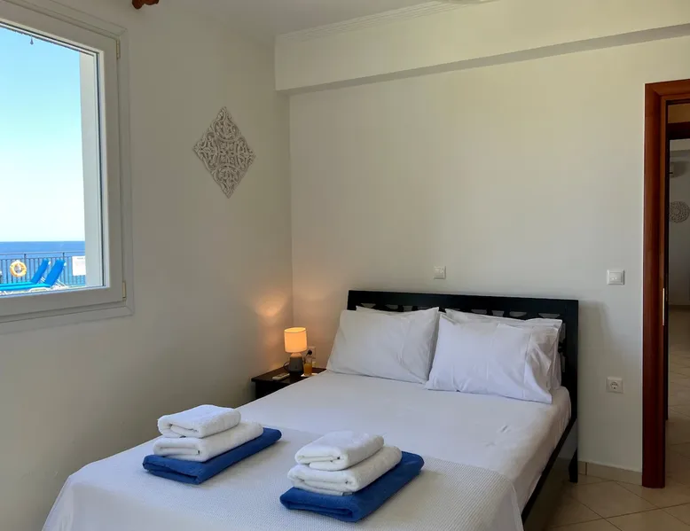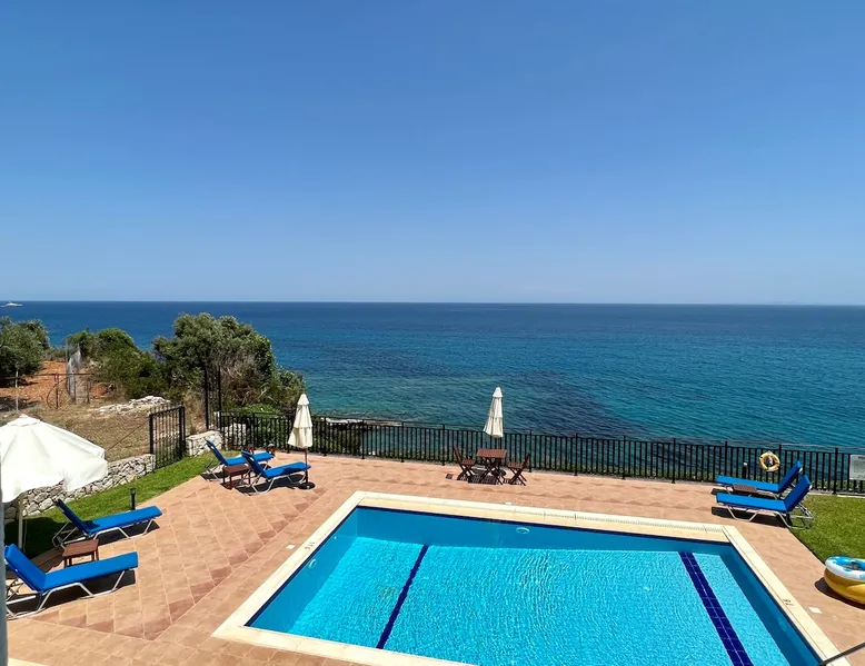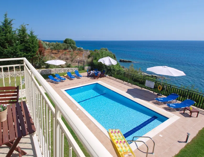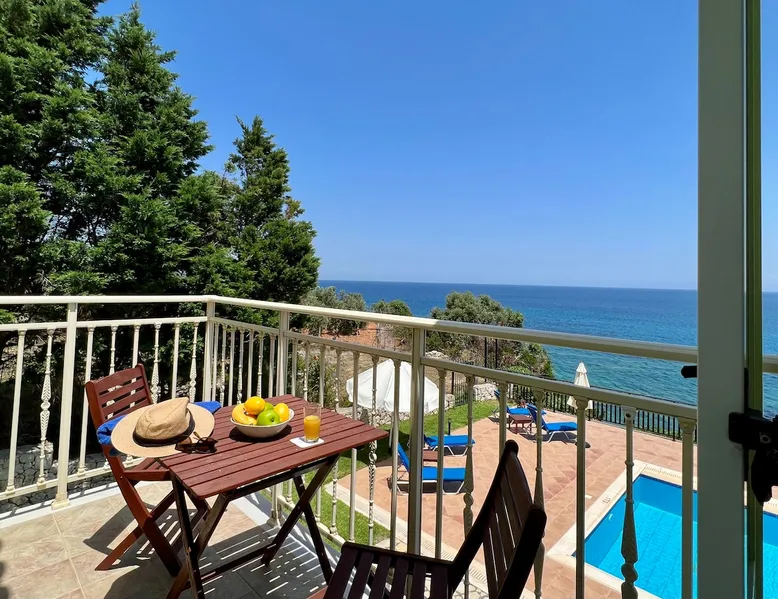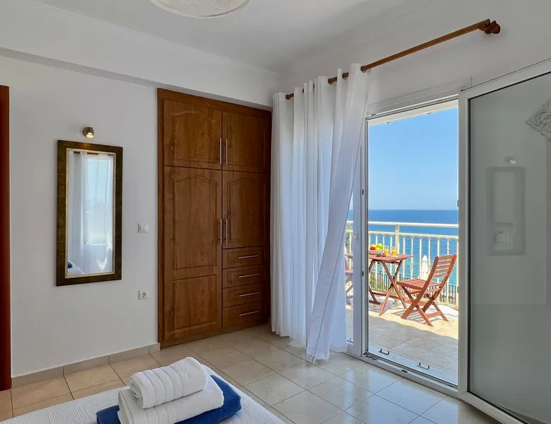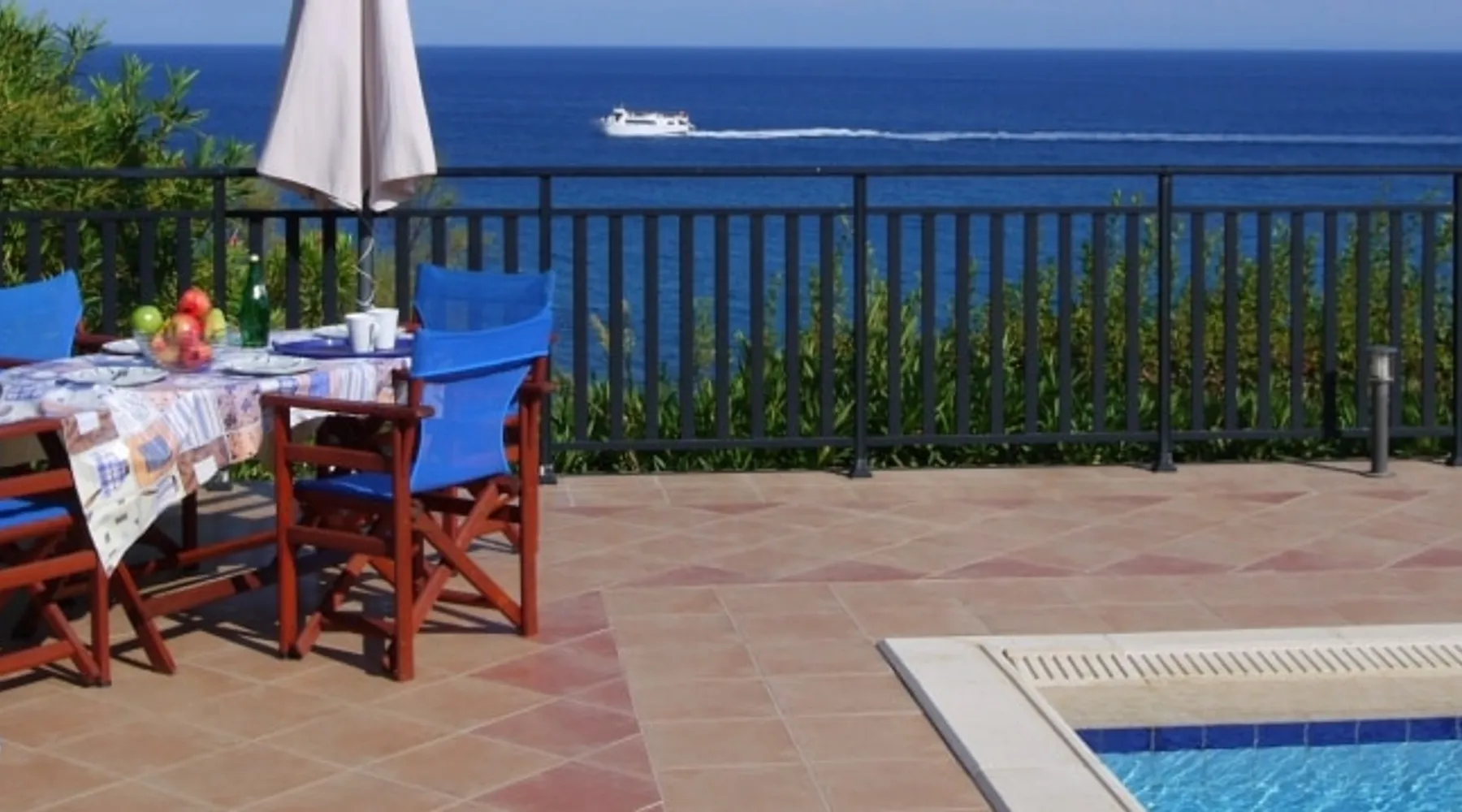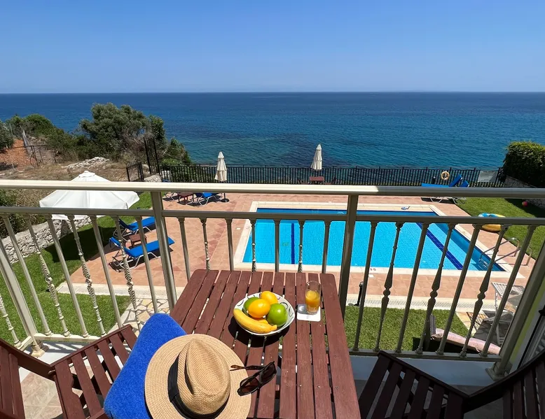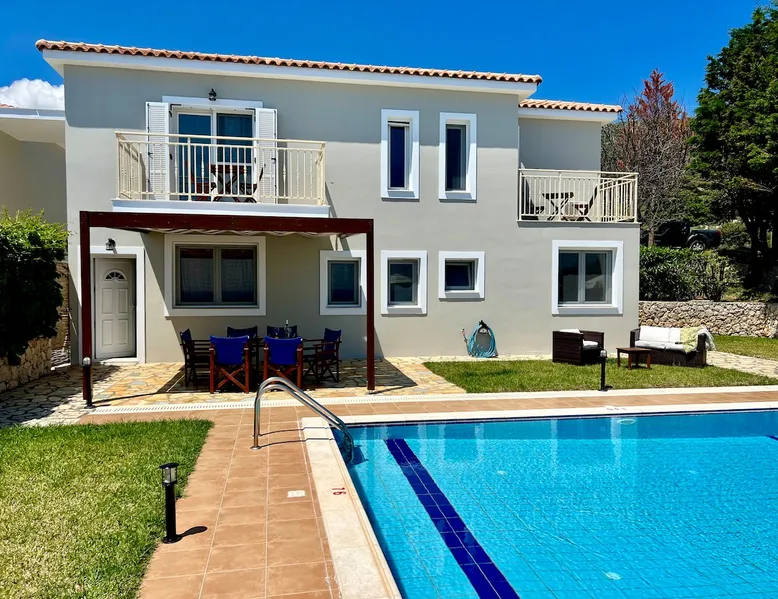 "Stunning Sea View Villa" Villa Korfos has a sea view second to none in this south east corner of Kefalonia, being set right on the rising coast line, overlooking the sea. On clear days you can see right across to the mainland and watch ferries, sailing boats and pleasure yachts plying their way to and fro. The Villa has been beautifully finished and designed to be ideal for families or groups of up to 3 couples, with 3 double bedrooms all having a bathroom or shower room en-suite. The space Villa Korfos, Skala, Kefalonia The Villa has been beautifully finished and designed to be ideal for families or groups of up to three couples with three double bedrooms all of which have a bathroom or shower room en-suite. There is a sofa bed in the larger bedroom for those who require a room with two beds - maybe for teenagers or children. Location In a quiet area just out of town, it’s 1.2 kms along the coast from the laid back resort of Skala and a pleasant evening stroll can be followed by a returning short taxi ride back. If you’d rather not move even that far from the Villa (perfectly understandable), then within a 5 minute walk there is a lovely little undiscovered pebbly cove with beautiful clear water. There is also a choice between two excellent tavernas. Ten minutes walk further brings you to a patisserie (great croissants for breakfast) and a mini market. Outside Villa Korfos Sea View Swimming Pool - 8m x 5m swimming pool. Depth 1m to 1.75m. Ladder entry Sea View Sun terrace - sunbeds, rattan sofa set, and parasols Dining terrace - table, chairs and parasol - probably the best dining spot in the whole of Skala. Sea View Covered Dining terrace - pergola with table and chairs Garden - neat lawns and flowering shrubs Barbecue terrace - purpose built barbecue, table and chairs. 2 Sea View Balconies - both with wonderful sea views and table and chairs. Inside Villa Korfos Ground Floor - Open plan Living Area Kitchen area - run of fitted cupboards, dishwasher, electric oven and ceramic 4 ring hob, fridge freezer, sink. Sitting area - black leather sofa, two occasional chairs, plasma TV and DVD player, sea view window, door to covered terrace and garden. Air Con unit Dining area - table and chairs, sea view window. Double Bedroom - 1 double bed, fitted wardrobes, French doors to garden terrace with table and chairs, sea view window. Shower room - Walk in shower, hand basin, WC. Air Con Unit. First Floor Double Bedroom with en suite bath room - 1 double bed, fitted wardrobes, French doors to sea view balcony with table and chairs. En suite bath with shower attachment, hand basin, WC. Air Con Unit. Double Bedroom with en suite bath room - 1 double bed, fitted wardrobes, sofa bed, French doors to sea view balcony with table and chairs. En suite bath with shower over, hand basin, WC. Air Con Unit. Parking is in a parking bay above the Villa, with several steps down to the entrance. Essential Information: Sleeps (Max) 6 Bedrooms 3 Shower Rooms 3 Maid Service Included Pool Private 8x5 A/C Included Floor Area m²120 Booking Information: Check-In Any day (after 16:00) Check-Out Any day (before 10:00) Minimum stay 5 nights Villa Equipment: DVD Satellite TV Dish Washer Washing Machine Hair Dryer Toaster Kettle Sun Lounger Microwave WiFi Connection Fan BBQ Filter Coffee Machine Iron & Board Pool Towels Fridge Freezer Hob Cooking Utensils Oven Guest access The villa and pool is for your private use only as well as the garden. Bed linen & towels are provided as well as pool towels. The cleaner will come in during your stay & change them, depending on how many days you are staying. All of this is included in the price. Other things to note Housekeeping Your Villa will be prepared for you on arrival with fresh bath and hand towels and all beds made up. For stays of 7 nights or more - house towels will be changed every 3 - 4 days. For stays of 14 nights or more - bed linen will be changed every 7 days. Pool/beach towels - one per person for the duration of your stay. If you need a ‘travel’ cot or a high chair (usually for children up to 2 years old), please request when booking so we can have it in the villa ready for your arrival. Optional chargeable services: - Second High Chair - Second Cot Note that this is a professionally run rental villa which has been licensed by the Greek National Tourist Organization (EOT), which is required by the Greek law. This license allows the property owners to legally rent their accommodation to holiday makers, so that they comply to a set of standards and specific conditions for the safety & comfort of its paying customers. Registration Details 0458K91000360601