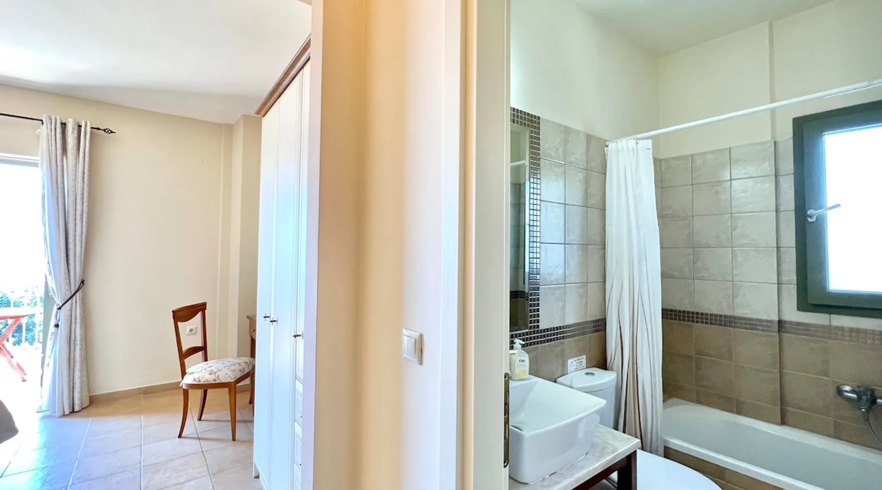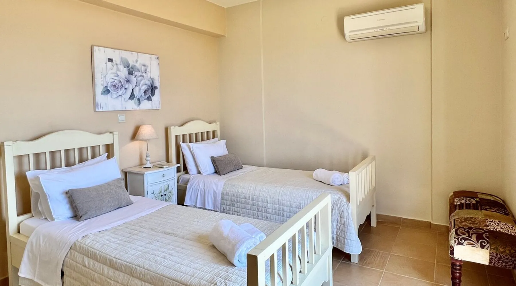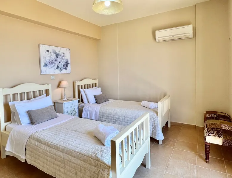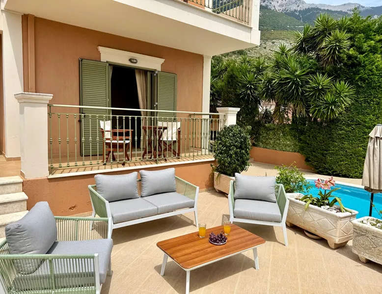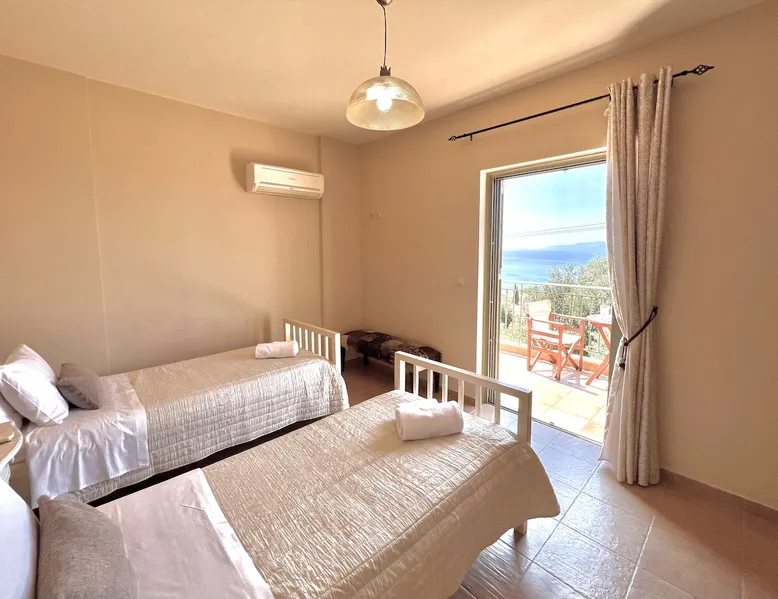 "Smart Villa,Sea Views, stroll to beach & village." On the lower slopes of Mount Aenos with stunning views over the sparkling Ionian Sea as far as the island of Zakynthos in the distance The space Villa Marianna, Lourdas, Kefalonia On the lower slopes of Mount Aenos with stunning views over the sparkling Ionian Sea as far as the island of Zakynthos in the distance, Villa Marianna sits beside olive groves close to the outer limits of the village of Lourdata. The delightful owner of Villa Marianna, Hariklia, may well pop in with a friendly smile and a cake during your stay as she is particularly keen to make guests feel immediately at home, a sentiment reflected in the decor of her lovely Villa. Decorated in calming pastel shades this neat Villa is ideal for a couple or small family. Location There is a mini market and a choice of tavernas within easy walking distance and Lourdas beach and its waterside tavernas are a little less than 2 kilometers away. There is a choice of several small sandy beaches in this area of the south coast. Midway between Argostoli and Skala it is about 15 kms to either, should you crave a little livelier entertainment. Outside Villa Marianna Swimming Pool - 7m x 4m, depth 1.2m x 1.7 m Poolside Sun Terrace - Sun beds, parasols. Sea views. BBQ - Free standing barbecue and wood oven close to dining terrace. Covered dining terrace - Wood table and chairs Garden - Lawn beside the pool, enclosed by a sweet smelling tangle of flowering and climbing shrubs, Inside Villa Marianna Ground floor Open Plan Living Room Living area -Sofa, and chairs, TV, French doors to sea view terrace. Air Con Unit Dining area - Table and chairs, French doors to covered sea view dining terrace. Kitchen area - Dishwasher, 4 ring ceramic hob and electric oven, microwave and large fridge freezer. Guest WC - Wash basin W.C. First floor Twin bedroom, ensuite bathroom - 2 single beds, sliding patio doors to pool and sea view balcony. The beds can be made up as a double on request. Ensuite short bath with shower over, washbasin W.C. Air Con. unit Double bedroom, en suite bathroom. - 1 Double bed, sliding patio doors to side pool and sea view balcony. En suite short bath, wash basin, W.C. Air Con. unit. Parking- There is parking space next to the villa under the shade of the trees. Essential Information: Sleeps (Max) 4 Bedrooms 2 Shower Rooms 2 Maid Service Included Pool Private 7m x 4m A/C Included Floor Area m² 100 Booking Information: Check-In Any day (after 16:00) Check-Out Any day (before 10:00) Minimum stay 5 nights Local Facilities: Beach 1,3km Tavernas 350m Mini Market 600m Distances: Kefalonia (efl)14 km Villa Equipment: DVD CD Satellite TV Dish Washer Washing Machine Hair Dryer Toaster Kettle Sun Lounger Microwave WiFi Connection Safe BBQ Mosquito Window Blind Filter Coffee Machine Iron & Board Pool Towels Fridge Freezer Hob Cooking Utensils Guest access The villa and pool is for your private use only as well as the garden. Bed linen & towels are provided as well as pool towels. The cleaner will come in during your stay & change them, depending on how many days you are staying. All of this is included in the price. Other things to note Housekeeping Your Villa will be prepared for you on arrival with fresh bath and hand towels and all beds made up. For stays of 7 nights or more - house towels will be changed every 3 - 4 days. For stays of 14 nights or more - bed linen will be changed every 7 days. Pool/beach towels - one per person for the duration of your stay. If you need a ‘travel’ cot or a high chair (usually for children up to 2 years old), please request when booking so we can have it in the villa for you ready. Optional chargeable services: - Second High Chair - Second Cot Note that this is a professionally run rental villa which has been licensed by the Greek National Tourist Organization (EOT), which is required by the Greek law. This license allows the property owners to legally rent their accommodation to holiday makers, so that they comply to a set of standards and specific conditions for the safety & comfort of its paying customers. Registration Details 0458K91000345601