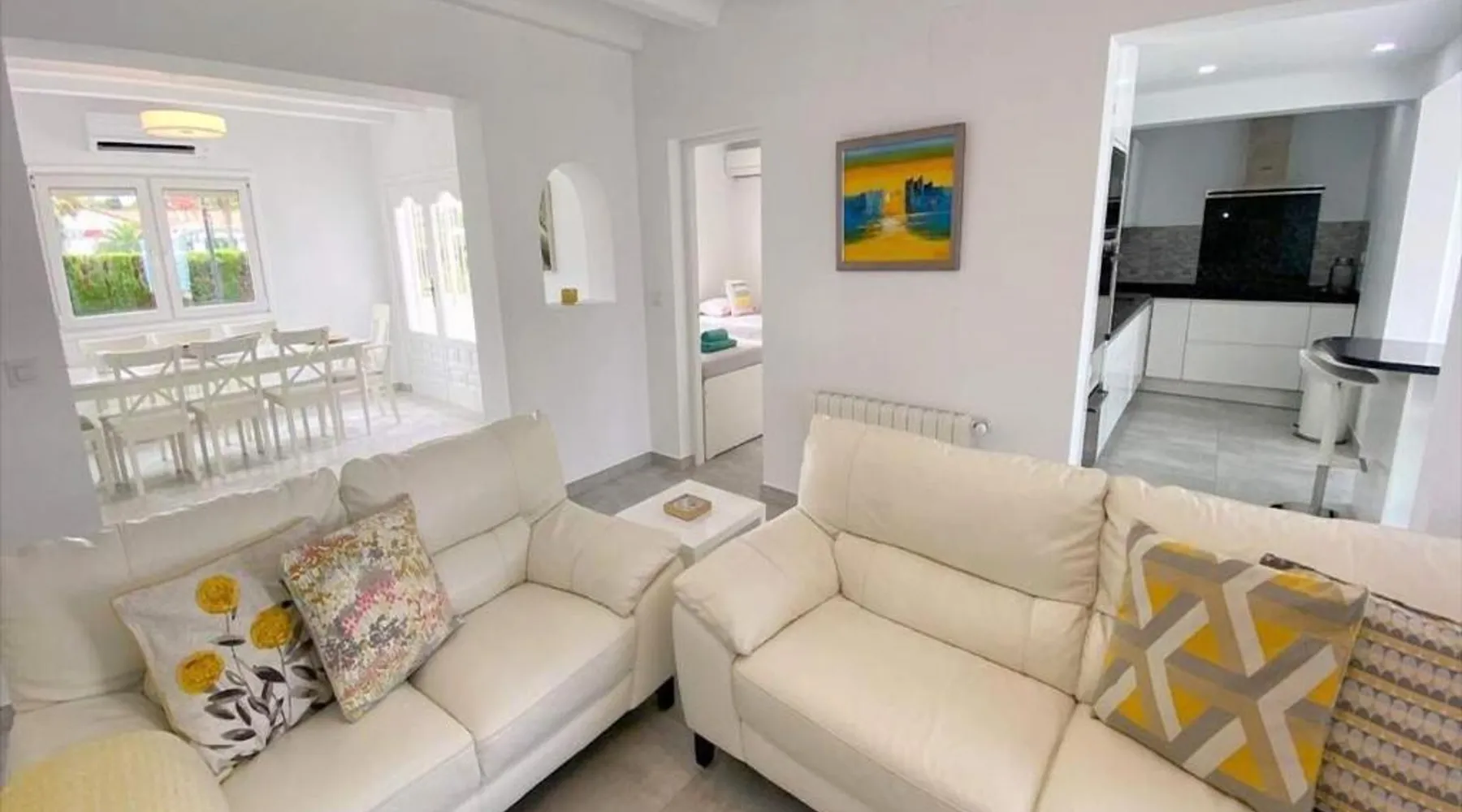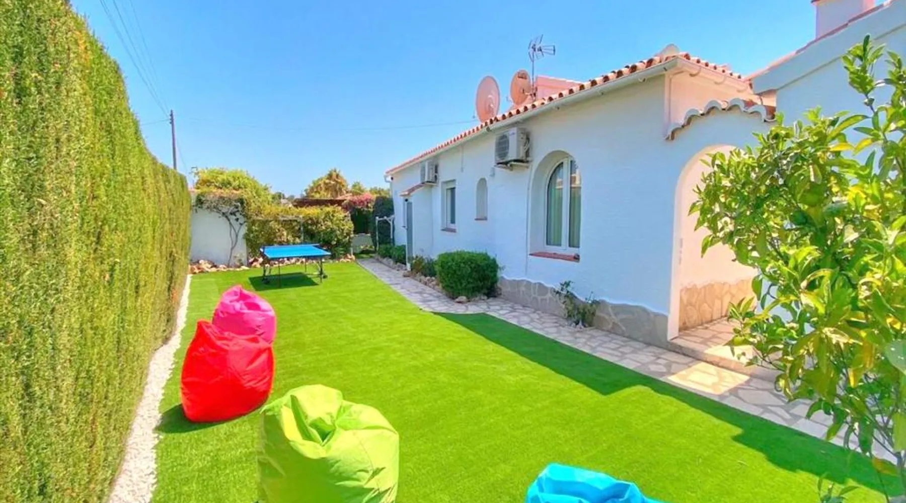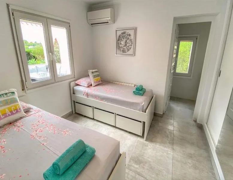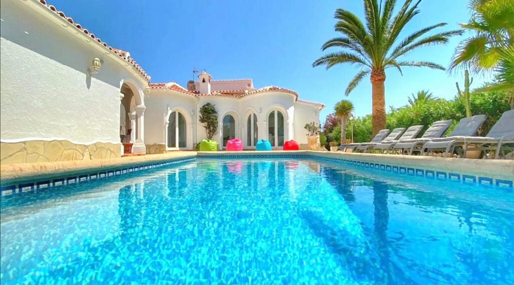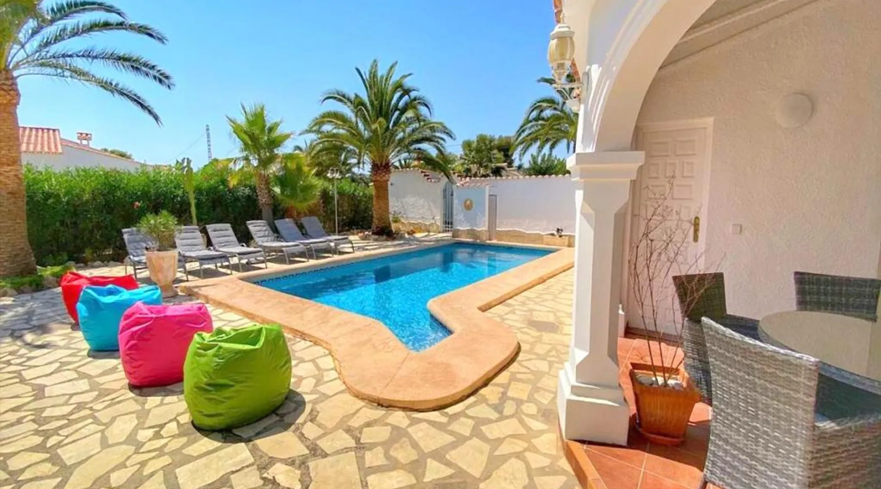 Spacious Accommodations: Casa Costa Nova Javea in Javea offers a spacious chalet with four bedrooms and three bathrooms. The property includes a living room and family rooms, ensuring comfort for all guests. Outdoor Amenities: Guests can enjoy a garden, terrace, and outdoor swimming pool. The terrace provides a perfect spot for relaxation, while the pool offers a refreshing retreat. Free WiFi is available throughout the property. Convenient Facilities: The chalet features air-conditioning, a fully equipped kitchen, washing machine, and free on-site private parking. Additional amenities include a fireplace, barbecue, and outdoor dining area. Nearby Attractions: Ambolo Beach is 1.2 mi away, while La Sella Golf lies 11 mi from the property. Other attractions include El Montgó (9.9 mi) and Peñón de Ifach Natural Park (17 mi). Alicante–Elche Miguel Hernández Airport is 65 mi distant. The private pool and fireplace are the special features of this chalet. Featuring a private entrance, this air-conditioned chalet consists of 1 living room, 4 separate bedrooms and 3 bathrooms with a bath and a shower. Guests will find a stovetop, a refrigerator, a dishwasher and kitchenware in the well-equipped kitchen. The chalet also offers a barbecue. The spacious chalet provides a flat-screen TV with satellite channels, a washing machine, a tea and coffee maker, a seating area as well as garden views. The unit offers 7 beds.