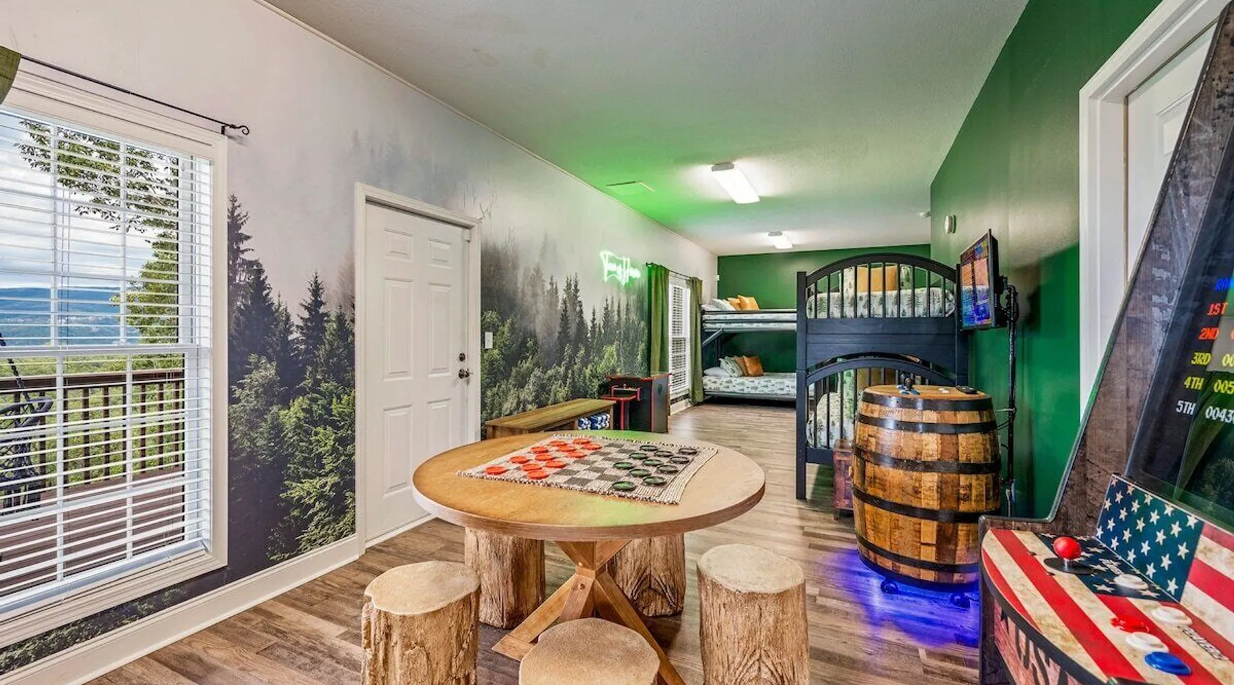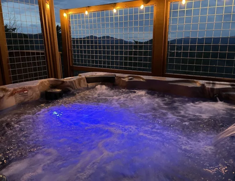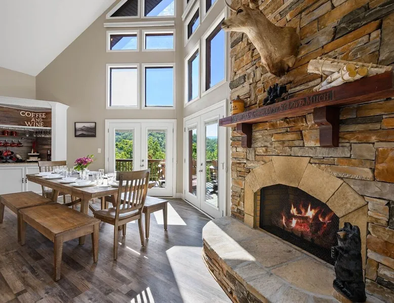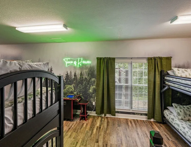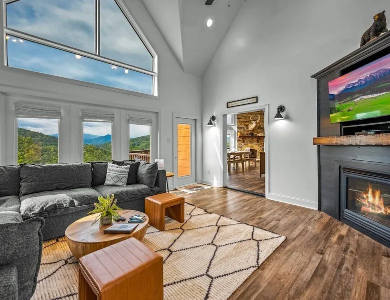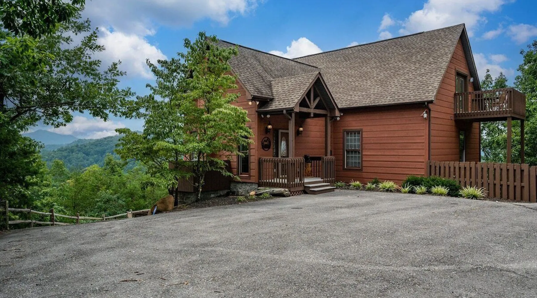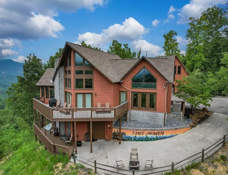Welcome to Trace of Heaven, our stunning dog-friendly modern cabin near Pigeon Forge, TN! This spacious and private cabin situated on five private acres behind two gates boasts epic panoramic views of the surrounding Smoky Mountains that will take your breath away. The sunsets from the deck are truly amazing! The cabin features three beautifully appointed bedrooms, each with its own attached bathroom for ultimate privacy and comfort. The basement is fully finished with additional bunk beds, a 65-inch smart TV, and arcade machines. With ample space for up to 14 guests, this is the perfect spot for families, groups of friends, or couples looking for a romantic getaway. You'll love spending your evenings soaking in the private hot tub on the deck, enjoying the breathtaking views as you relax and unwind. And when hunger strikes, fire up the propane grill for a delicious outdoor meal with the mountains as your backdrop. Inside, you'll find all the modern amenities you need for a comfortable stay, including high-speed internet, a dedicated work space, a fully equipped kitchen, and a cozy living area with a gas fireplace. Up to two dogs allowed per reservation. Located just a short five mile drive from Pigeon Forge, you'll have easy access to all the area's top attractions, including Dollywood, Great Smoky Mountains National Park, as well as local shopping, dining, and entertainment options. Book your stay at our modern cabin today and experience the ultimate mountain getaway with all the comforts of home! Trace of Heaven is located off of scenic Wears Valley Road just minutes from downtown Pigeon Forge and the Great Smoky Mountain National Park making it very easy and convenient to get to all of the Great Smoky Mountain area attractions! GREAT LOCATION! -5 miles from downtown Pigeon Forge -12 miles to Gatlinburg -7 miles to the Great Smoky Mountain National Park(Line Springs Rd. Entrance) -9 miles to Dollywood *Sleeping Arrangements* * Three Master Suites - two QUEENS on main level and one KING upstairs, perfect for 3 couples! All three have attached full bathrooms. * Upstairs Master offers private deck/balcony to enjoy breathtaking sunsets and mountain views. * Two sets of bunks in the basement. One full over full and one twin over twin. Perfect for couples or the kids! * Queen sleeper sofa in the living room if needed. Please note that you will need to bring queen linens if you use the sleeper sofa. Amenities: *Hot tub big enough for 8+ people with mountain views * Arcade Games, Flat Screen Smart Roku TVs * Cable Television - 5 Flat Screen TVs * Custom stone gas log fireplace * Huge deck with a propane grill and amazing 50 mile mountain views! * Screened porch with amazing mountain sunset views and ample seating * Fully equipped kitchen with black stainless steel appliances * Huge custom dinner table with ample seating and amazing mountain views * High speed Internet * Ample flat parking * Washer & dryer * Cathedral ceilings * Open kitchen, dining, and living room area - great for entertaining * Two seasonal gas fireplaces Floor Plan: **Main Level** Huge deck overlooking the Smoky Mountains, screen porch nicknamed the 'Tree House', kitchen, living room with sofa sleeper, two Queen master suites with full bathrooms, large dining room, and additional half bathroom **2nd Floor** Master suite with King size bed, full bathroom with jacuzzi tub, and private deck to take in the views **Basement** One full over full bunk bed, one twin over twin bunk bed, TV area, large game room, laundry room, walk out to lower deck with an 8 person hot tub, a porch swing, and additional seating **Trace of Heaven can also be rented with our other cabin that sleeps 10 named Paradise View on the same road. Property ID 2259250. Link: https://t.vrbo.io/PcHprlQlikb Please reach out if you would like to book both cabins. During some months, 4-wheel drive may be needed. The indoor gas fireplaces are seasonal. (typically available Nov-Mar)