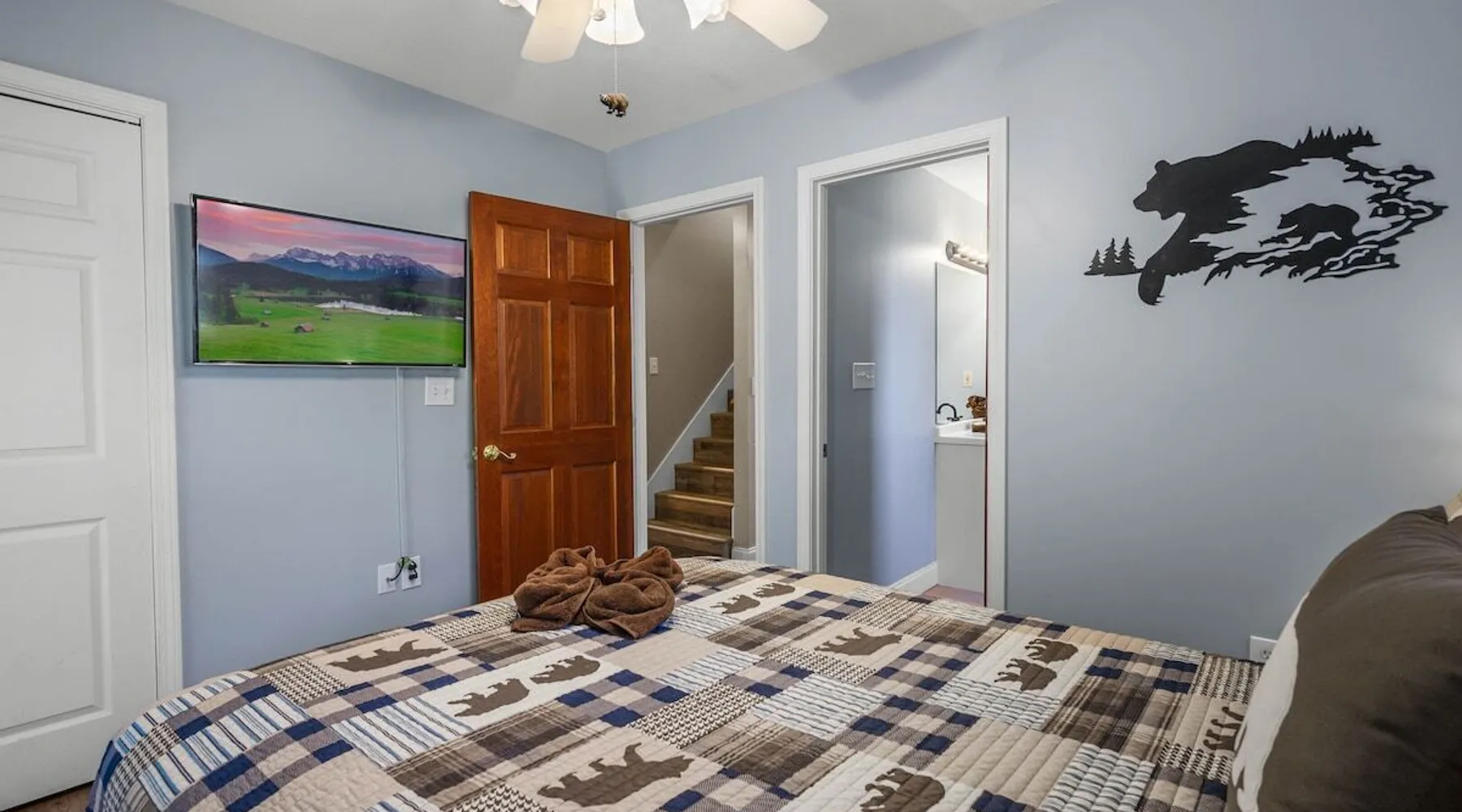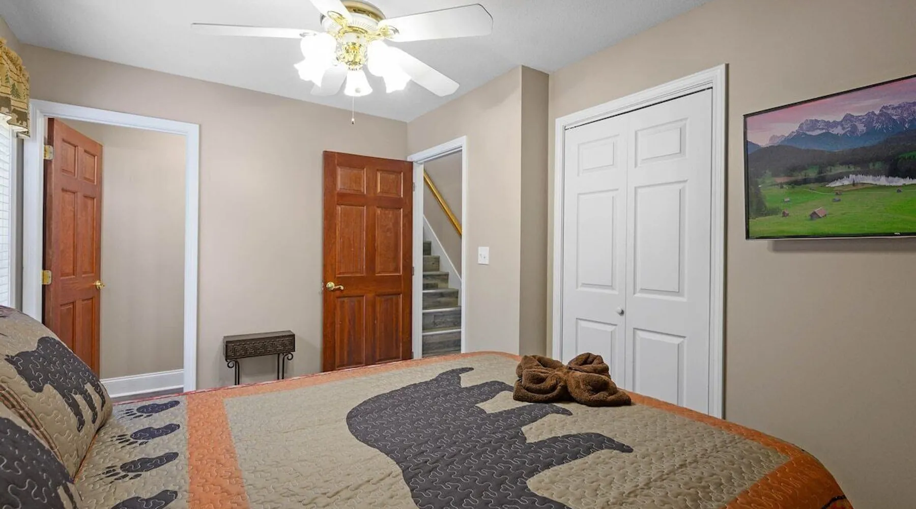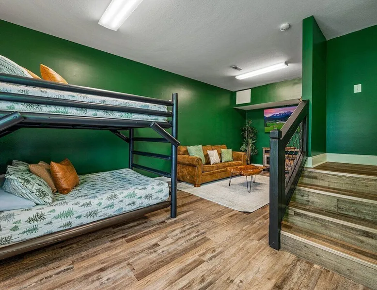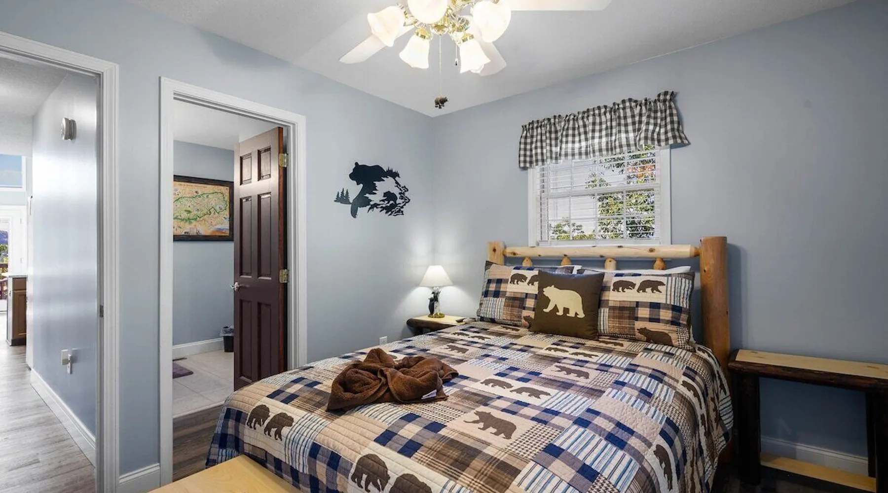 Welcome to Trace of Heaven, our stunning dog-friendly modern cabin near Pigeon Forge, TN! This spacious and private cabin situated on five private acres behind two gates boasts epic panoramic views of the surrounding Smoky Mountains that will take your breath away. The sunsets from the deck are truly amazing! The cabin features three beautifully appointed bedrooms, each with its own attached bathroom for ultimate privacy and comfort. The basement is fully finished with additional bunk beds, a 65-inch smart TV, and arcade machines. With ample space for up to 14 guests, this is the perfect spot for families, groups of friends, or couples looking for a romantic getaway. You'll love spending your evenings soaking in the private hot tub on the deck, enjoying the breathtaking views as you relax and unwind. And when hunger strikes, fire up the propane grill for a delicious outdoor meal with the mountains as your backdrop. Inside, you'll find all the modern amenities you need for a comfortable stay, including high-speed internet, a dedicated work space, a fully equipped kitchen, and a cozy living area with a gas fireplace. Up to two dogs allowed per reservation. Located just a short five mile drive from Pigeon Forge, you'll have easy access to all the area's top attractions, including Dollywood, Great Smoky Mountains National Park, as well as local shopping, dining, and entertainment options. Book your stay at our modern cabin today and experience the ultimate mountain getaway with all the comforts of home! Trace of Heaven is located off of scenic Wears Valley Road just minutes from downtown Pigeon Forge and the Great Smoky Mountain National Park making it very easy and convenient to get to all of the Great Smoky Mountain area attractions! GREAT LOCATION! -5 miles from downtown Pigeon Forge -12 miles to Gatlinburg -7 miles to the Great Smoky Mountain National Park(Line Springs Rd. Entrance) -9 miles to Dollywood *Sleeping Arrangements* * Three Master Suites - two QUEENS on main level and one KING upstairs, perfect for 3 couples! All three have attached full bathrooms. * Upstairs Master offers private deck/balcony to enjoy breathtaking sunsets and mountain views. * Two sets of bunks in the basement. One full over full and one twin over twin. Perfect for couples or the kids! * Queen sleeper sofa in the living room if needed. Please note that you will need to bring queen linens if you use the sleeper sofa. Amenities: *Hot tub big enough for 8+ people with mountain views * Arcade Games, Flat Screen Smart Roku TVs * Cable Television - 5 Flat Screen TVs * Custom stone gas log fireplace * Huge deck with a propane grill and amazing 50 mile mountain views! * Screened porch with amazing mountain sunset views and ample seating * Fully equipped kitchen with black stainless steel appliances * Huge custom dinner table with ample seating and amazing mountain views * High speed Internet * Ample flat parking * Washer & dryer * Cathedral ceilings * Open kitchen, dining, and living room area - great for entertaining * Two seasonal gas fireplaces Floor Plan: **Main Level** Huge deck overlooking the Smoky Mountains, screen porch nicknamed the 'Tree House', kitchen, living room with sofa sleeper, two Queen master suites with full bathrooms, large dining room, and additional half bathroom **2nd Floor** Master suite with King size bed, full bathroom with jacuzzi tub, and private deck to take in the views **Basement** One full over full bunk bed, one twin over twin bunk bed, TV area, large game room, laundry room, walk out to lower deck with an 8 person hot tub, a porch swing, and additional seating **Trace of Heaven can also be rented with our other cabin that sleeps 10 named Paradise View on the same road. Property ID 2259250. Link: https://t.vrbo.io/PcHprlQlikb Please reach out if you would like to book both cabins. During some months, 4-wheel drive may be needed. The indoor gas fireplaces are seasonal. (typically available Nov-Mar)