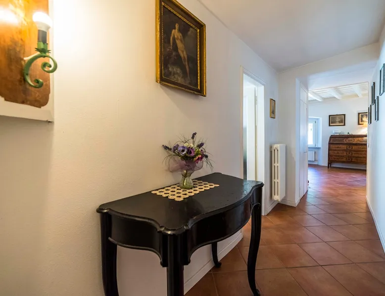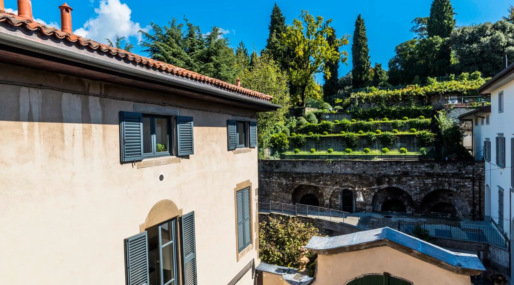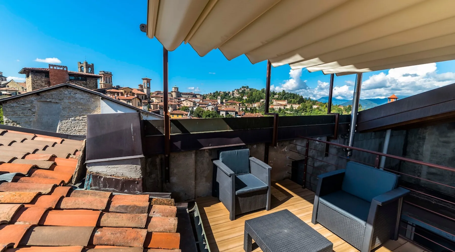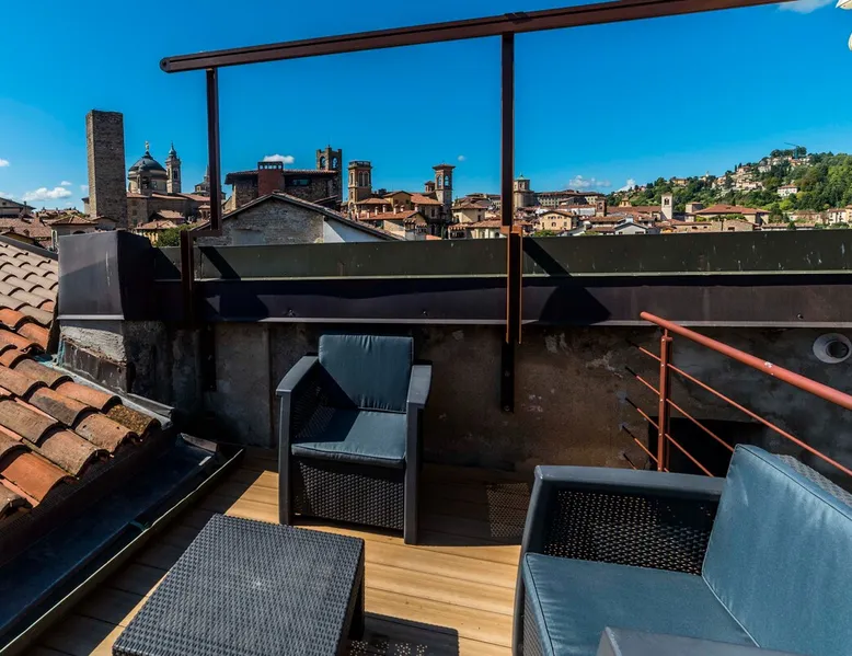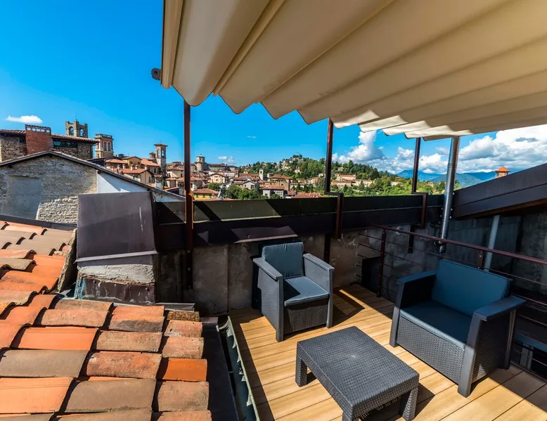 In the heart of Città Alta, a few meters from the historic center, a charming apartment on the second floor in a building from the 1300s and 1600s. Fantastic view and period furnishings, exposed beams. Very cozy. Large and romantic bedroom. Living room with double sofa bed (sleeps 2), modern equipped kitchen (washing machine, dishwasher, oven, large fridge and 4 burners), bathroom with shower. Bright and romantic. Access to the building through an ancient courtyard with a very charming porch. The space Rarely are apartments in historic homes so bright! It is furnished with antique furniture but is renovated, therefore practical and functional. Romantic, with exposed beams, it overlooks the rooftops of Città Alta and offers a magnificent view of Colle di S. Vigilio, especially from the solarium whose use is reserved for guests of the apartment. Guest access Equipped with a solarium with table and chairs and a remote-controlled awning. There is also an inner courtyard with a porch where guests can sit and enjoy the coolness and quiet of the courtyard in summer. Very quiet, peaceful area, but 100 meters from the shops. Other things to note Bergamo and Città Alta are beautiful. Being able to stay in a medium-sized apartment, very bright in a period context with fresco on the stairs, original wrought iron staircase, period furniture, stately, elegant but also romantic and refined will make your vacation even more enjoyable. Registration Details IT016024C2BYAYYM2F