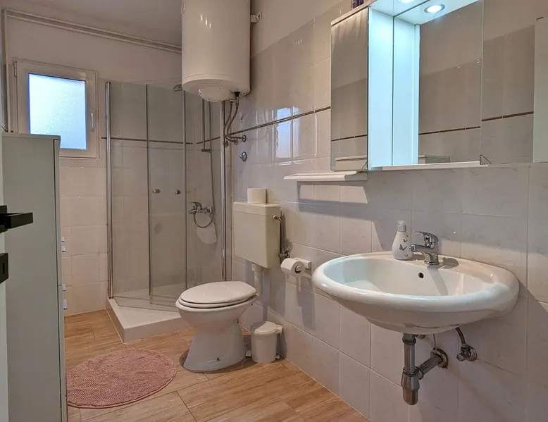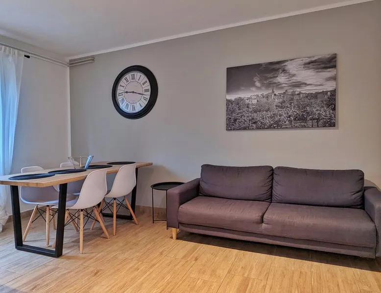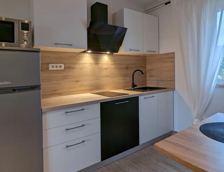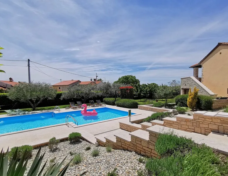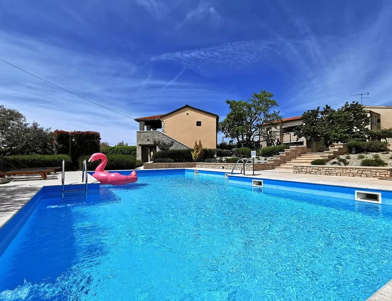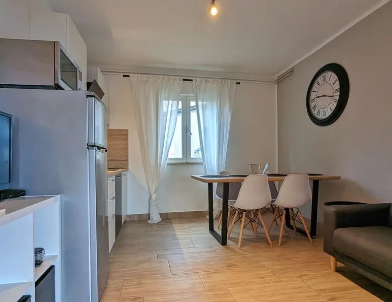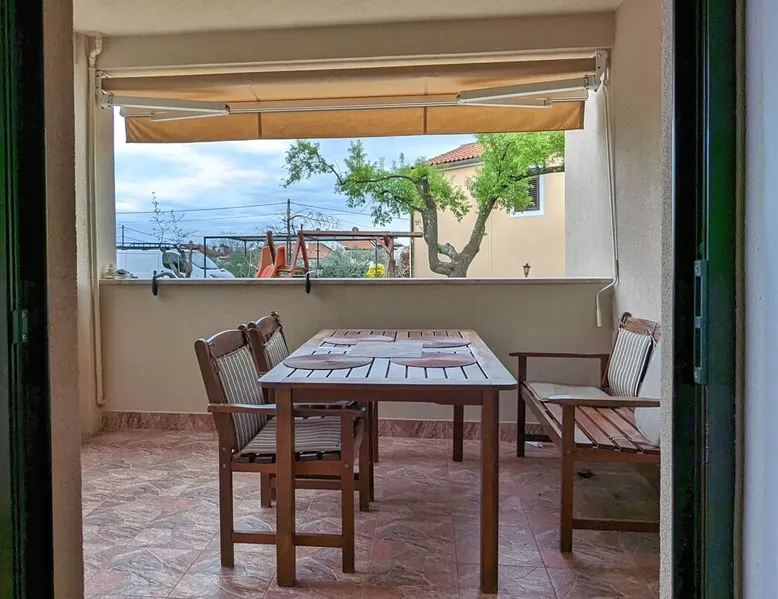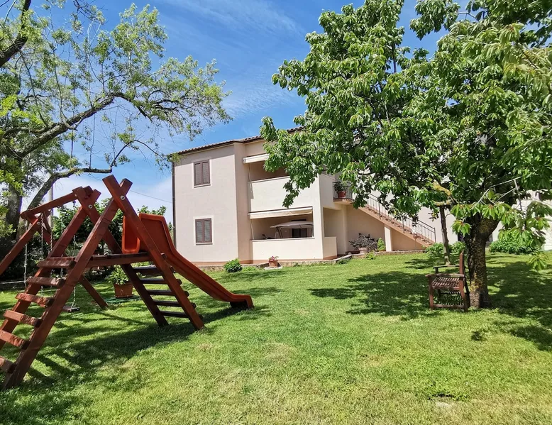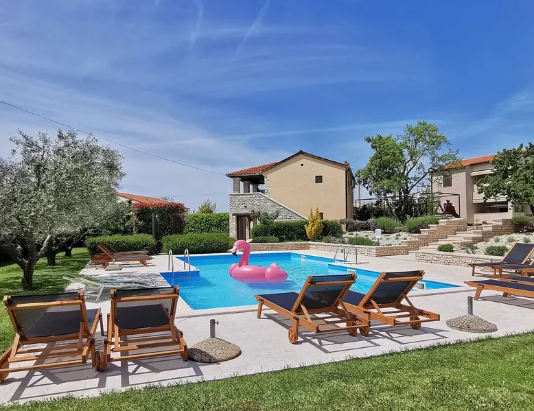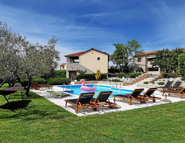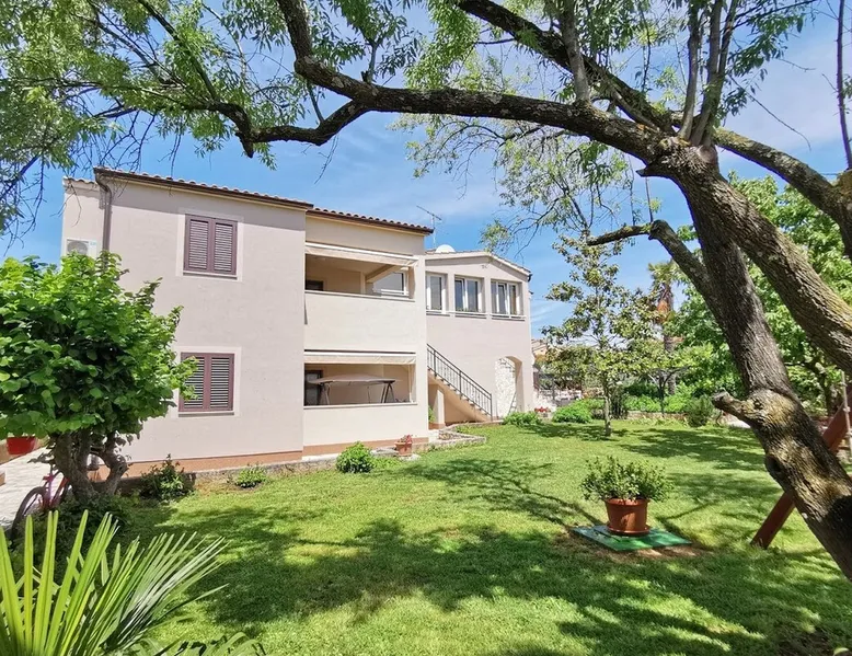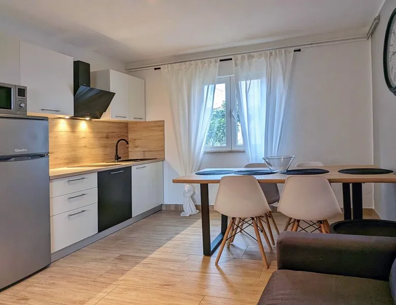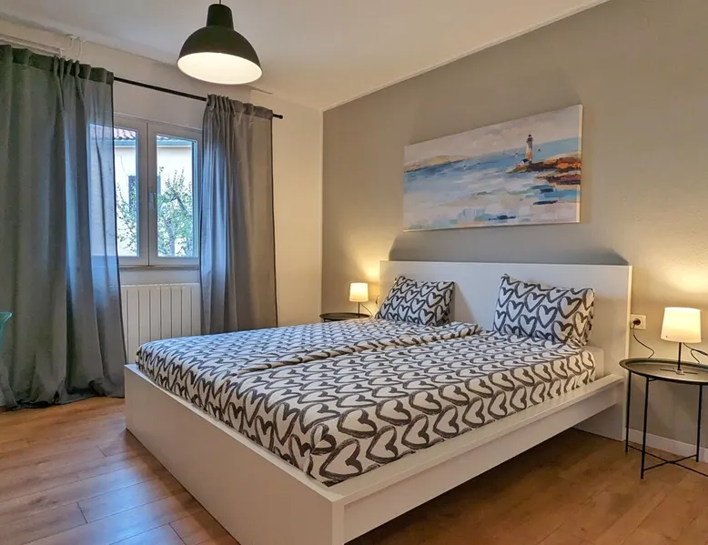 Not far from the old town of Bale, the 60m² flat is located on the ground floor of the house and has 2 bedrooms, each with a double bed. From the living room with its well-equipped open kitchen, you have direct access to the 12m² terrace on the garden side. The space In the garden near the pool, guests have access to a beautiful barbecue area. The cosy seating area invites you to spend sociable evenings at the barbecue. The large pool is shared by the guests of Villa Nina and the neighbouring Casa Istriana. The friendly hosts also live in the house and are always available to answer your questions. Of course, the holiday home also has a parking space on the enclosed property. The old town of Bale, restaurants, bars and shops are only a 5-minute walk from the flat. The beaches of San Polo and Colone are only a few minutes away by bike or car.