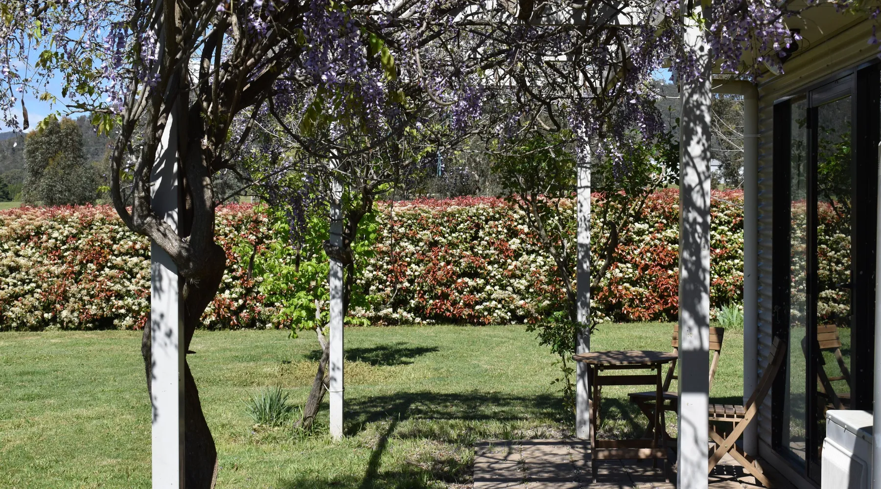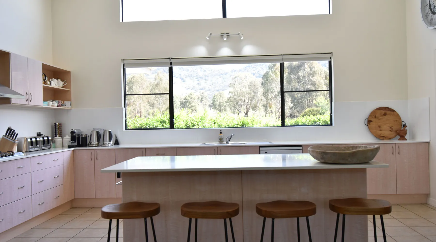AroonaLea is a modern homestead with a touch of country charm. It is a haven of peace, privacy and luxury with breathtaking pastoral views to forested hills. You will have the 30 acre property to yourselves to explore and enjoy. The homestead, which is fully air conditioned, has a pool, firepit and park like grounds with a BBQ/picnic area by a flowing river at the end of the paddock. It is situated less than 15 minutes drive to Mudgee on the Sydney side of town, close to some of Mudgee’s finest wineries. The homestead has 2 separate living areas. The main living, dining and kitchen area has a cathedral ceiling with high windows at each end offering views of nearby hilltops on both sides of the house. AroonaLea comfortably sleeps 16 in six king rooms (3 with ensuite), and a share room which sleeps 4 (3 in king single beds and one in a single loft bed). Every room in the house boasts spectacular rural and garden views. A large fully equipped kitchen with plenty of serving ware, crockery, cutlery, glassware, large pots, electric frypan, rice cookers, slow cooker, 2 full size fridges, along with BBQ and both indoor and outdoor dining comfortably seating 16, makes the house ideal for entertaining large family or friend groups. There is separate crockery, cutlery and acrylic glasses to take for BBQs or picnics by the river. 2 coffee machines, 2 kettles, 2 coffee plungers and 2 four slice toasters makes cooking breakfast for 16 a breeze. A generous supply of coffee pods and a good selection of tea is provided. Luxury bed linen (including electric blankets), pillows, towels, pool towels and toiletries are provided. Each bathroom has a hairdryer. There is a selection of both indoor and outdoor games, including a 1000 piece poker set, and a large selection of DVD’s. Free Wi-fi. While we love pets, AroonaLea is a pet free zone (as pets are not allowed in the house, this is for the safety of your pet). Please note in our terms and conditions of stay that there are security cameras on the property .