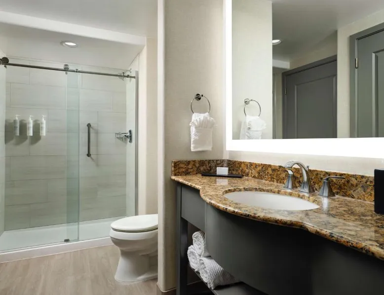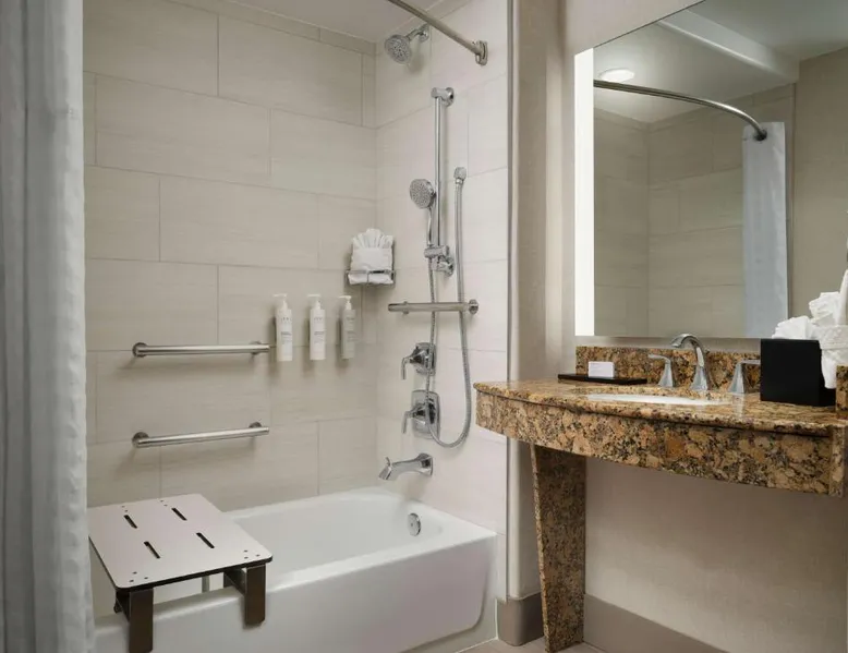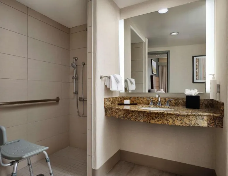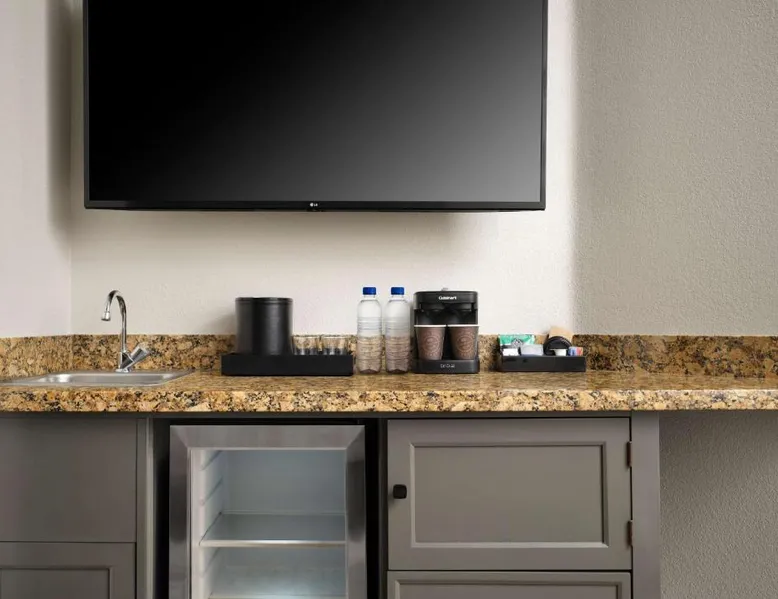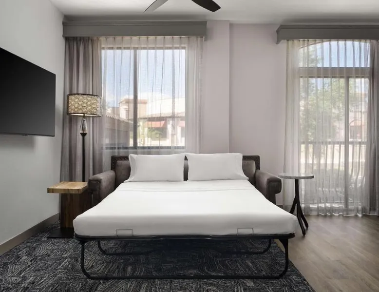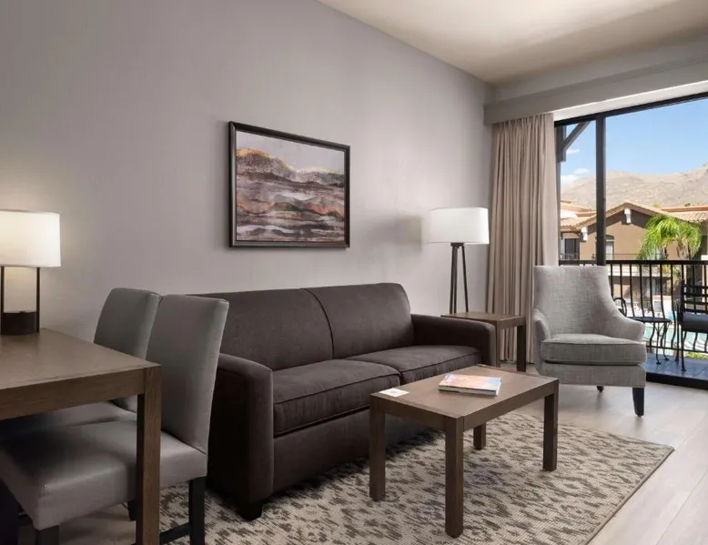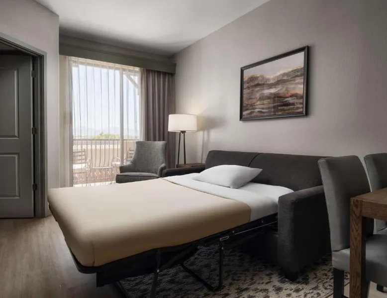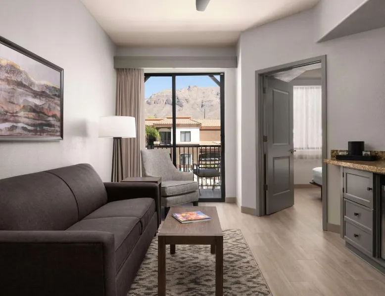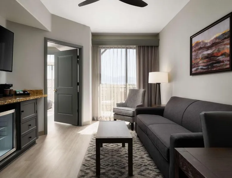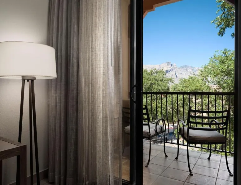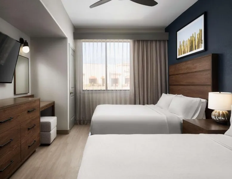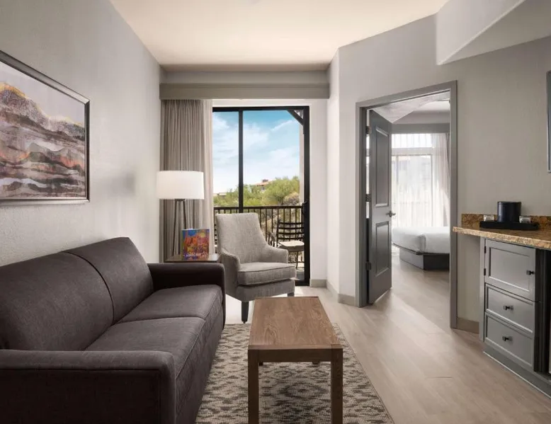 In the foothills of the Santa Catalina Mountains, this all-suite hotel overlooks the Tucson, Arizona skyline, and features spacious 2-room suites filled with a variety of amenities. The accommodations at Embassy Suites Tucson - Paloma Village all feature two 32-inch, flat-screen TVs and high-speed internet access. Guests can appreciate the spacious work areas, as well as the microwaves and refrigerators. Each morning, the Paloma Village Embassy Suites serves a free cooked-to-order breakfast, and the Evening Reception is a great way to relax. Guests can go swimming in the outdoor pool or workout in the state-of-the-art fitness center with Precor equipment. After working in the hotel's 24-hour business center, guests can explore the area on a rented bike. Boasting a balcony, this suite also features air conditioning, a tea and coffee maker and a TV with cable channels. The unit has 2 beds.