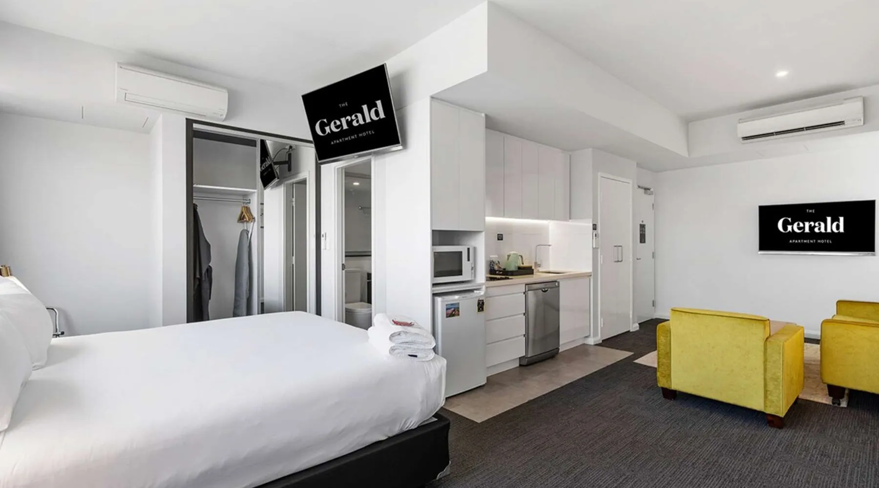 Bringing together attention to detail and exemplary customer service the moment you step foot into the hotel’s lobby, The Gerald Apartment Hotel boasts Geraldton’s only luxury accommodation. Experience a vibe second to none at Geraldton's only Roof Top Bar fondly known as ‘The Old Man and the Sea’. Bob’s Boutique Bar is one of Geraldton’s most exclusive late-night bars. Bob’s has a cosy atmosphere and an extension selection of refined gins, wines, classic spirits, and delicious meals. The space A beautifully appointed room on the top floor of the Gerald, with king size bed, kitchenette, laundry facilities, mini-bar, Wi-Fi, hi-tech entertainment facilities and local phone calls. This corner Studio Apartment is overlooking our delightful city and receives plenty of natural light. Guest access Complimentary car parking is available on site for our guests. We are within easy walking distance to beaches, shops, restaurants, and attractions. Registration Details Exempt