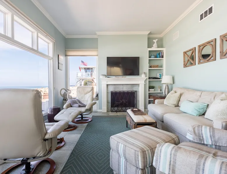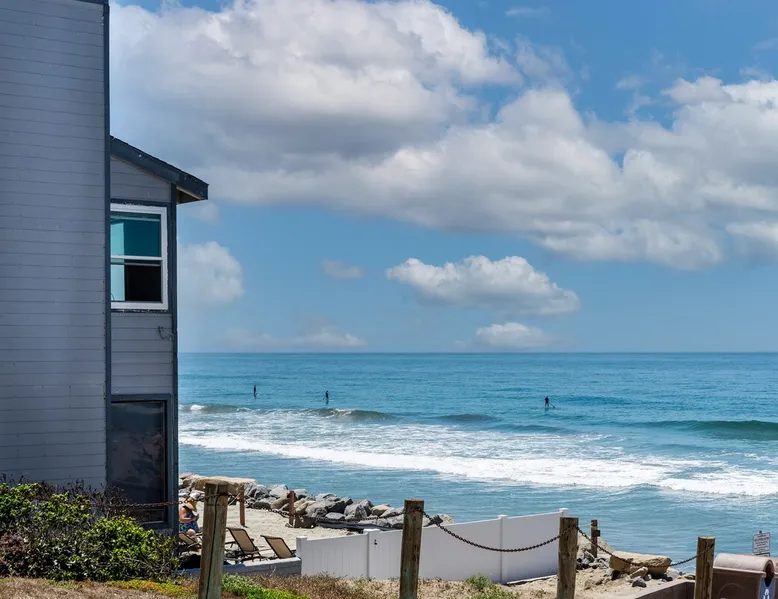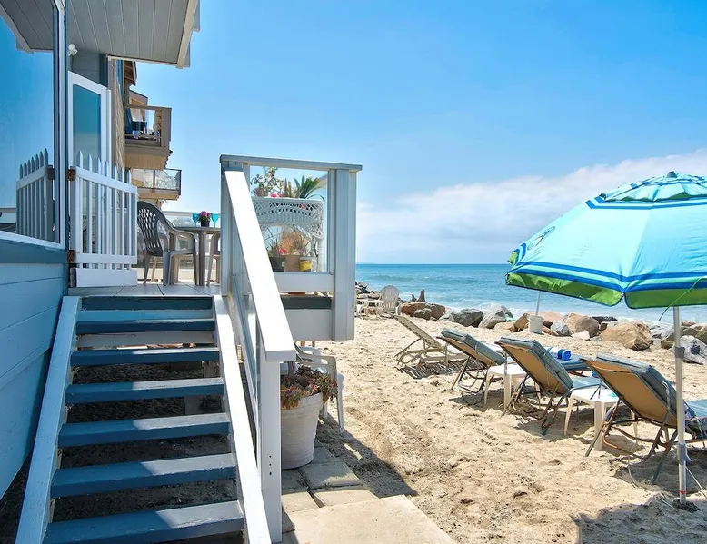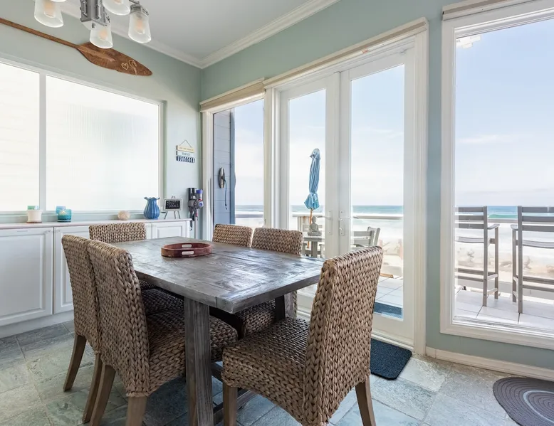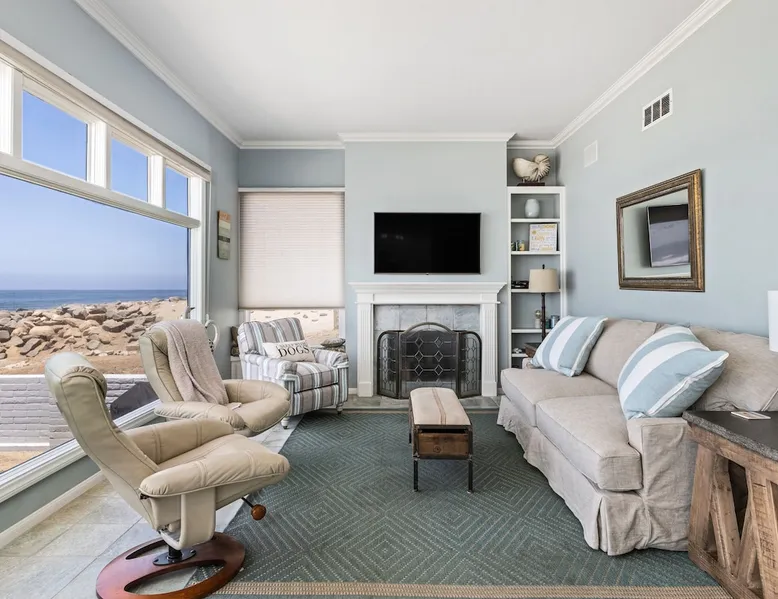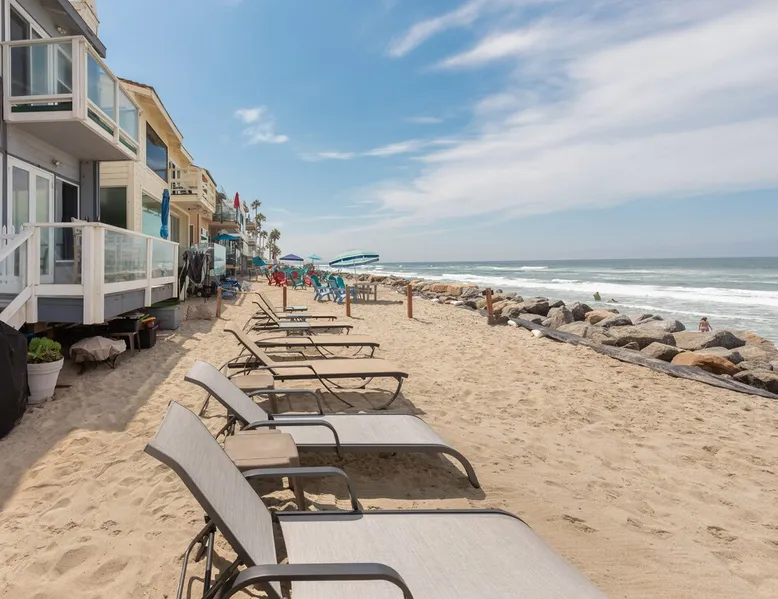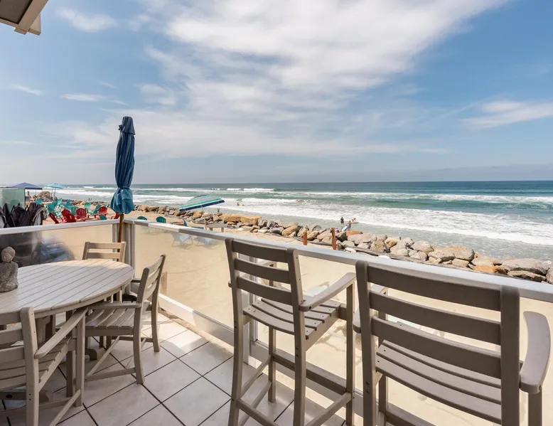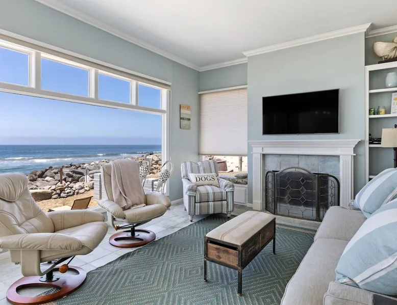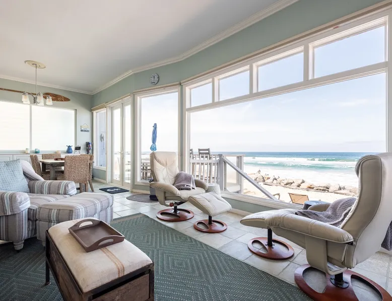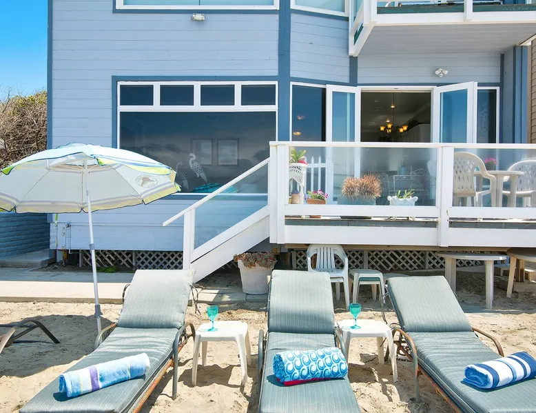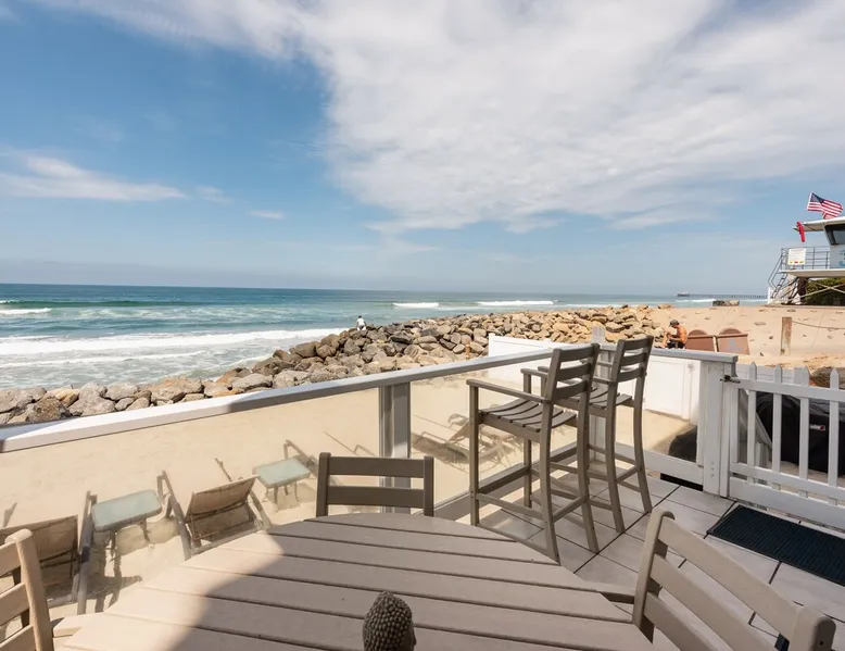 Beautiful ocean sunsets await you from this gorgeous 3 bed 3 bath home right on the sand in South Oceanside! Live in a beautiful home ON the ocean! Swim in the ocean every day, enjoy beautiful sunsets every evening, and fall asleep to the lull of waves splashing every night! The oceanfront deck has a table and chairs for al fresco dining, and just four steps take you down to the beach with a fire pit! Our one car garage and assigned parking space ensures you’ll always have a place to park. A recent renovation features an upgraded kitchen with a Sub-zero refrigerator and new stove, washer and dryer, a fireplace in the living room, 3 flat screen TVs, high speed internet, tumbled marble floors, fresh paint inside & out, beautiful crown molding and custom built cabinetry throughout, custom stained glass windows, and new dual pane windows and doors. The City of Oceanside takes great pride in the results of its recent accomplishments (and ongoing efforts) to create a coastal gem that will soon outlive the town’s reputation as a San Diego best kept secret! The revamped Oceanside Pier area has kiosks that provide everything from ice cream, to bike rentals, to surf gear, to t-shirts! Local restaurants range from hip and trendy, to quaint and family owned- and are available at every budget level. There are pizza stops and coffee shops, martinis bars and craft breweries, ice cream shops and movie theatres, shopping and surfing, locally produced art studios, a farmer’s market by day and street fair with music and a variety of food vendors by night (every Thursday) and of course, a local library! You’ll be over-joyed by the variety of places to choose from, and all within walking distance to your Casa Idea (Dream House) l!! Any one who books through Airbnb acknowledges and