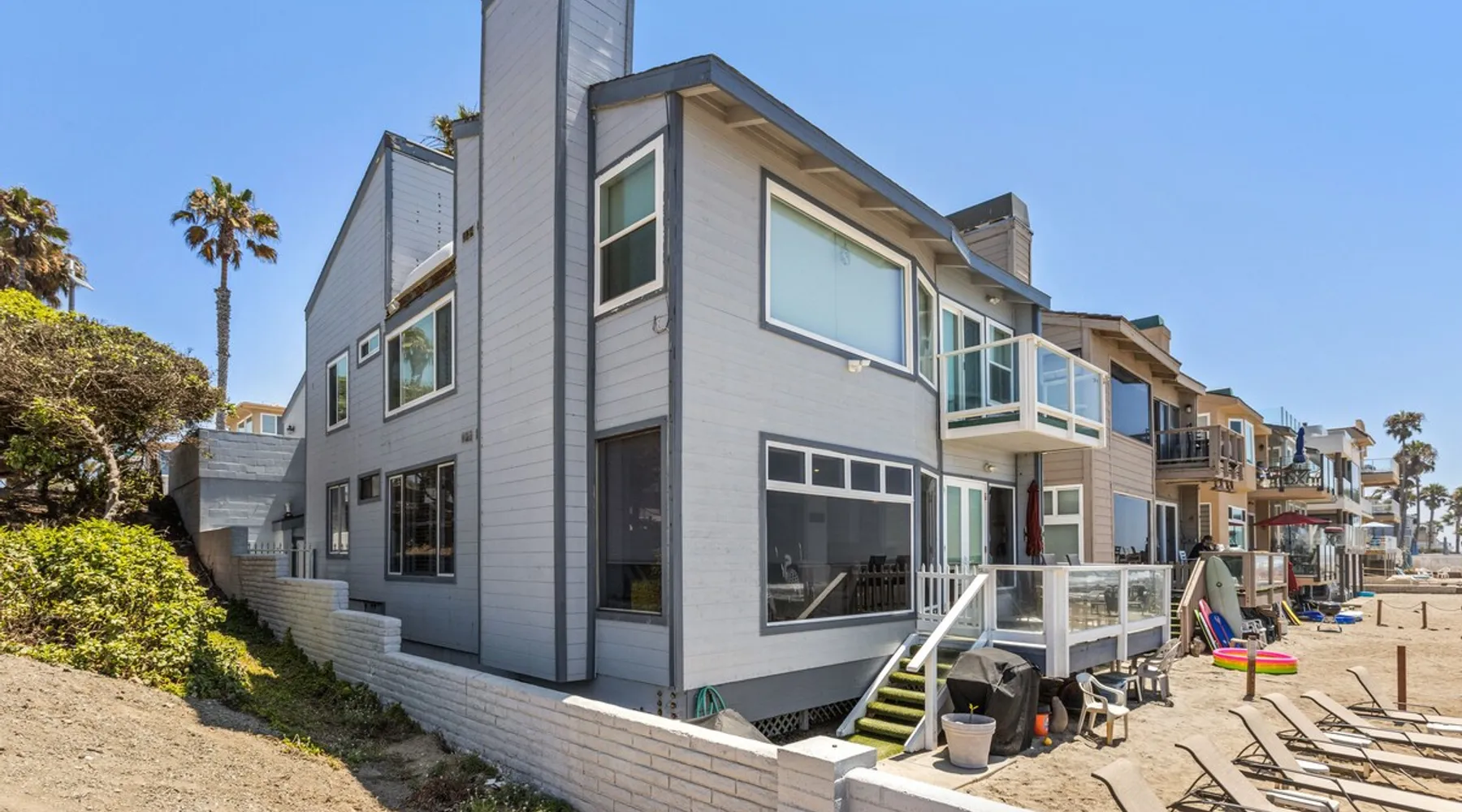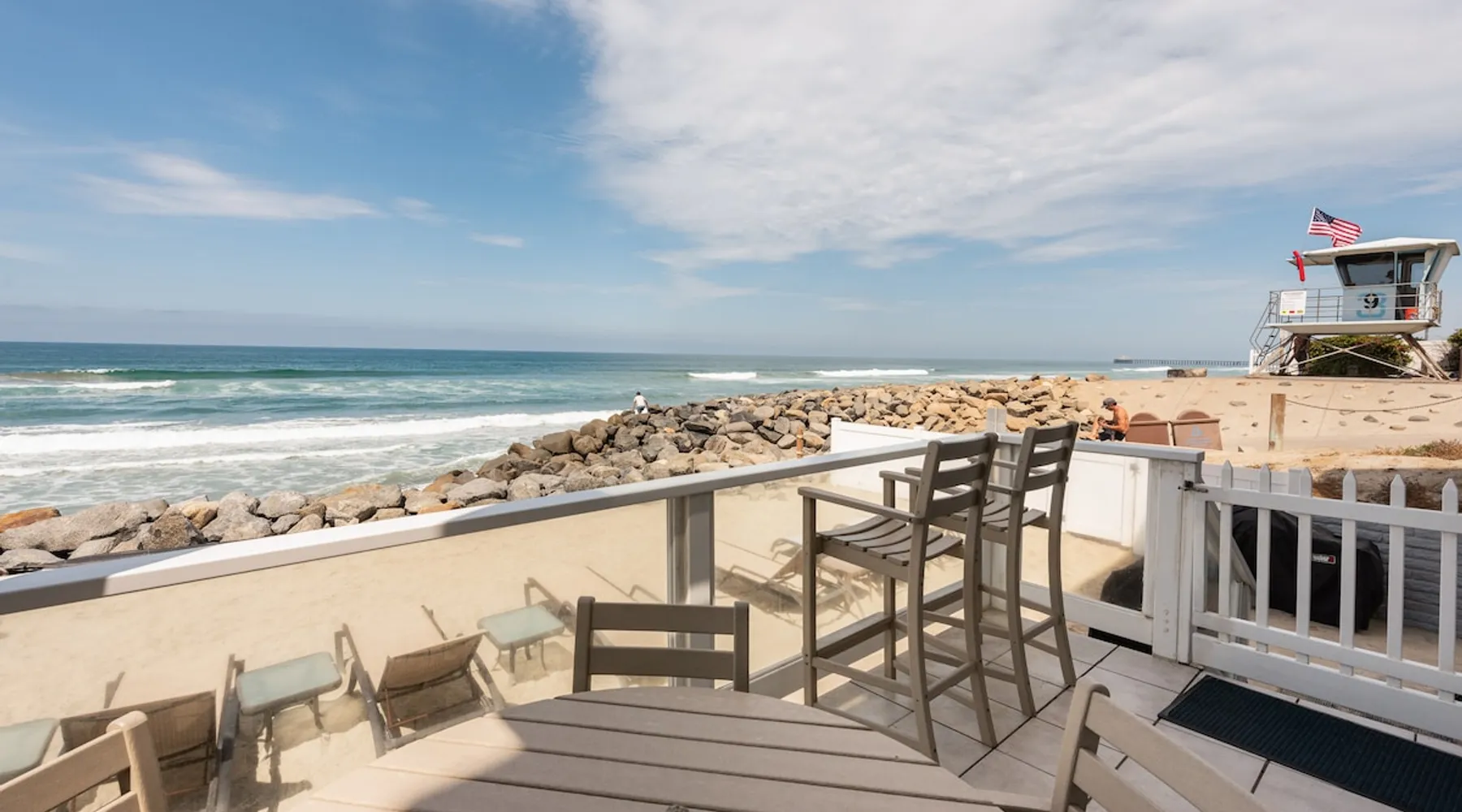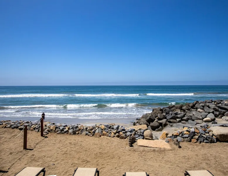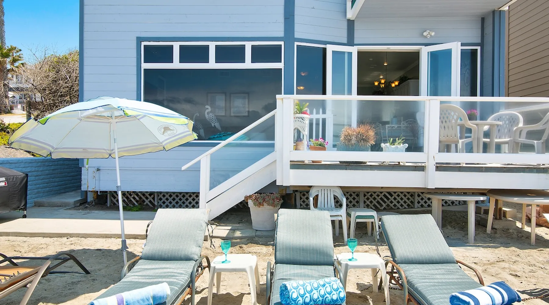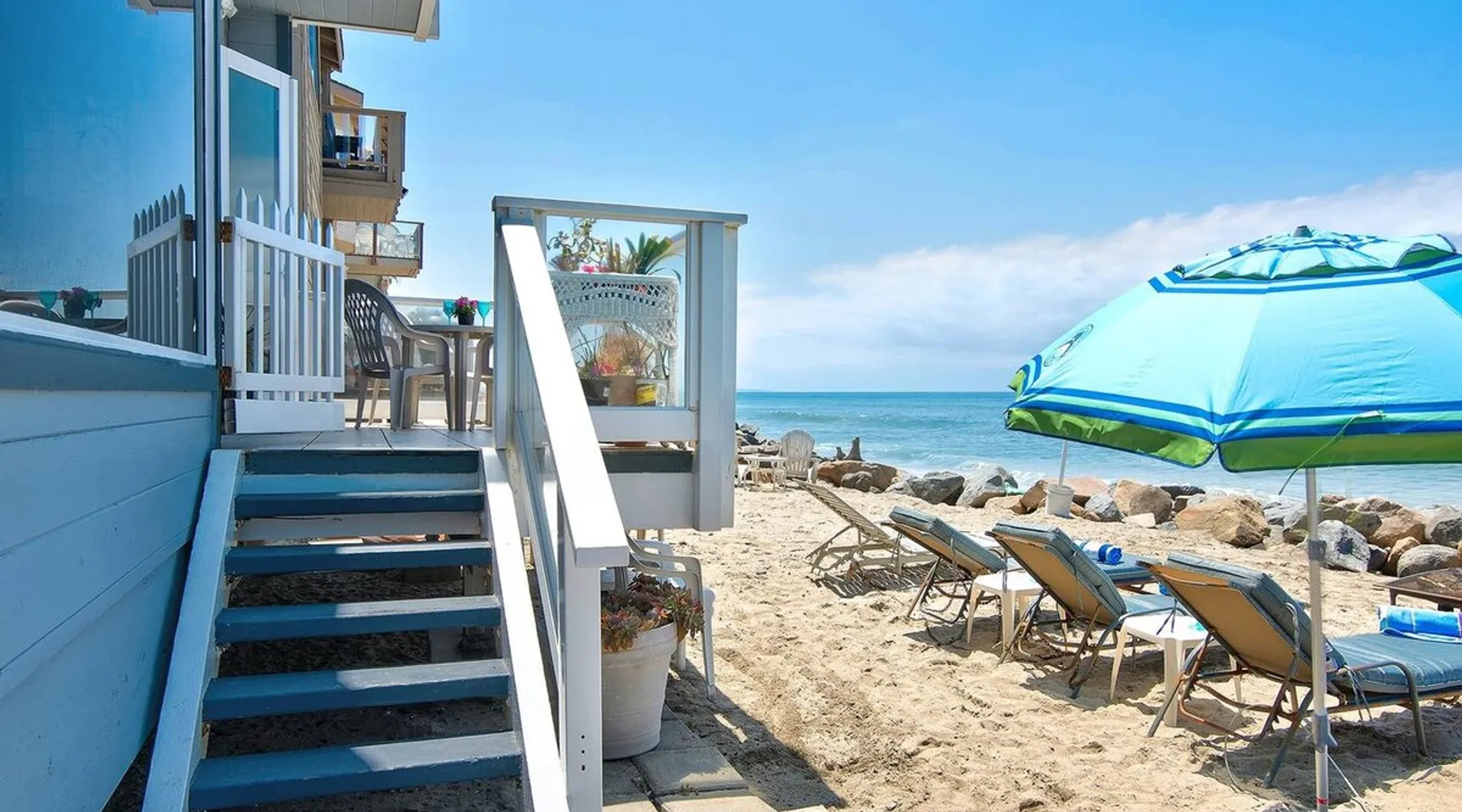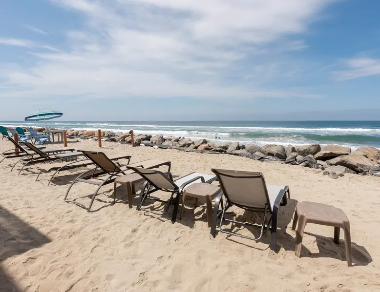 Beautiful ocean sunsets await you from this gorgeous 3 bed 3 bath home right on the sand in South Oceanside! Live in a beautiful home ON the ocean! Swim in the ocean every day, enjoy beautiful sunsets every evening, and fall asleep to the lull of waves splashing every night! The oceanfront deck has a table and chairs for al fresco dining, and just four steps take you down to the beach with a fire pit! Our one car garage and assigned parking space ensures you’ll always have a place to park. A recent renovation features an upgraded kitchen with a Sub-zero refrigerator and new stove, washer and dryer, a fireplace in the living room, 3 flat screen TVs, high speed internet, tumbled marble floors, fresh paint inside & out, beautiful crown molding and custom built cabinetry throughout, custom stained glass windows, and new dual pane windows and doors. The City of Oceanside takes great pride in the results of its recent accomplishments (and ongoing efforts) to create a coastal gem that will soon outlive the town’s reputation as a San Diego best kept secret! The revamped Oceanside Pier area has kiosks that provide everything from ice cream, to bike rentals, to surf gear, to t-shirts! Local restaurants range from hip and trendy, to quaint and family owned- and are available at every budget level. There are pizza stops and coffee shops, martinis bars and craft breweries, ice cream shops and movie theatres, shopping and surfing, locally produced art studios, a farmer’s market by day and street fair with music and a variety of food vendors by night (every Thursday) and of course, a local library! You’ll be over-joyed by the variety of places to choose from, and all within walking distance to your Casa Idea (Dream House) l!! Any one who books through Airbnb acknowledges and