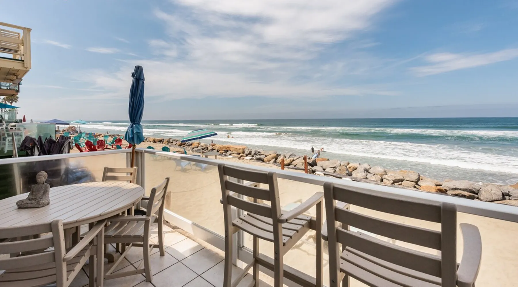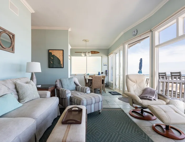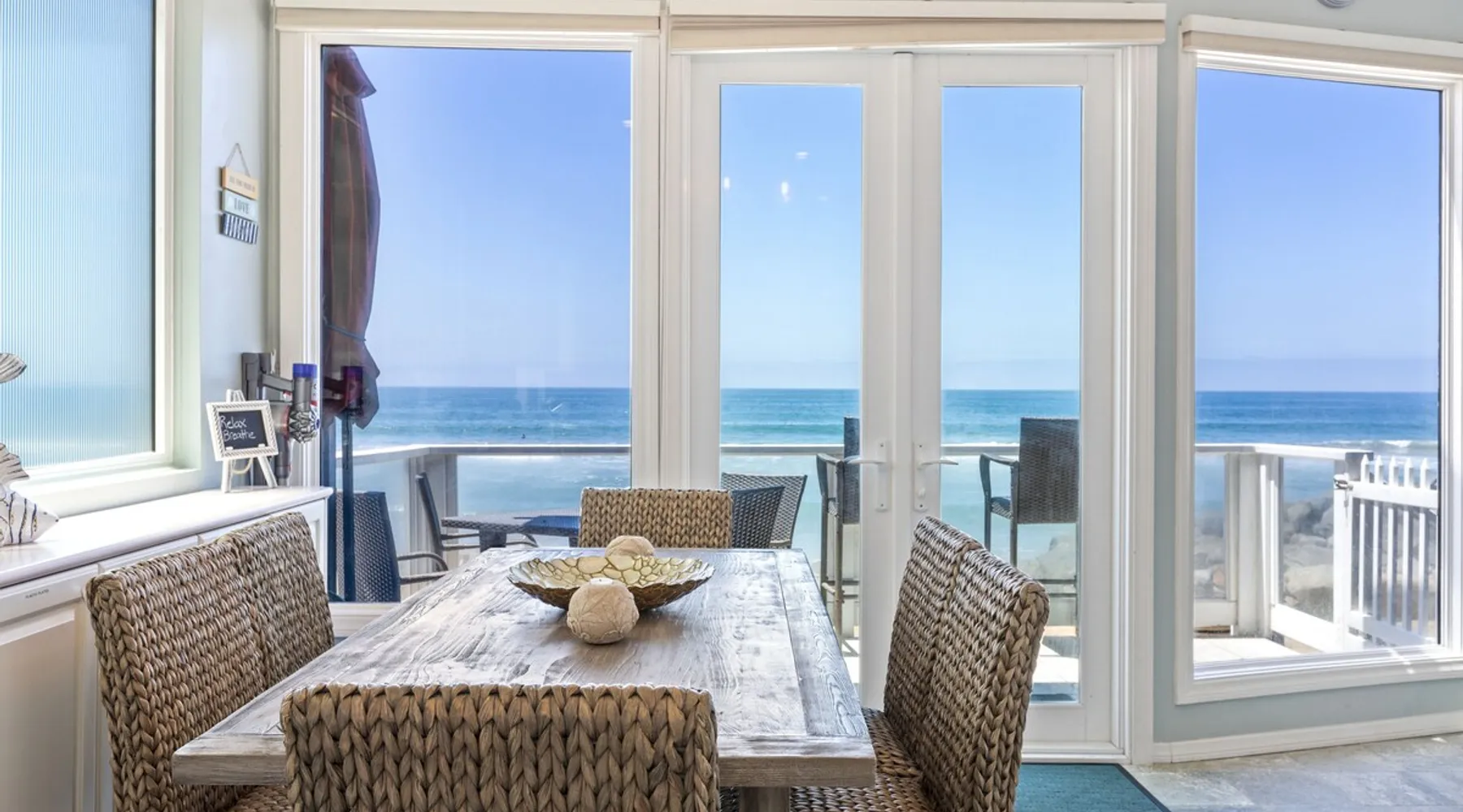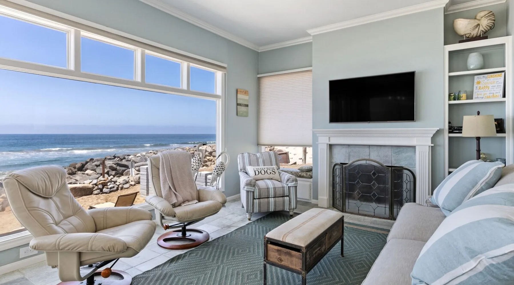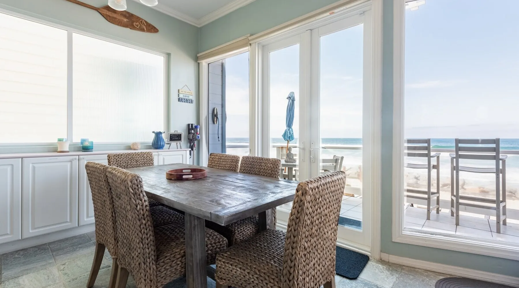 Beautiful ocean sunsets await you from this gorgeous 3 bed 3 bath home right on the sand in South Oceanside! Live in a beautiful home ON the ocean! Swim in the ocean every day, enjoy beautiful sunsets every evening, and fall asleep to the lull of waves splashing every night! The oceanfront deck has a table and chairs for al fresco dining, and just four steps take you down to the beach with a fire pit! Our one car garage and assigned parking space ensures you’ll always have a place to park. A recent renovation features an upgraded kitchen with a Sub-zero refrigerator and new stove, washer and dryer, a fireplace in the living room, 3 flat screen TVs, high speed internet, tumbled marble floors, fresh paint inside & out, beautiful crown molding and custom built cabinetry throughout, custom stained glass windows, and new dual pane windows and doors. The City of Oceanside takes great pride in the results of its recent accomplishments (and ongoing efforts) to create a coastal gem that will soon outlive the town’s reputation as a San Diego best kept secret! The revamped Oceanside Pier area has kiosks that provide everything from ice cream, to bike rentals, to surf gear, to t-shirts! Local restaurants range from hip and trendy, to quaint and family owned- and are available at every budget level. There are pizza stops and coffee shops, martinis bars and craft breweries, ice cream shops and movie theatres, shopping and surfing, locally produced art studios, a farmer’s market by day and street fair with music and a variety of food vendors by night (every Thursday) and of course, a local library! You’ll be over-joyed by the variety of places to choose from, and all within walking distance to your Casa Idea (Dream House) l!! Any one who books through Airbnb acknowledges and
