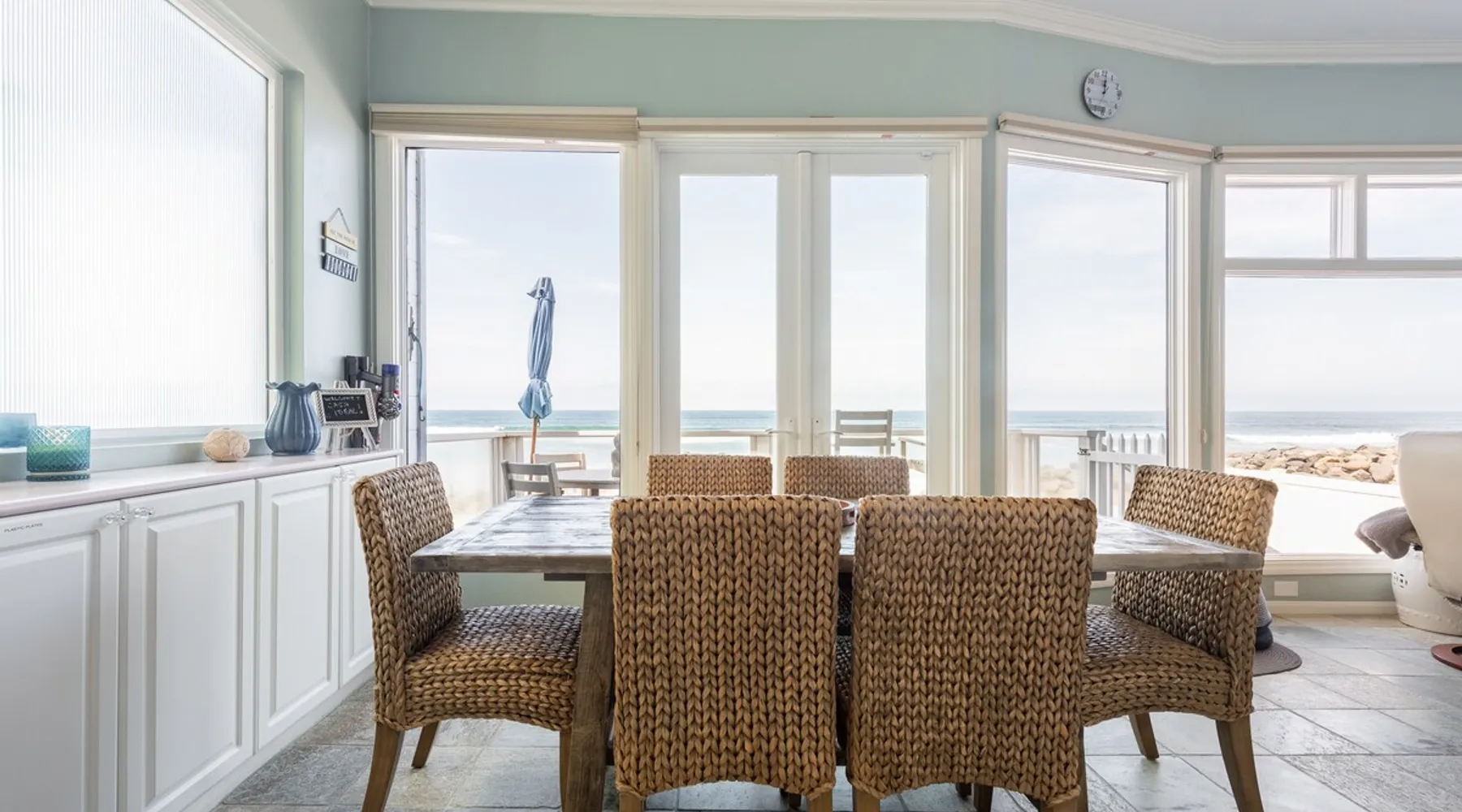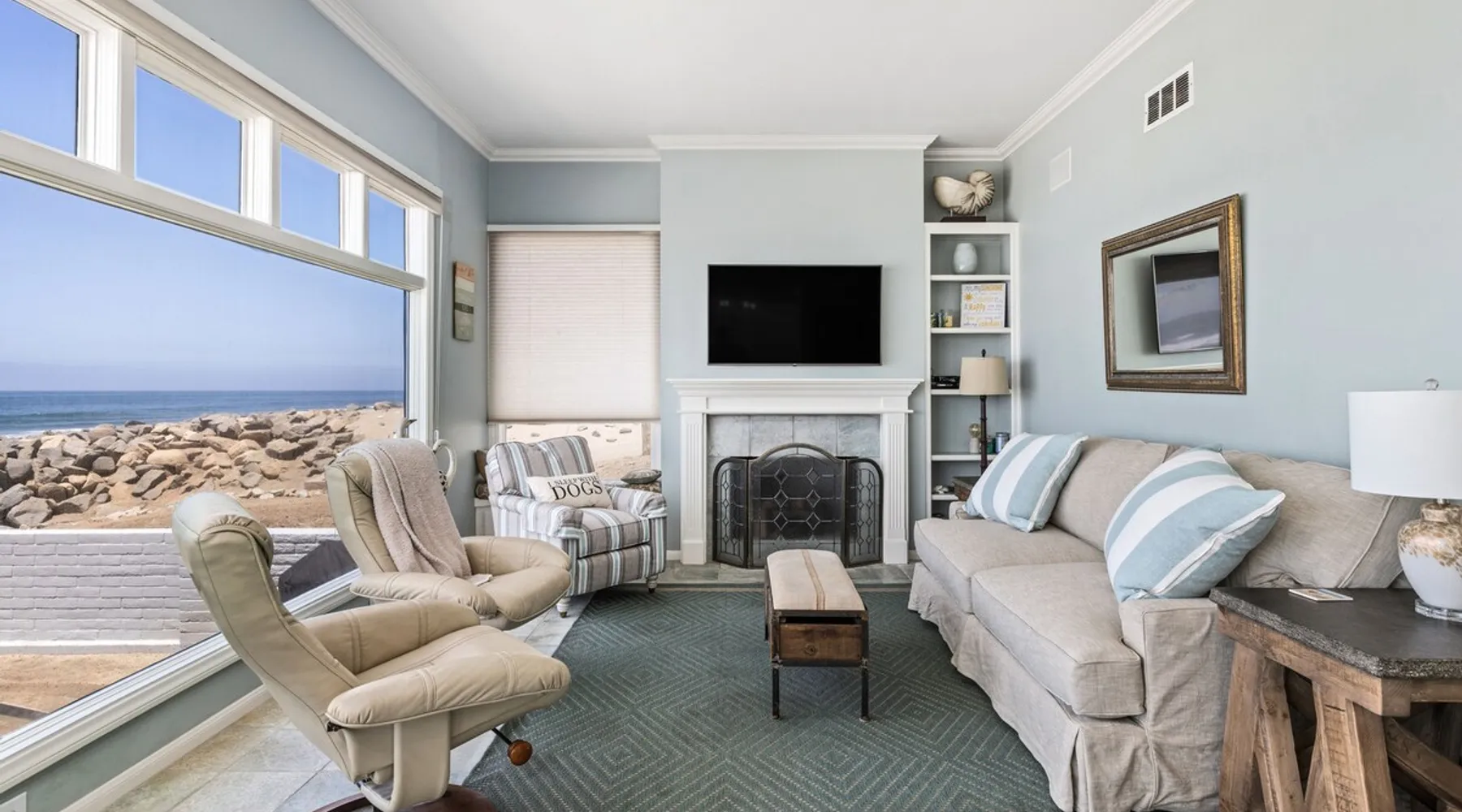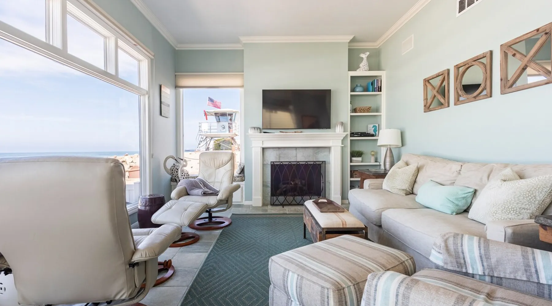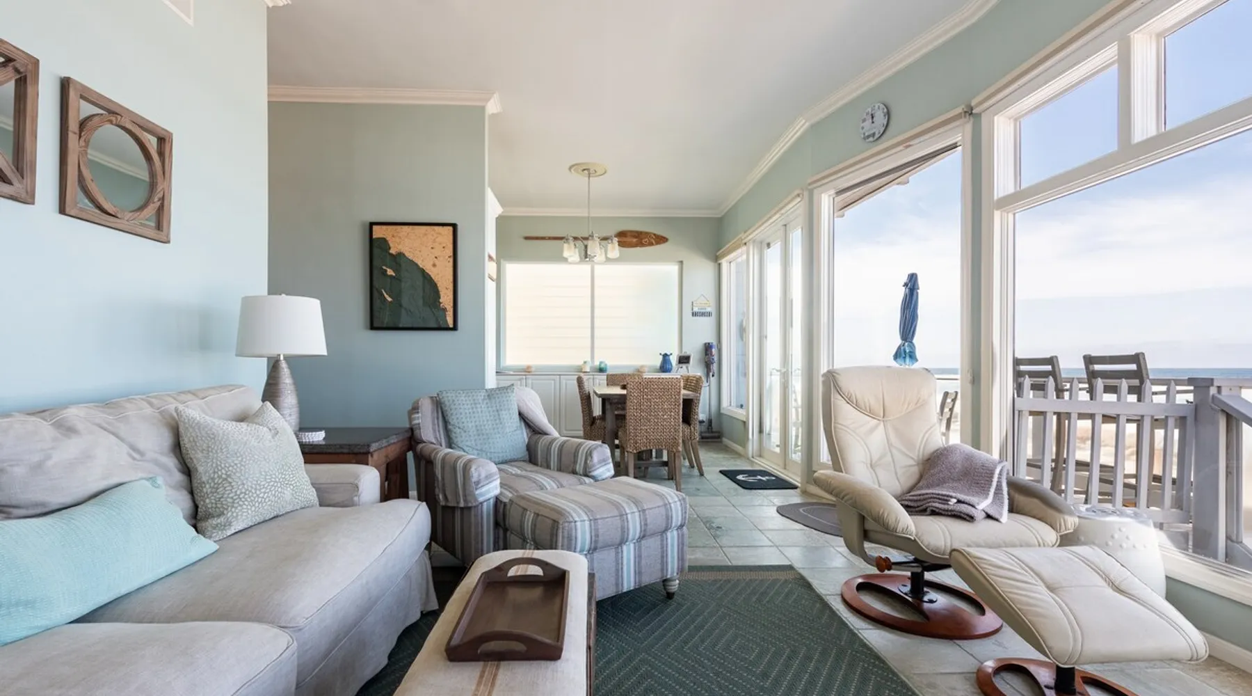 Beautiful ocean sunsets await you from this gorgeous 3 bed 3 bath home right on the sand in South Oceanside! Live in a beautiful home ON the ocean! Swim in the ocean every day, enjoy beautiful sunsets every evening, and fall asleep to the lull of waves splashing every night! The oceanfront deck has a table and chairs for al fresco dining, and just four steps take you down to the beach with a fire pit! Our one car garage and assigned parking space ensures you’ll always have a place to park. A recent renovation features an upgraded kitchen with a Sub-zero refrigerator and new stove, washer and dryer, a fireplace in the living room, 3 flat screen TVs, high speed internet, tumbled marble floors, fresh paint inside & out, beautiful crown molding and custom built cabinetry throughout, custom stained glass windows, and new dual pane windows and doors. The City of Oceanside takes great pride in the results of its recent accomplishments (and ongoing efforts) to create a coastal gem that will soon outlive the town’s reputation as a San Diego best kept secret! The revamped Oceanside Pier area has kiosks that provide everything from ice cream, to bike rentals, to surf gear, to t-shirts! Local restaurants range from hip and trendy, to quaint and family owned- and are available at every budget level. There are pizza stops and coffee shops, martinis bars and craft breweries, ice cream shops and movie theatres, shopping and surfing, locally produced art studios, a farmer’s market by day and street fair with music and a variety of food vendors by night (every Thursday) and of course, a local library! You’ll be over-joyed by the variety of places to choose from, and all within walking distance to your Casa Idea (Dream House) l!! Any one who books through Airbnb acknowledges and