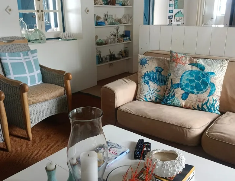 A charming fisherman's cottage -style home with 5 bedrooms and 5 bathrooms to sleep 8 - 10 people. Undercover and outside braai area with family size dining table, couch and chairs to relax on. Smart TV's and free wifi. Sparkling swimmingpool in an enclosed garden. A safety cover for pool available. 5 min walk away from a private and safe beach. Security Estate.