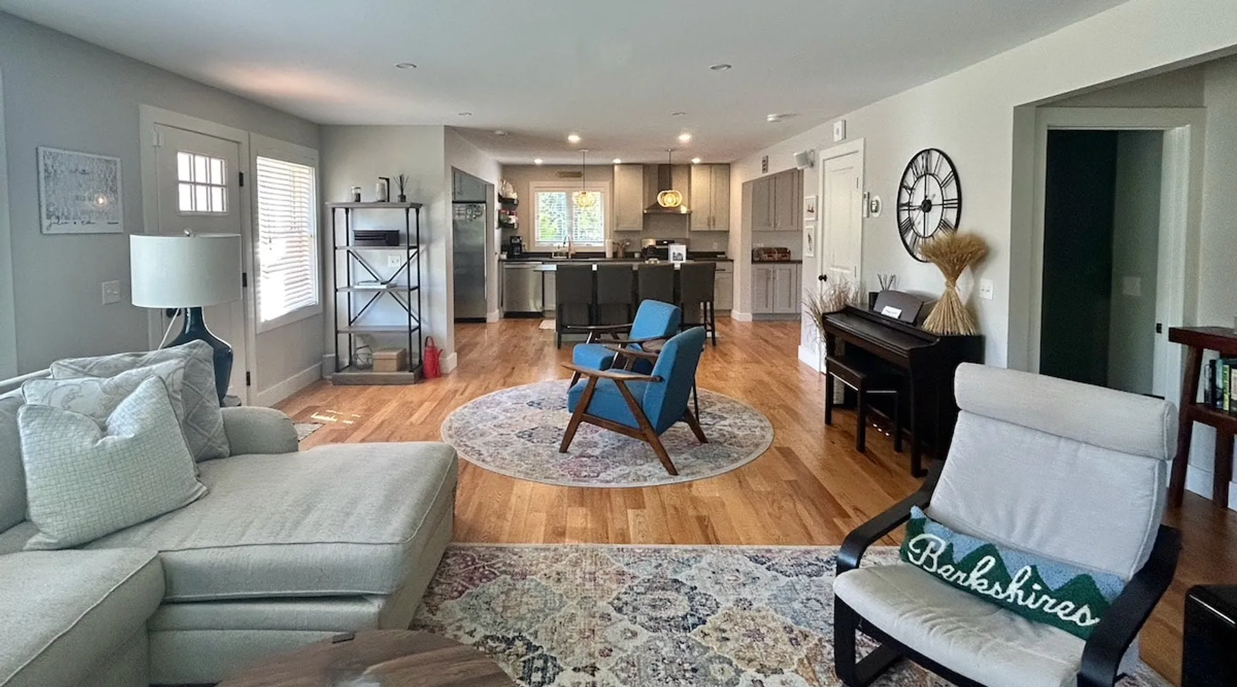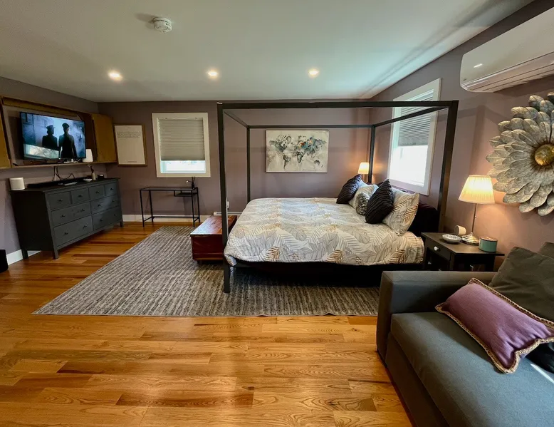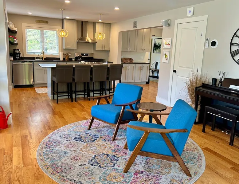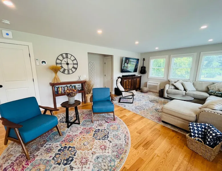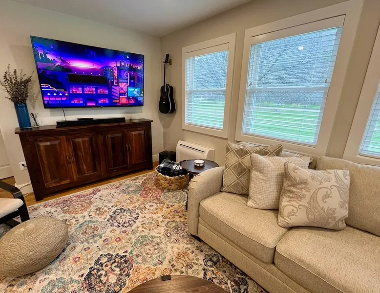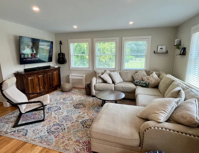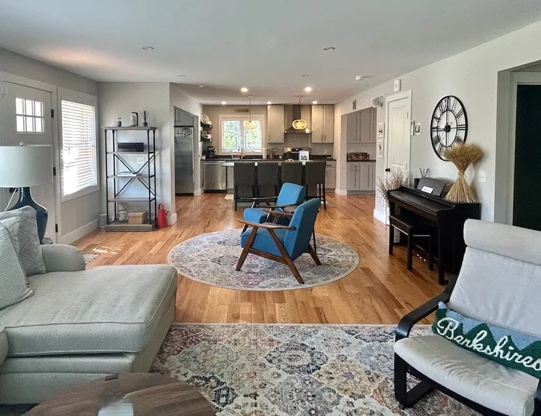 Amenities: 4 bedrooms, 3 baths, main floor master suite with a large walk in shower, hot tub, high speed internet, 5 Smart TVs, Sonos sound system, Ping Pong, Foosball, Nintendo Wii, mini-split air conditioners throughout, new appliances including a gas range, washer/dryer, EV car charger, standard drip coffeemaker, and a dishwasher. Outside you will find beautiful mountain views, a 2 fire-pits, outdoor seating, propane BBQ & more! Pets are considered with a pet fee. NO SMOKING. The space Main Floor: This perfectly renovated, open concept home is full of natural light, mountain views, and stylish touches throughout. The home is situated beautifully between 2 mountains and is only a short walk from the Appalachian Trail, which is perfect for anyone who loves to hike! The bright and open living room consists of comfortable seating and a large smart TV with Roku streaming channels. There are plenty of fun board games and puzzles to keep friends and family entertained. Just off of the living room is the well appointed kitchen that has brand new appliances, tons of storage, a large kitchen island with seating and lots of prep space for the home chef. Next to the kitchen is the dining room with a table that comfortably seats 10+. The large main floor master suite boasts a king size bed, smart TV with streaming channels, a queen size sleeper sofa, and an en suite bathroom with a large glass and tile walk-in shower. Just off of the living room is another bedroom with a queen size bed. There is an additional full bathroom with a tub/shower combination. Lastly, the the washer and dryer is also located on the main floor for the guest's convenience. Upstairs, there are 2 more bedrooms and a full bathroom with a tub/shower combination. One bedroom has 2 queen size beds and a Roku TV, while the other has 2 bunk beds (double on the bottom and single on top) and a twin size bed. This bedroom can sleep 4 adults comfortably or 7 kids. At the top of the stairs, on the landing, there is a comfortable reading chair to soak up the sun and catch up on your latest book. Lower level Playroom: Guests can enjoy the newly finished basement with 2 TVs, foosball table, and ping pong! There is a Nintendo Wii with 20+ games and 6 controllers. It is the perfect hang out space for kids and parents alike looking for a fun place to unwind after a busy day sight-seeing or skiing. Outside: Is a fabulous outdoor patio with lots of seating, a large fire pit, a hot tub that sits 4 to 6 people, and a propane BBQ grill. There are beautiful Mountain Views and the Appalachian Trail is only a short walk away, so you can literally walk outside your door and go for a hike. This terrific location is less than 10 minutes to Great Barrington, 15 minutes to Stockbridge, and just 25 minutes to Tanglewood! See House Rules for additional reservation details Guest access Guests have access to the entire property. Other things to note Please see House Rules.