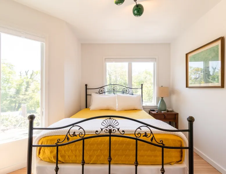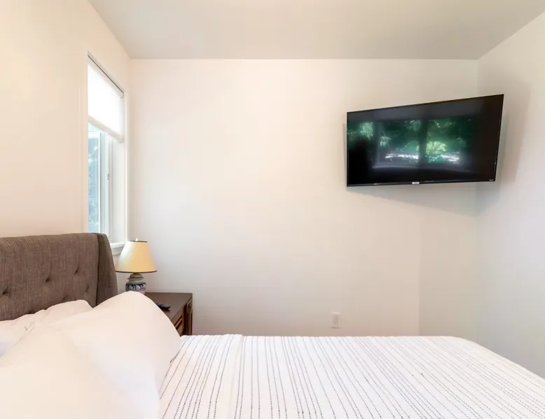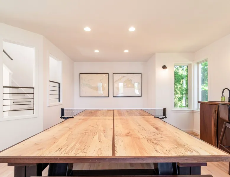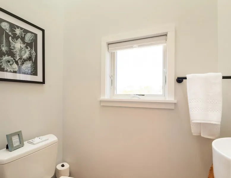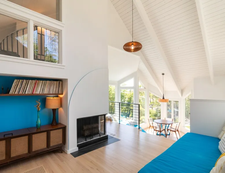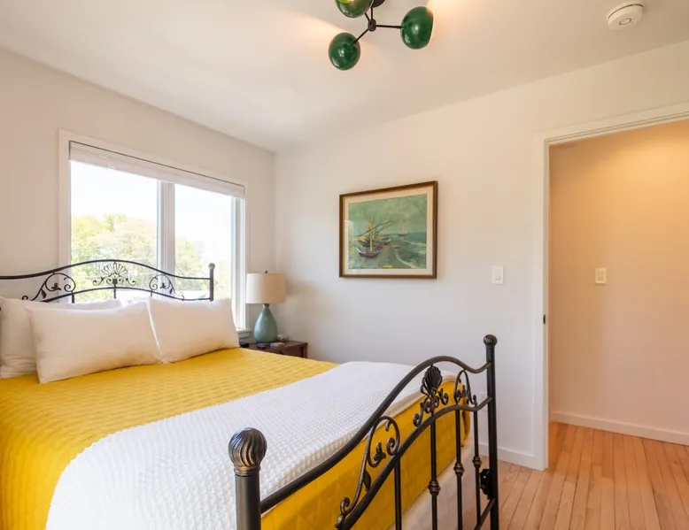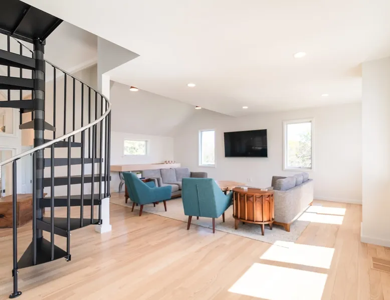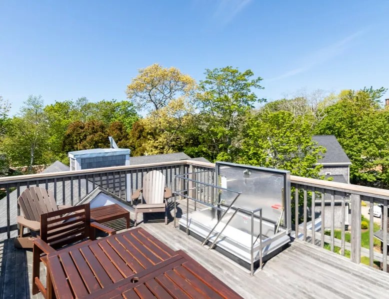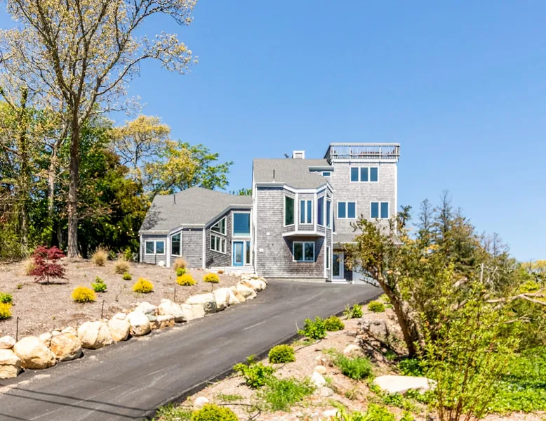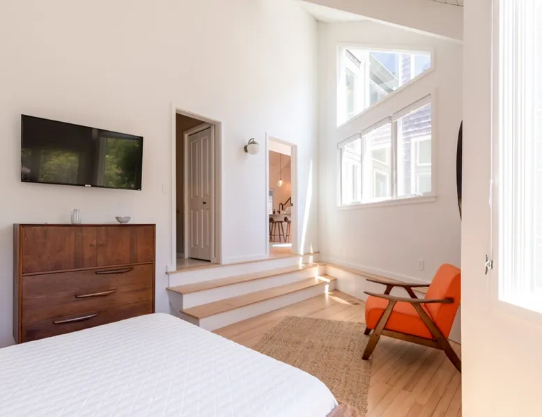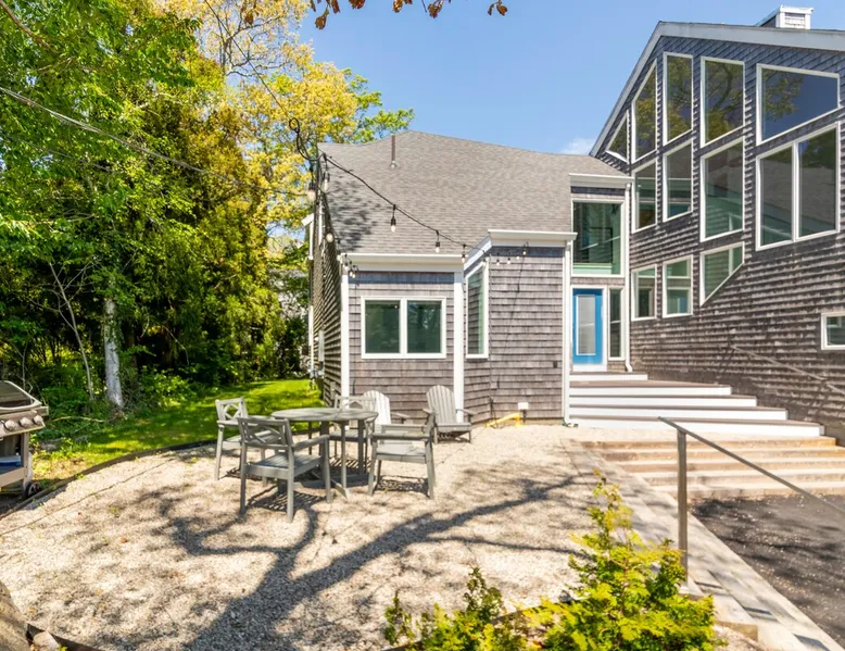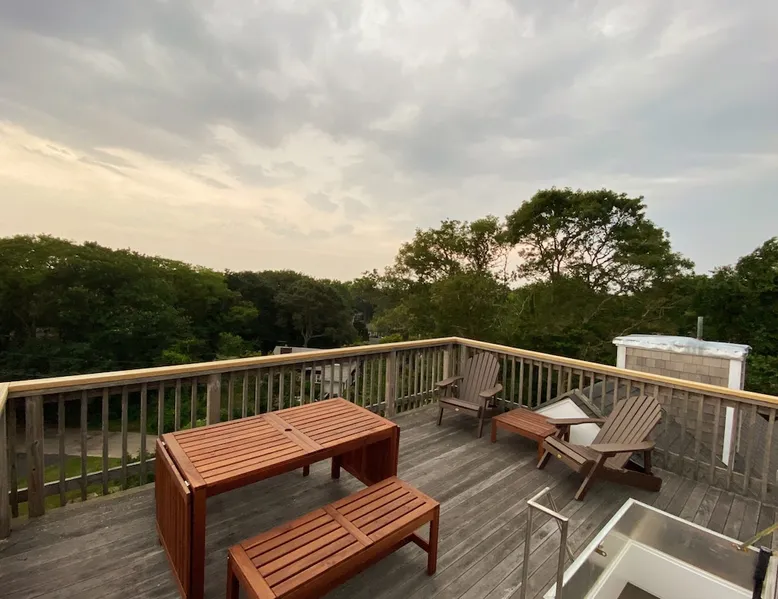 Beautiful modern masterpiece down a quiet street with quick access to Woods Hole, Shining Sea Bikeway, and the Vineyard ferry. This architecturally significant house was designed by the renowned postmodern architect Charles Moore and built in 1969. An addition providing ample entertaining space - including a dining room, den, loft, and roof deck - was completed in 2021, along with top to bottom refinishing of all rooms. This house has mid-century charm in spades with all the modern conveniences. The space The house offers 4 bedrooms each with a queen bed and private full bathroom, and each on its own level that provides ample privacy for those sharing this impressive house. The entrance opens into a foyer adjacent to an open concept kitchen with peninsula seating for 4. Continuing to the back of the house is a large dining room with a wet bar and custom designed dining table that comfortably seats 10, and can also function as a ping pong table (net, paddles, and balls provided!). Also on the main level is a full bathroom with shower stall, a laundry closet with washer and dryer, and the first bedroom. Adjacent to the main entrance, and three steps down, is a large bedroom with an en suite with shower/tub. Back in the kitchen, and past the coffee bar - complete with espresso machine, drip, and Keurig - is another bedroom that is down one flight and is adjacent to another full bath with shower stall. The master bedroom is found upstairs, part of a 4 room suite that includes a sitting room with desk and loveseat, designer bathroom, and a built-in twin sized day bed - perfect for younger ones. Three staircases lead to the second floor (also a catwalk away from the upstairs bedroom) which offers plenty of room for your group to spread out: whether it’s reading a book at the cozy living room window seat while listening to the console record player, catching up on your streaming in the den, playing a game in the breakfast room, finishing a puzzle in the loft which includes a futon couch (up a spiral stair), or enjoying the roof deck (accessible via ship’s ladder) with panoramic views of Martha’s vineyard and surrounding waters. Adjacent to the den are bookcases full of games and books for your enjoyment, and a powder room. Additional outdoor space is off the main entrance: a lit peastone patio with outdoor table seating for 4 and a pair of Adirondack chairs to relax in. An outdoor shower rounds out the exterior amenities. The house is equipped with three zone central air conditioning, 4K streaming Roku TVs in each bedroom, high speed internet, and a fully equipped kitchen that includes microwave, dishwasher, and 5 burner gas range. An outdoor 50 amp outlet is available for charging your electric vehicle. Guest access The neighborhood is quiet with minimal street traffic, but provides quick and easy access to all that you want from your Cape vacation: a 4 minute walk (0.2 miles) to the Shining Sea Bikeway, 10 minute walk (0.5 miles) to downtown Woods Hole, 12 minute walk (0.6 miles) to the Martha’s Vineyard Ferry, a 7 minute bike ride to Surf Drive beach via the Bikeway, and a 7 minute drive to downtown Falmouth. Other things to note The house, the common areas, and bedrooms are split on several levels with many stairs leading between, and may not be optimal for young children or those with limited mobility.