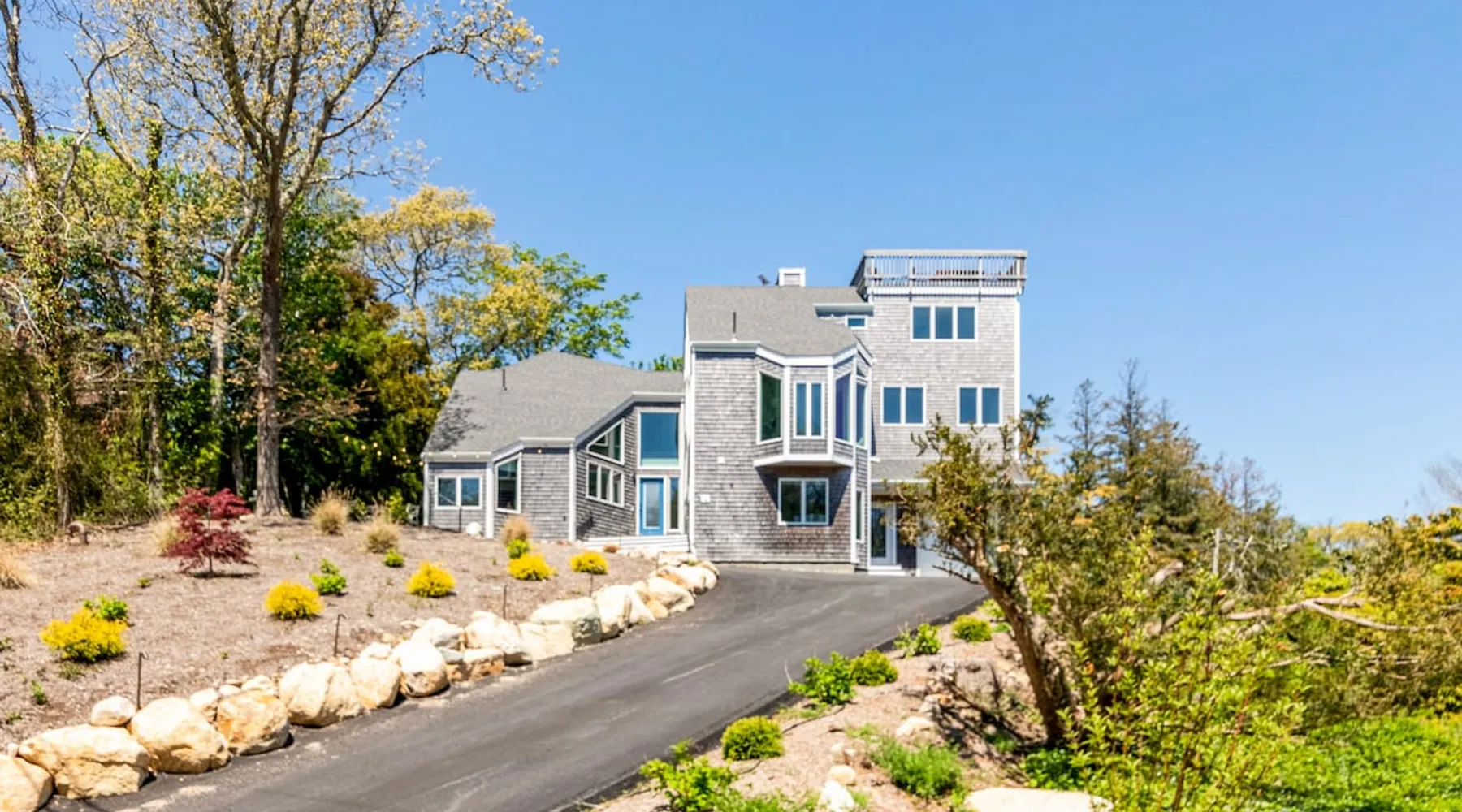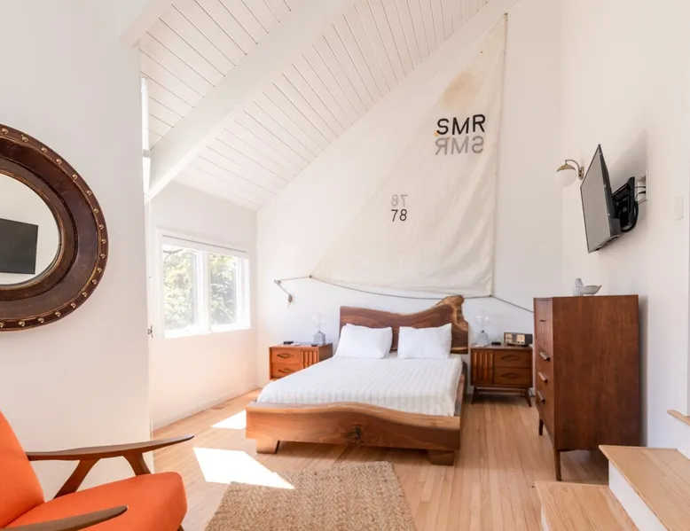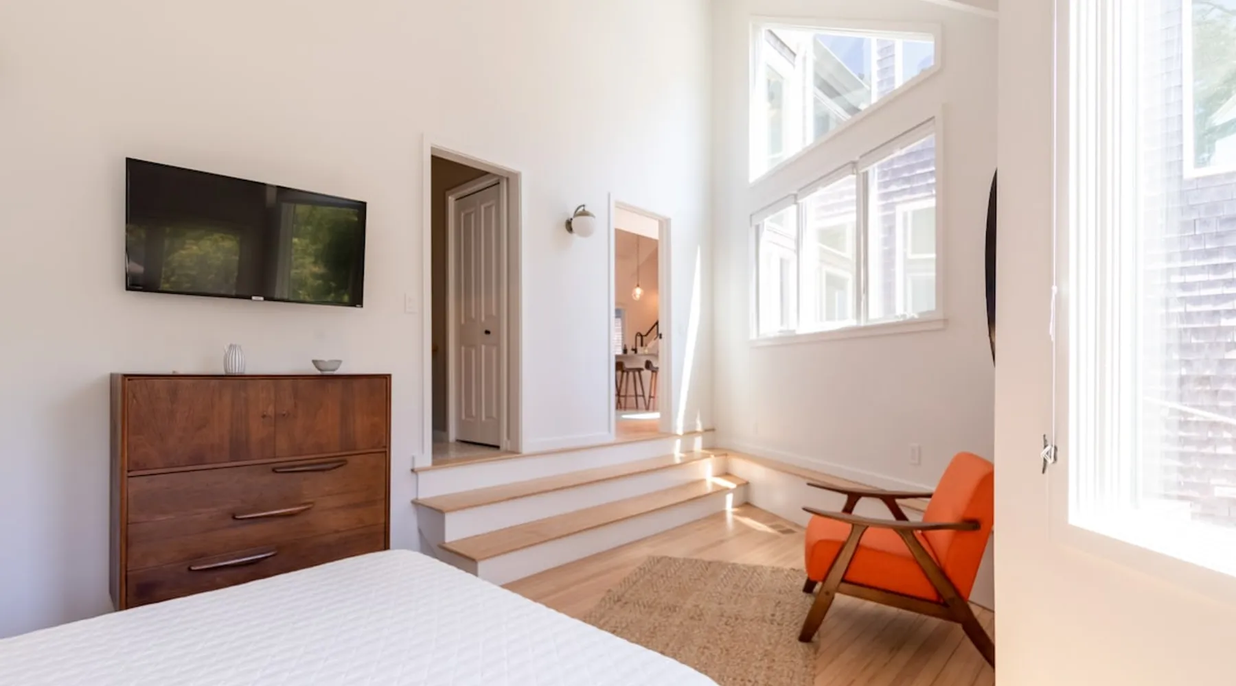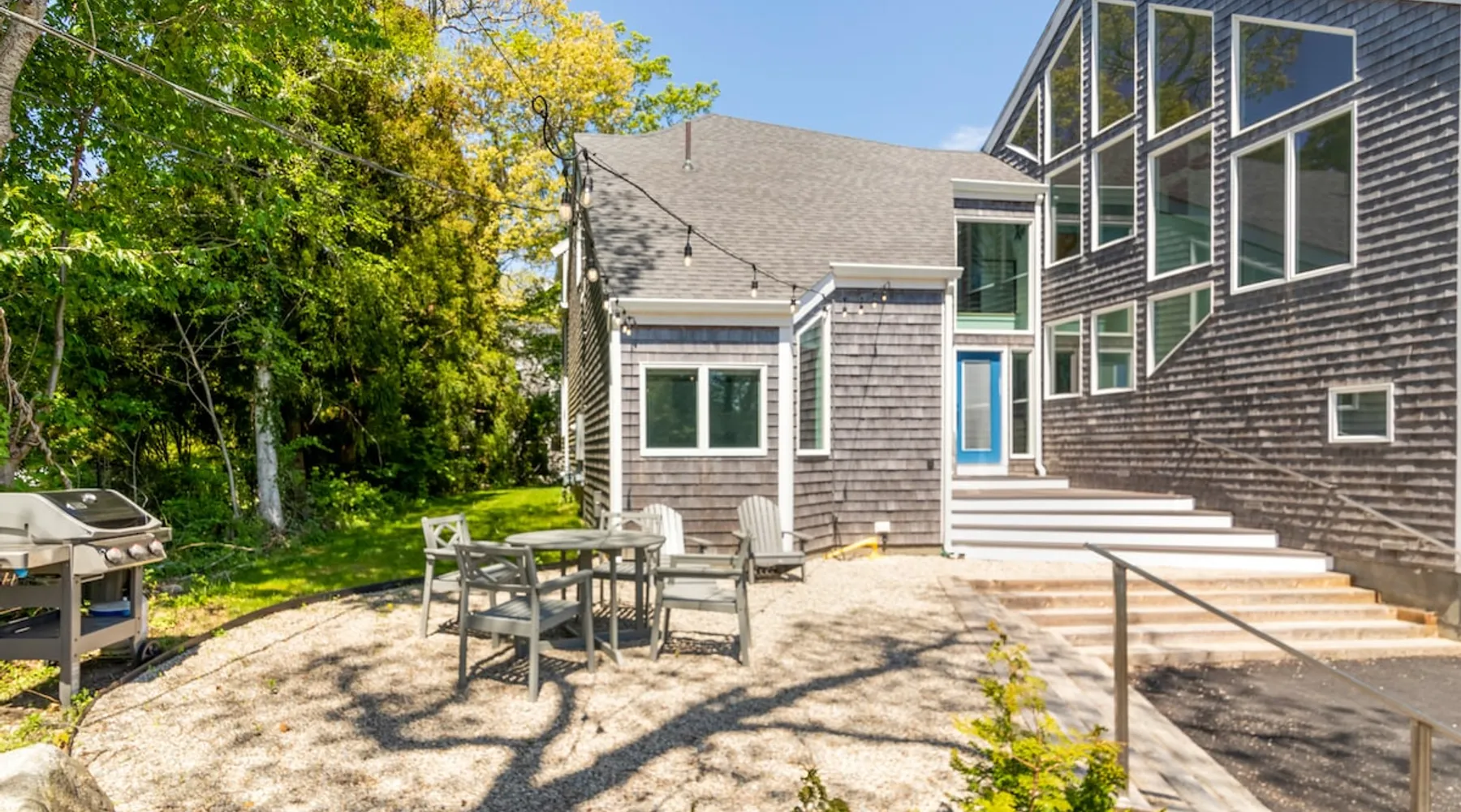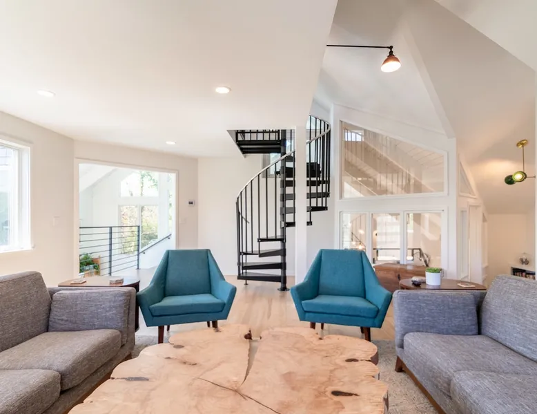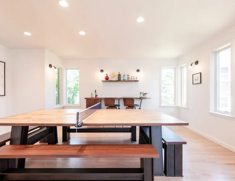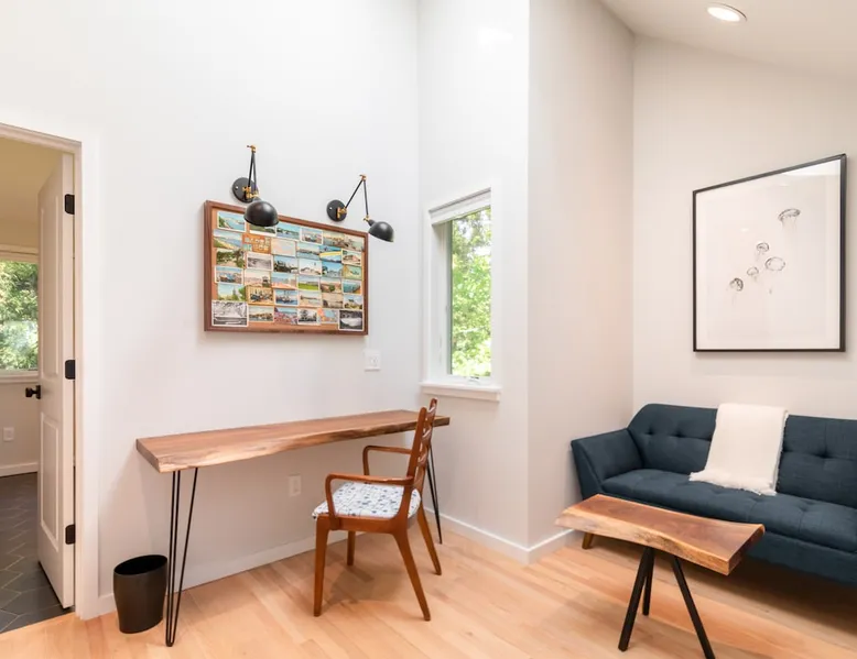 Beautiful modern masterpiece down a quiet street with quick access to Woods Hole, Shining Sea Bikeway, and the Vineyard ferry. This architecturally significant house was designed by the renowned postmodern architect Charles Moore and built in 1969. An addition providing ample entertaining space - including a dining room, den, loft, and roof deck - was completed in 2021, along with top to bottom refinishing of all rooms. This house has mid-century charm in spades with all the modern conveniences. The space The house offers 4 bedrooms each with a queen bed and private full bathroom, and each on its own level that provides ample privacy for those sharing this impressive house. The entrance opens into a foyer adjacent to an open concept kitchen with peninsula seating for 4. Continuing to the back of the house is a large dining room with a wet bar and custom designed dining table that comfortably seats 10, and can also function as a ping pong table (net, paddles, and balls provided!). Also on the main level is a full bathroom with shower stall, a laundry closet with washer and dryer, and the first bedroom. Adjacent to the main entrance, and three steps down, is a large bedroom with an en suite with shower/tub. Back in the kitchen, and past the coffee bar - complete with espresso machine, drip, and Keurig - is another bedroom that is down one flight and is adjacent to another full bath with shower stall. The master bedroom is found upstairs, part of a 4 room suite that includes a sitting room with desk and loveseat, designer bathroom, and a built-in twin sized day bed - perfect for younger ones. Three staircases lead to the second floor (also a catwalk away from the upstairs bedroom) which offers plenty of room for your group to spread out: whether it’s reading a book at the cozy living room window seat while listening to the console record player, catching up on your streaming in the den, playing a game in the breakfast room, finishing a puzzle in the loft which includes a futon couch (up a spiral stair), or enjoying the roof deck (accessible via ship’s ladder) with panoramic views of Martha’s vineyard and surrounding waters. Adjacent to the den are bookcases full of games and books for your enjoyment, and a powder room. Additional outdoor space is off the main entrance: a lit peastone patio with outdoor table seating for 4 and a pair of Adirondack chairs to relax in. An outdoor shower rounds out the exterior amenities. The house is equipped with three zone central air conditioning, 4K streaming Roku TVs in each bedroom, high speed internet, and a fully equipped kitchen that includes microwave, dishwasher, and 5 burner gas range. An outdoor 50 amp outlet is available for charging your electric vehicle. Guest access The neighborhood is quiet with minimal street traffic, but provides quick and easy access to all that you want from your Cape vacation: a 4 minute walk (0.2 miles) to the Shining Sea Bikeway, 10 minute walk (0.5 miles) to downtown Woods Hole, 12 minute walk (0.6 miles) to the Martha’s Vineyard Ferry, a 7 minute bike ride to Surf Drive beach via the Bikeway, and a 7 minute drive to downtown Falmouth. Other things to note The house, the common areas, and bedrooms are split on several levels with many stairs leading between, and may not be optimal for young children or those with limited mobility.