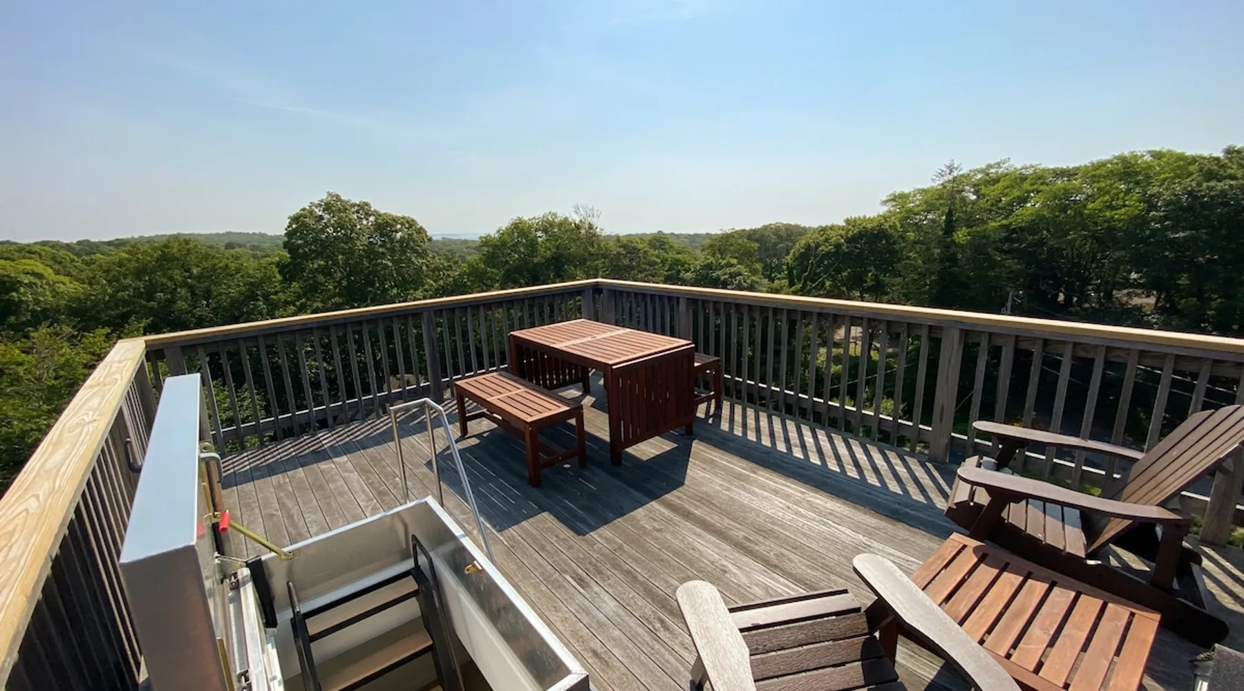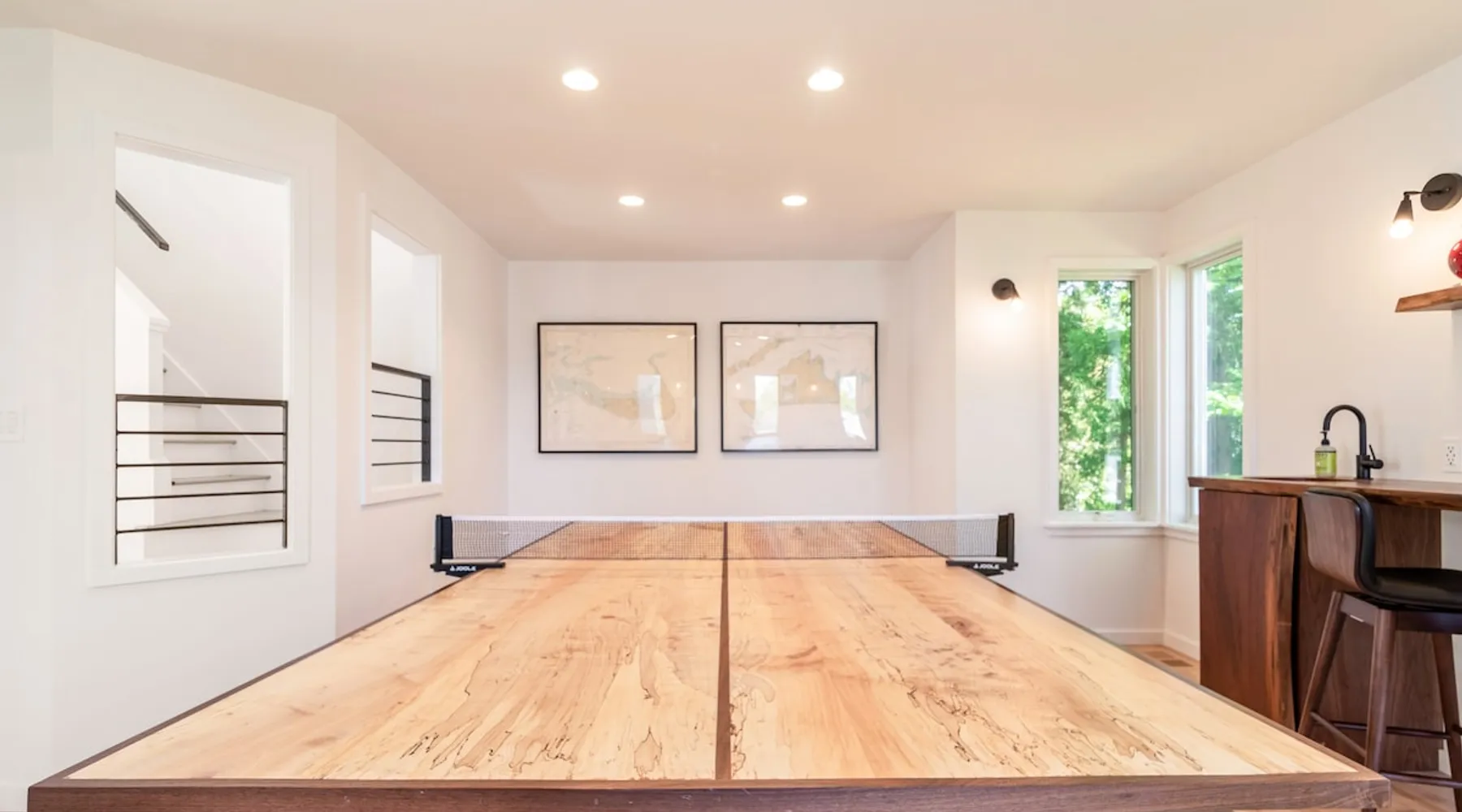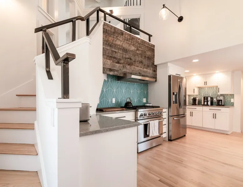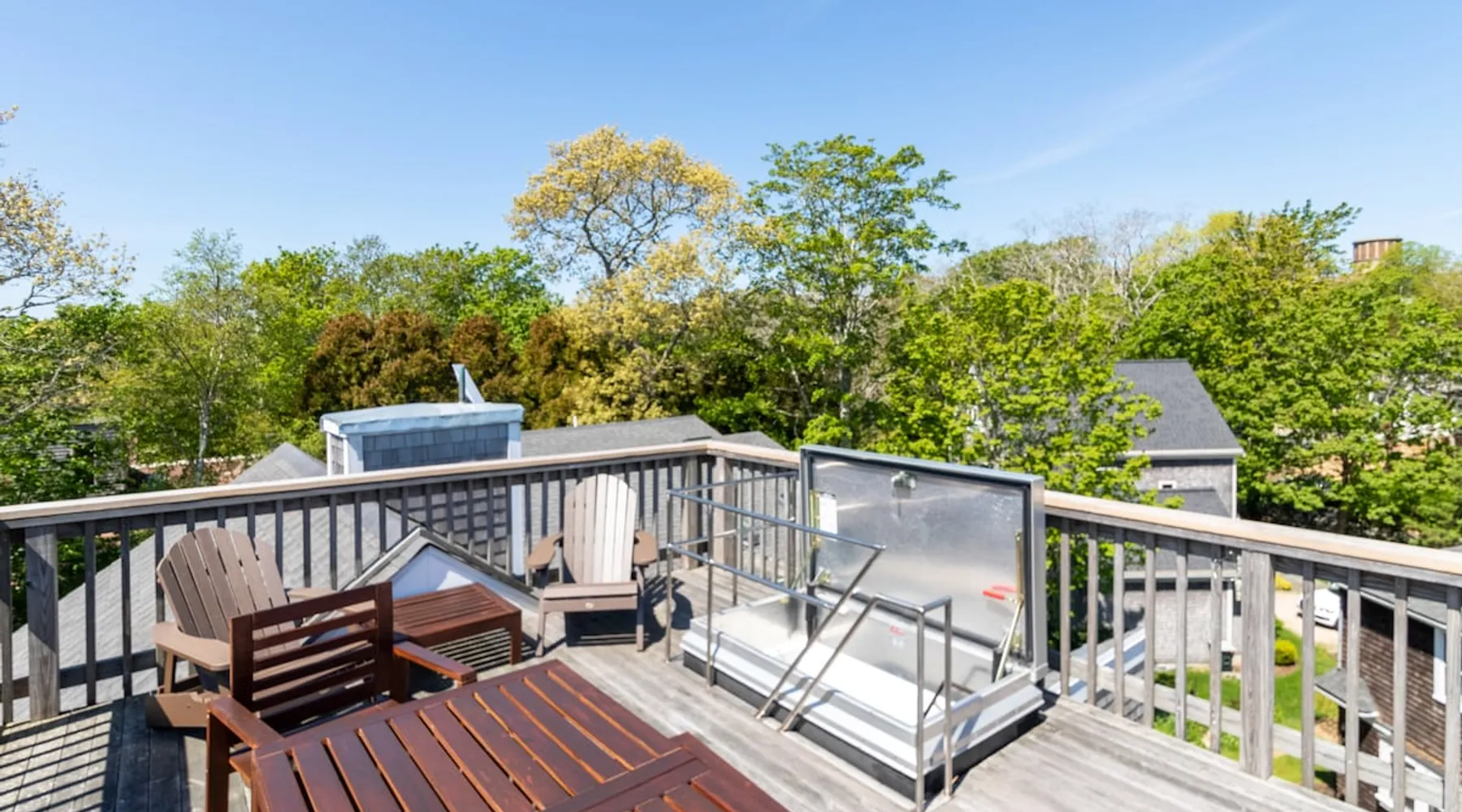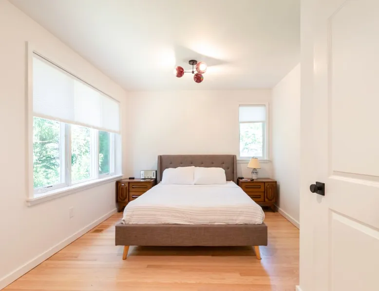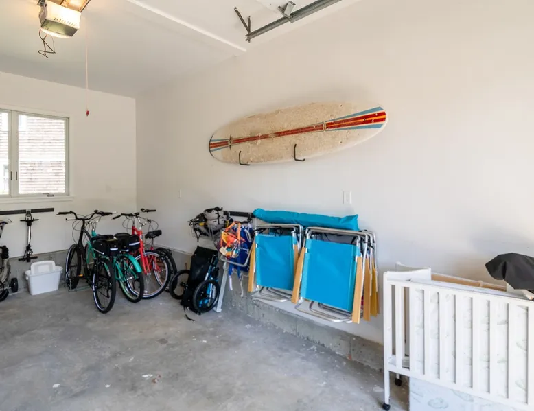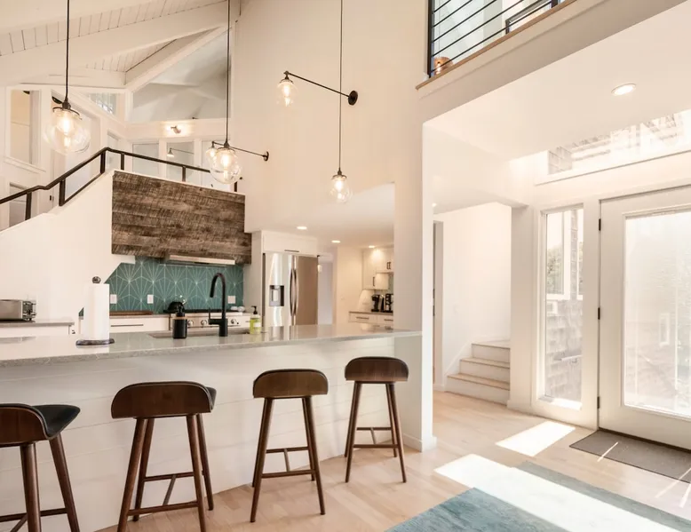 Beautiful modern masterpiece down a quiet street with quick access to Woods Hole, Shining Sea Bikeway, and the Vineyard ferry. This architecturally significant house was designed by the renowned postmodern architect Charles Moore and built in 1969. An addition providing ample entertaining space - including a dining room, den, loft, and roof deck - was completed in 2021, along with top to bottom refinishing of all rooms. This house has mid-century charm in spades with all the modern conveniences. The space The house offers 4 bedrooms each with a queen bed and private full bathroom, and each on its own level that provides ample privacy for those sharing this impressive house. The entrance opens into a foyer adjacent to an open concept kitchen with peninsula seating for 4. Continuing to the back of the house is a large dining room with a wet bar and custom designed dining table that comfortably seats 10, and can also function as a ping pong table (net, paddles, and balls provided!). Also on the main level is a full bathroom with shower stall, a laundry closet with washer and dryer, and the first bedroom. Adjacent to the main entrance, and three steps down, is a large bedroom with an en suite with shower/tub. Back in the kitchen, and past the coffee bar - complete with espresso machine, drip, and Keurig - is another bedroom that is down one flight and is adjacent to another full bath with shower stall. The master bedroom is found upstairs, part of a 4 room suite that includes a sitting room with desk and loveseat, designer bathroom, and a built-in twin sized day bed - perfect for younger ones. Three staircases lead to the second floor (also a catwalk away from the upstairs bedroom) which offers plenty of room for your group to spread out: whether it’s reading a book at the cozy living room window seat while listening to the console record player, catching up on your streaming in the den, playing a game in the breakfast room, finishing a puzzle in the loft which includes a futon couch (up a spiral stair), or enjoying the roof deck (accessible via ship’s ladder) with panoramic views of Martha’s vineyard and surrounding waters. Adjacent to the den are bookcases full of games and books for your enjoyment, and a powder room. Additional outdoor space is off the main entrance: a lit peastone patio with outdoor table seating for 4 and a pair of Adirondack chairs to relax in. An outdoor shower rounds out the exterior amenities. The house is equipped with three zone central air conditioning, 4K streaming Roku TVs in each bedroom, high speed internet, and a fully equipped kitchen that includes microwave, dishwasher, and 5 burner gas range. An outdoor 50 amp outlet is available for charging your electric vehicle. Guest access The neighborhood is quiet with minimal street traffic, but provides quick and easy access to all that you want from your Cape vacation: a 4 minute walk (0.2 miles) to the Shining Sea Bikeway, 10 minute walk (0.5 miles) to downtown Woods Hole, 12 minute walk (0.6 miles) to the Martha’s Vineyard Ferry, a 7 minute bike ride to Surf Drive beach via the Bikeway, and a 7 minute drive to downtown Falmouth. Other things to note The house, the common areas, and bedrooms are split on several levels with many stairs leading between, and may not be optimal for young children or those with limited mobility.