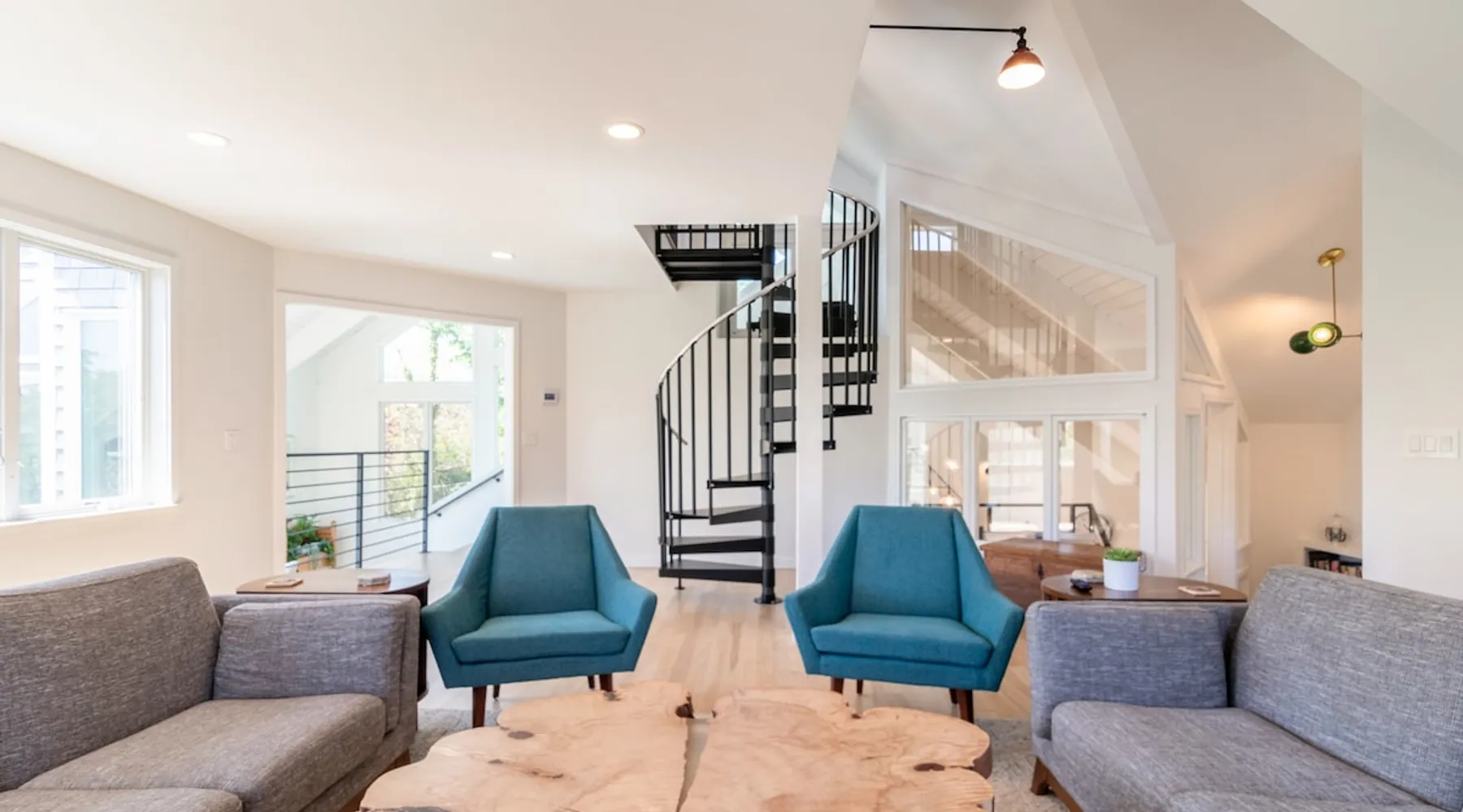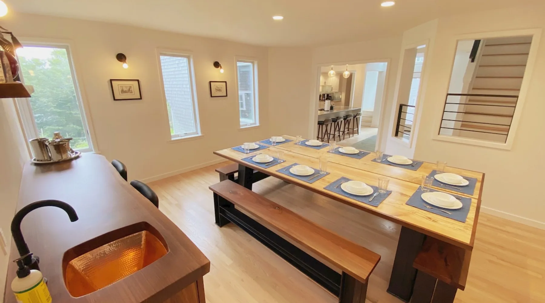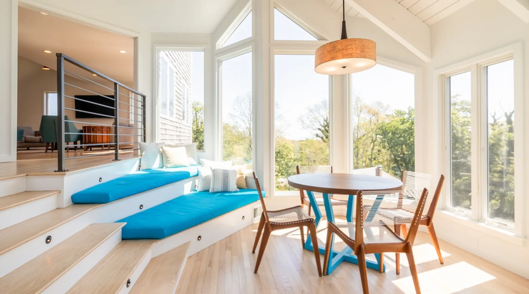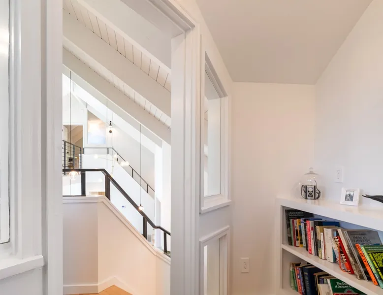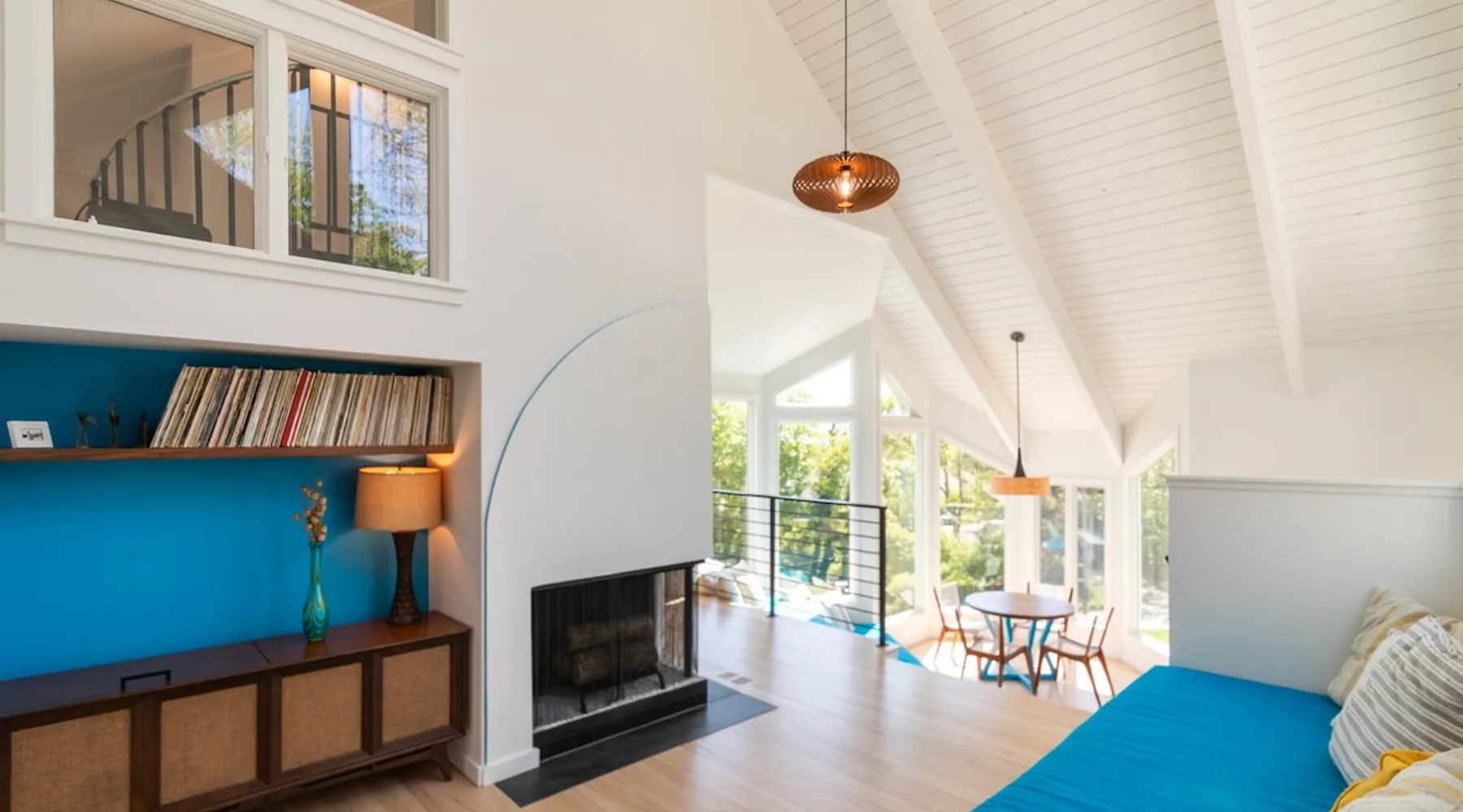 Beautiful modern masterpiece down a quiet street with quick access to Woods Hole, Shining Sea Bikeway, and the Vineyard ferry. This architecturally significant house was designed by the renowned postmodern architect Charles Moore and built in 1969. An addition providing ample entertaining space - including a dining room, den, loft, and roof deck - was completed in 2021, along with top to bottom refinishing of all rooms. This house has mid-century charm in spades with all the modern conveniences. The space The house offers 4 bedrooms each with a queen bed and private full bathroom, and each on its own level that provides ample privacy for those sharing this impressive house. The entrance opens into a foyer adjacent to an open concept kitchen with peninsula seating for 4. Continuing to the back of the house is a large dining room with a wet bar and custom designed dining table that comfortably seats 10, and can also function as a ping pong table (net, paddles, and balls provided!). Also on the main level is a full bathroom with shower stall, a laundry closet with washer and dryer, and the first bedroom. Adjacent to the main entrance, and three steps down, is a large bedroom with an en suite with shower/tub. Back in the kitchen, and past the coffee bar - complete with espresso machine, drip, and Keurig - is another bedroom that is down one flight and is adjacent to another full bath with shower stall. The master bedroom is found upstairs, part of a 4 room suite that includes a sitting room with desk and loveseat, designer bathroom, and a built-in twin sized day bed - perfect for younger ones. Three staircases lead to the second floor (also a catwalk away from the upstairs bedroom) which offers plenty of room for your group to spread out: whether it’s reading a book at the cozy living room window seat while listening to the console record player, catching up on your streaming in the den, playing a game in the breakfast room, finishing a puzzle in the loft which includes a futon couch (up a spiral stair), or enjoying the roof deck (accessible via ship’s ladder) with panoramic views of Martha’s vineyard and surrounding waters. Adjacent to the den are bookcases full of games and books for your enjoyment, and a powder room. Additional outdoor space is off the main entrance: a lit peastone patio with outdoor table seating for 4 and a pair of Adirondack chairs to relax in. An outdoor shower rounds out the exterior amenities. The house is equipped with three zone central air conditioning, 4K streaming Roku TVs in each bedroom, high speed internet, and a fully equipped kitchen that includes microwave, dishwasher, and 5 burner gas range. An outdoor 50 amp outlet is available for charging your electric vehicle. Guest access The neighborhood is quiet with minimal street traffic, but provides quick and easy access to all that you want from your Cape vacation: a 4 minute walk (0.2 miles) to the Shining Sea Bikeway, 10 minute walk (0.5 miles) to downtown Woods Hole, 12 minute walk (0.6 miles) to the Martha’s Vineyard Ferry, a 7 minute bike ride to Surf Drive beach via the Bikeway, and a 7 minute drive to downtown Falmouth. Other things to note The house, the common areas, and bedrooms are split on several levels with many stairs leading between, and may not be optimal for young children or those with limited mobility.