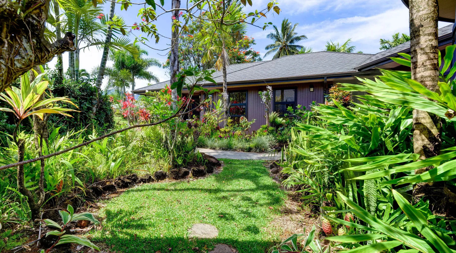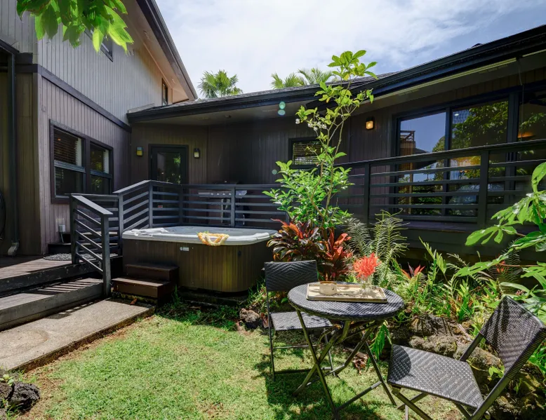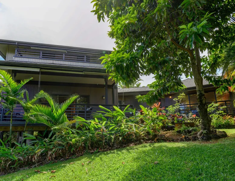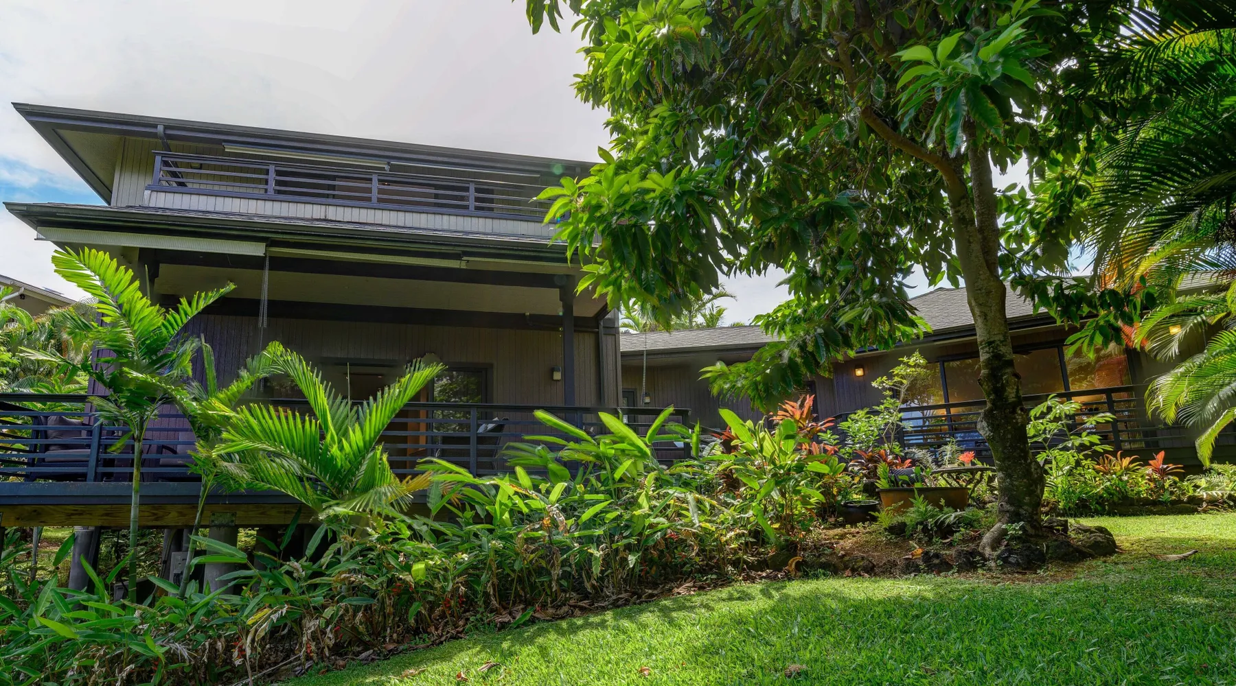 Rich Brazilian cherry wood flooring mixed with natural stone tiles throughout the kitchen, entry foyer, and bathrooms. Ipe wood decking on the exterior lanais intertwine with the inside living space seamlessly, thus extending the interior into a doorway to natures fruitful offerings outside. The semi-circular kitchen has a copper patina artisan metal roof. The landscaping features an incredibly well-balanced selection of varied tropical foliage. Splendid views of mountains, ocean (distant) and Bali Hai from upper level master suite. When the surf's up, you can hear the waves break. Separate Guest Wing provides privacy from the upstairs suite. Large 2nd floor master suite enjoys Hanalei Bay and Bali Hai views, separate shower, whirlpool tub and wet bar. Both guest rooms have their own ensuite bathroom. Overall style is contemporary with Hawaiian flair, a colorful palate and open angle floor plan. Jacuzzi on the backyard deck is the place to relax and enjoy the peaceful setting at days end. Three bedrooms are comfortably separated within the 2,940 square-foot living space, each with a king bed and their own private, full bathroom. Split air conditioning units are located in each bedroom and the main living room. Hawaii Life Rentals is a locally owned, licensed real estate company with rentals on Kauai, Maui, Oahu, and Hawaii. We offer on-island personal assistance and Concierge services. Rates do not include taxes, cleaning and applicable fees. Hawaii Life/VRBO bookings: Guests must sign a rental contract within 48 hours of booking to confirm the reservation. TA-030-453-7600-01 TMK