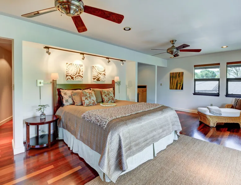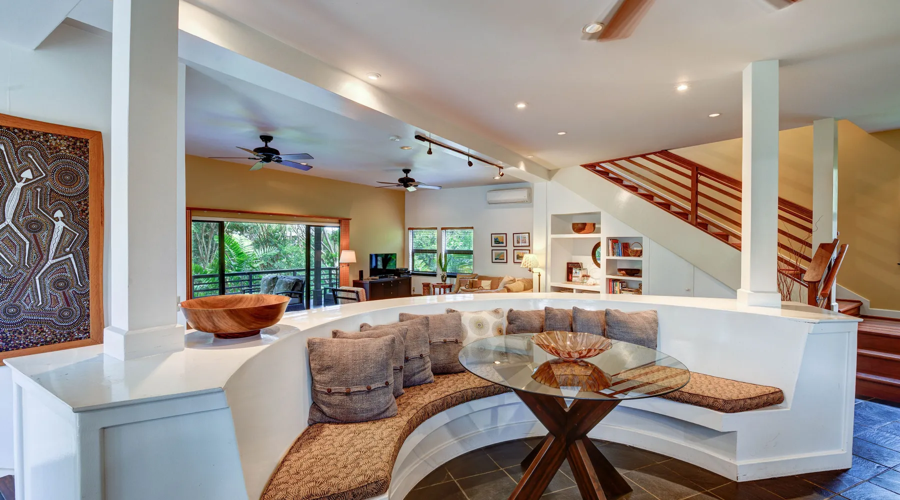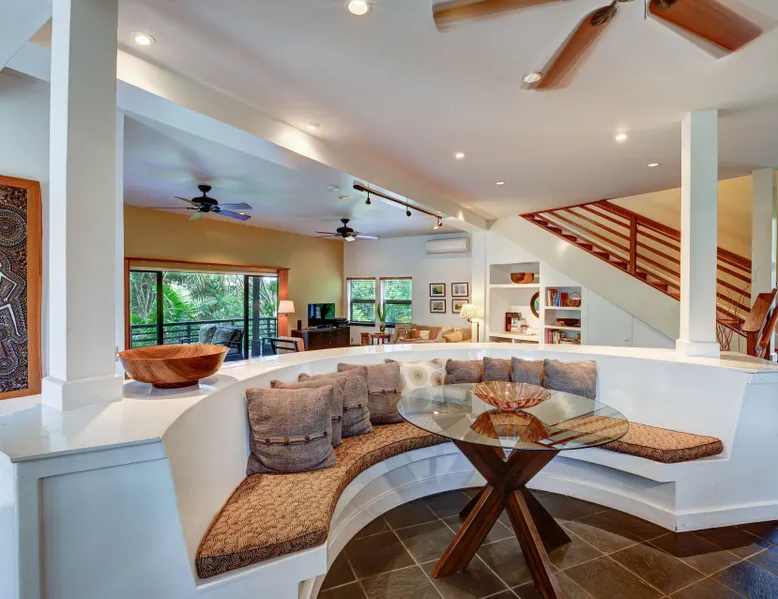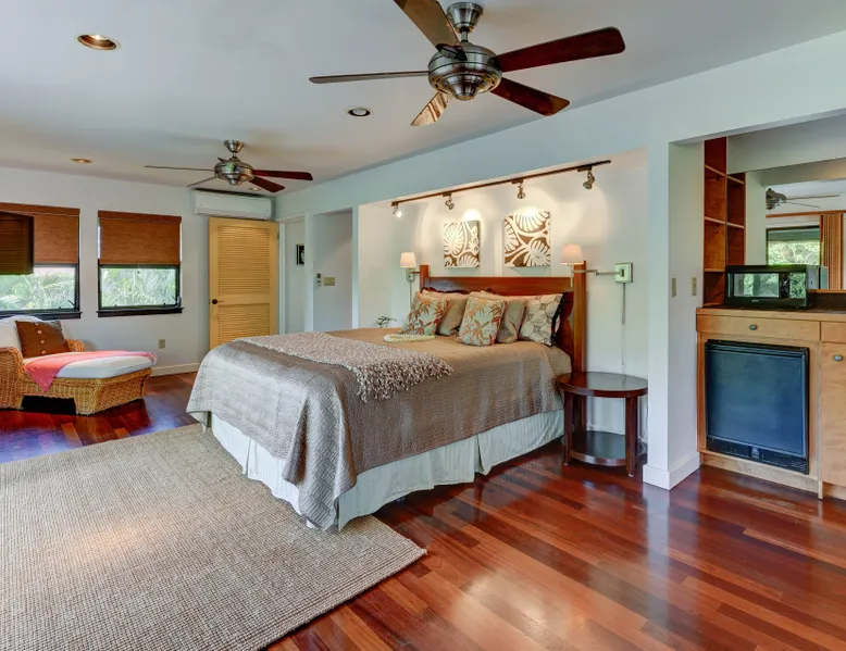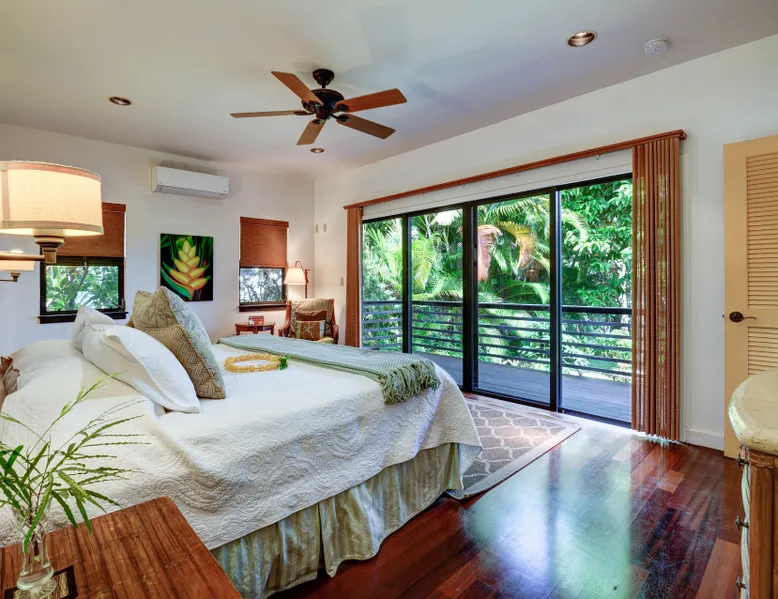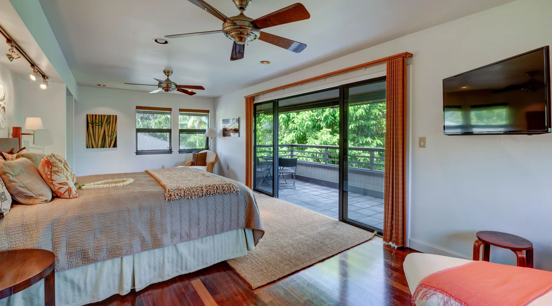 Rich Brazilian cherry wood flooring mixed with natural stone tiles throughout the kitchen, entry foyer, and bathrooms. Ipe wood decking on the exterior lanais intertwine with the inside living space seamlessly, thus extending the interior into a doorway to natures fruitful offerings outside. The semi-circular kitchen has a copper patina artisan metal roof. The landscaping features an incredibly well-balanced selection of varied tropical foliage. Splendid views of mountains, ocean (distant) and Bali Hai from upper level master suite. When the surf's up, you can hear the waves break. Separate Guest Wing provides privacy from the upstairs suite. Large 2nd floor master suite enjoys Hanalei Bay and Bali Hai views, separate shower, whirlpool tub and wet bar. Both guest rooms have their own ensuite bathroom. Overall style is contemporary with Hawaiian flair, a colorful palate and open angle floor plan. Jacuzzi on the backyard deck is the place to relax and enjoy the peaceful setting at days end. Three bedrooms are comfortably separated within the 2,940 square-foot living space, each with a king bed and their own private, full bathroom. Split air conditioning units are located in each bedroom and the main living room. Hawaii Life Rentals is a locally owned, licensed real estate company with rentals on Kauai, Maui, Oahu, and Hawaii. We offer on-island personal assistance and Concierge services. Rates do not include taxes, cleaning and applicable fees. Hawaii Life/VRBO bookings: Guests must sign a rental contract within 48 hours of booking to confirm the reservation. TA-030-453-7600-01 TMK