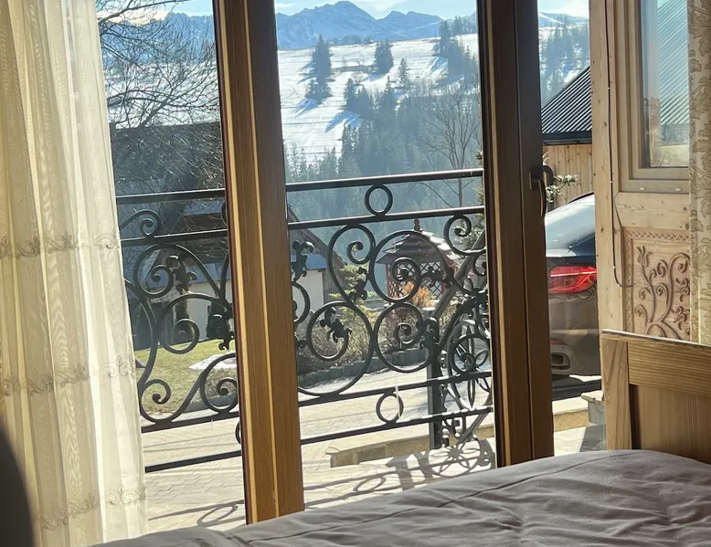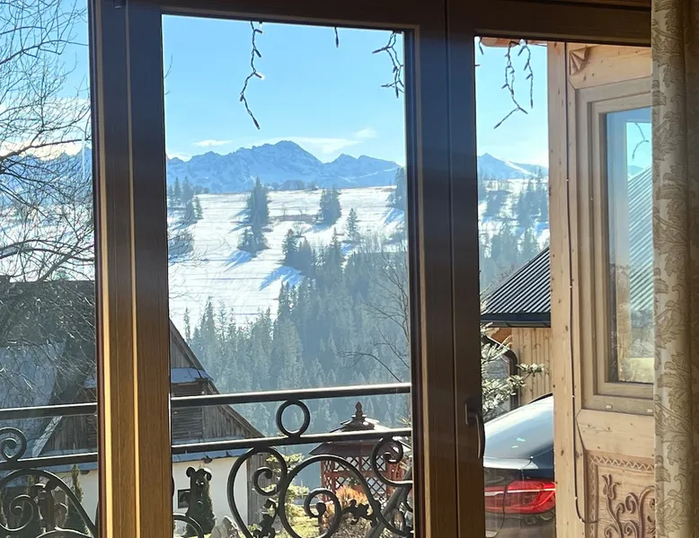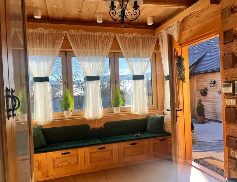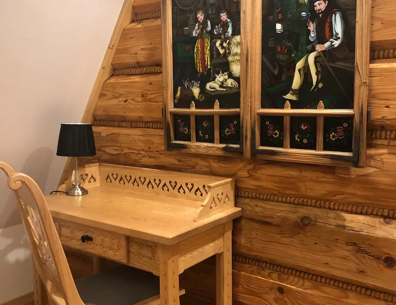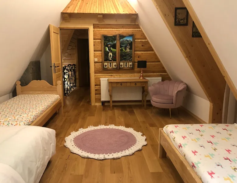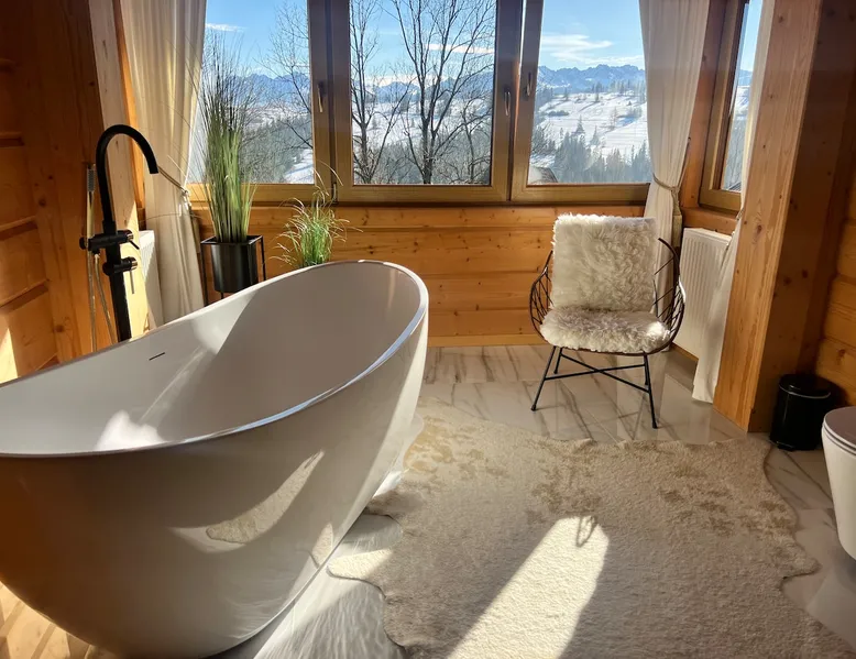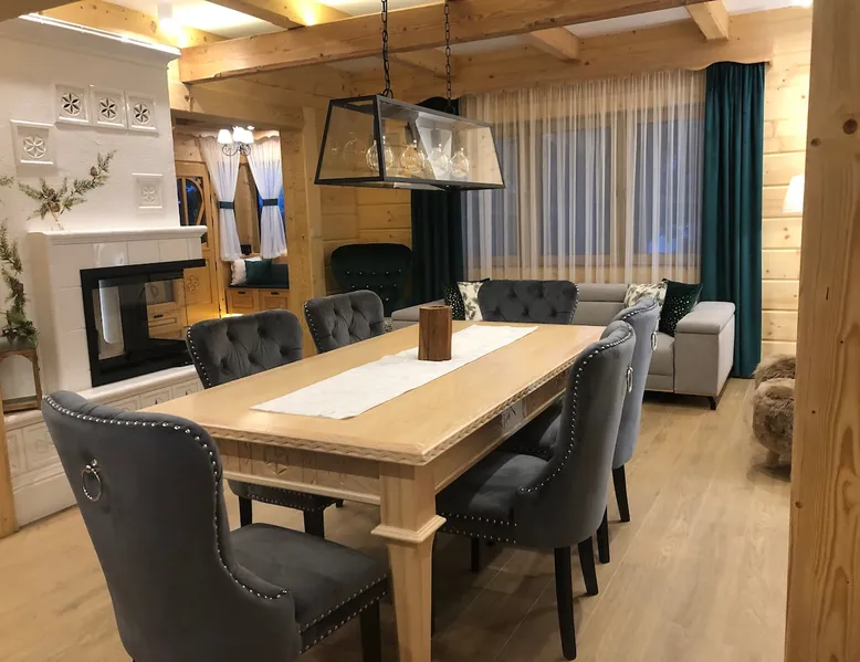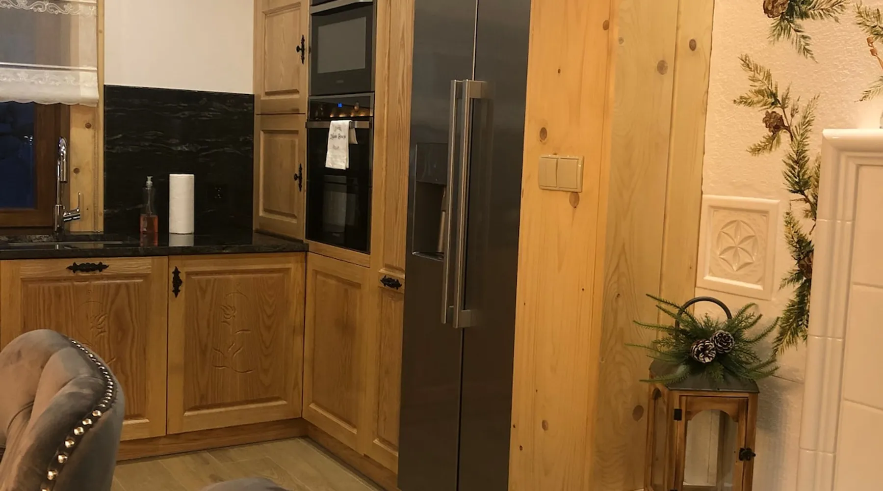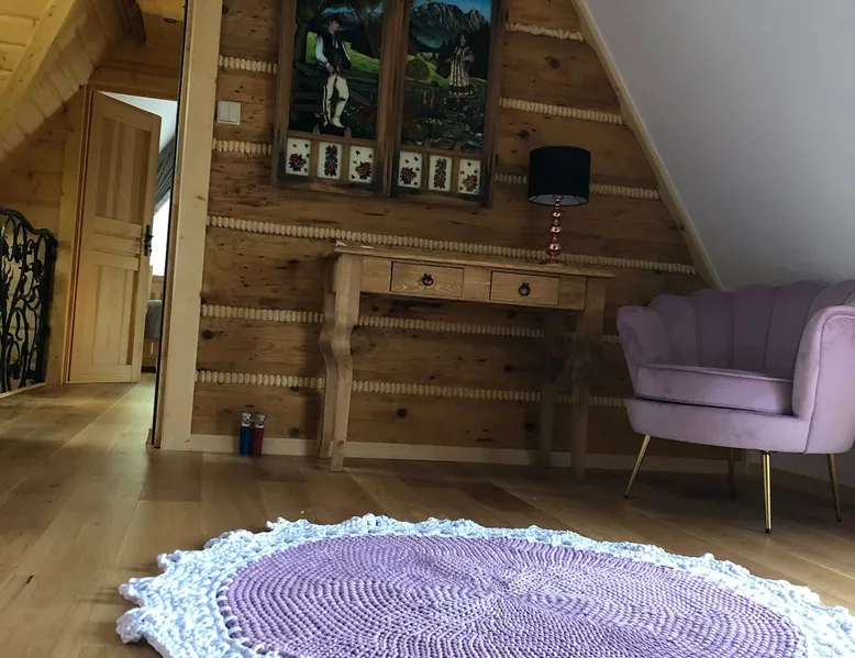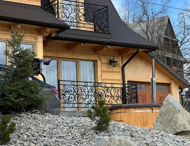 Rancho Zalinski is a wooden highlander house located just 10 km from the famous Zakopane - the winter capital of the Tatras. Rancho Zaliński is located in a quiet and intimate corner of Podhale. It is a 20th-century highlander house built of amphibians, with preserved decorative motifs from the previous century, richly decorated with carved and forged elements. The house has a tiled fireplace and a wood-fired tub. If you like the idyllic atmosphere surrounded by nature, you will definitely like the Ranch. The space Rancho Zaliński is located in Bustryk in Podhale. It is a region of Skalny Podhale characterized by a unique and very interesting culture, art, and above all folklore, which is a treasure, a showcase and a tourist attraction. All this makes a holiday at the foot of the Tatras in this beautiful corner of Podhale with a view of the mountains, near hiking and cycling trails, thermal water pools, and surrounded by mountain nature, ideal both in winter and summer. Rancho Zalinski is a stylish house of a highlander family from the beginning of the 20th century, built of wood, with a fireplace with white tiles, an outdoor wood-fired tub (extra charge), and a view of the Tatra Mountains. The house has 3 beautifully decorated bedrooms, each in a unique style, and 2 luxurious bathrooms, 1 of which has a free-standing bathtub. The kitchen is equipped with a dishwasher, oven, microwave, fridge-freezer with ice maker. The dining room has a large folding table. Guest access Parking is available on the fenced property of Rancho Zaliński. In winter, in the event of heavy snowfall, it may not be possible to drive to the house. In this situation, we provide free parking on the main road (about 150 m from the house). Other things to note Package is charged extra according to the price list. Please review the rules. The use of the tub is tantamount to accepting the rules. Please let us know at least 6 hours in advance if you wish to use the hot tub. Please let us know your approximate check-in time when you book, and contact the property one hour before you arrive to exchange keys.